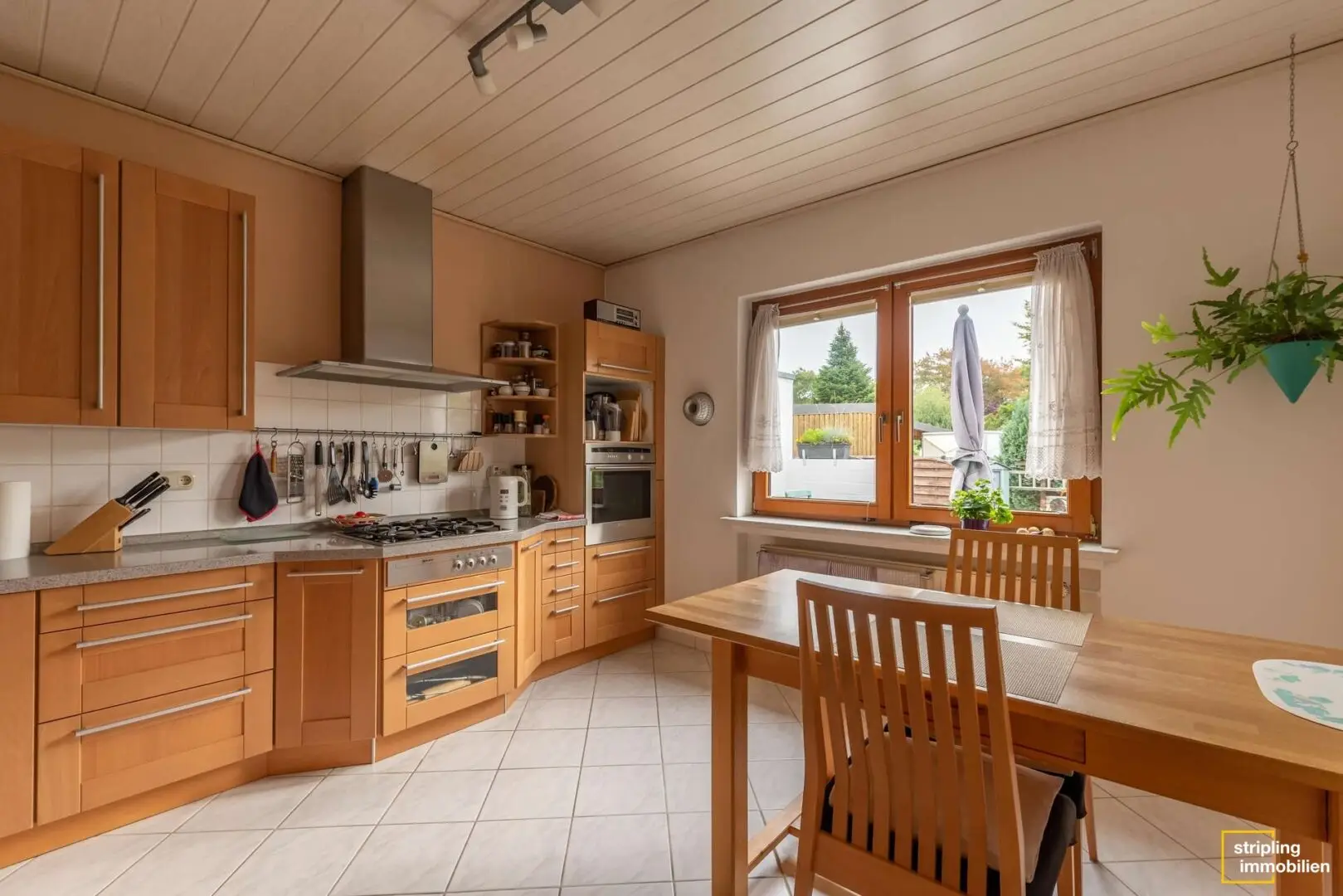 Auch von der Küche aus haben Sie eine Sicht auf den Garten, denn das Fenster zeigt in diese Richtung. Sie erreichen die Küche durch den Flur. Sie liegt links vom Wohnzimmer und enthält eine Einbauküche aus dem Jahr 2002 in sehr gutem Zustand. Hier ist ausreichend Platz für einen kleineren Esstisch, sodass Sie zwischendurch auch in der Küche Ihre Mahlzeiten einnehmen können.