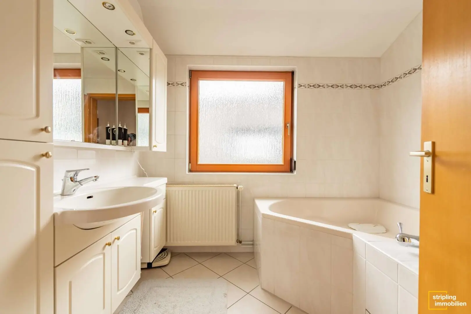 Ebenfalls im Erdgeschoss befindet sich eines der Badezimmer mitsamt Badewanne, Waschbecken, WC und Abstellplatz. Zurück im Flur gehen Sie wieder in Richtung Eingangstür und nehmen im Windfangbereich die Treppe nach oben. Die erste Tür links führt in das Badezimmer mit Badewanne, Dusche und Waschbecken. Dahinter befindet sich ein separates WC mit Waschbecken, was sehr praktisch ist, wenn sich morgens die ganze Familie auf einmal auf den Tag vorbereitet.