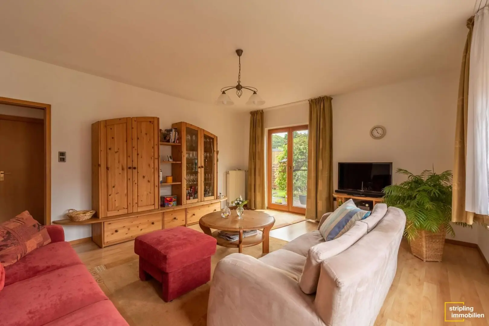 Hinter dem Esszimmer folgt das Wohnzimmer, das ebenfalls ab dem Flur zugänglich ist. Es bietet direkten Zugang zur Terrasse und hat ein weiteres Fenster, sodass Sie sich hier auf viel Licht freuen dürfen. Sie haben einen schönen Blick auf den Garten. Außerdem ist viel Raum für eine gemütliche Sitzecke, einen Bildschirm sowie Bücherregale und einen Schrank vorhanden.