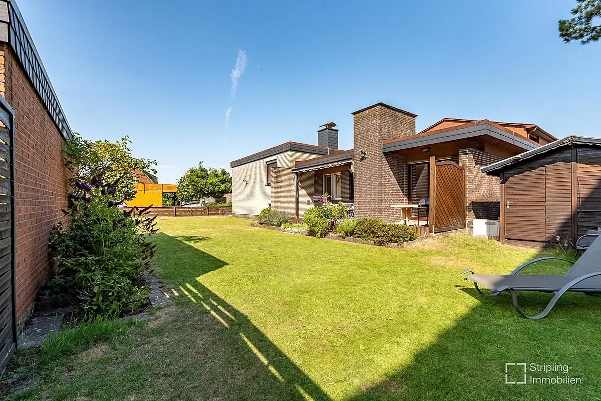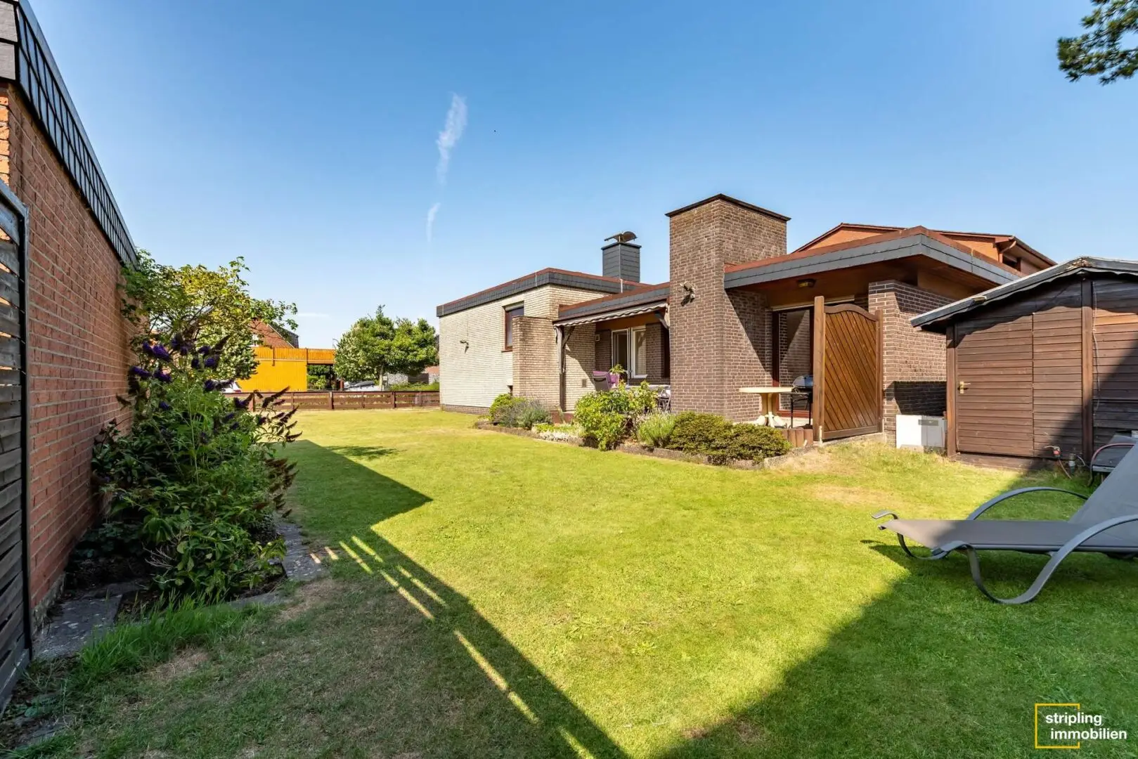 Neben der geräumigen Wohnfläche überzeugt der Bungalow mit einem herrlichen Gartenbereich mit schöner Rasenfläche und ansprechend angelegten Beeten. Ein Mähroboter nimmt Ihnen schon einen Großteil der Gartenarbeit ab. Die Terrasse fügt sich in den umzäunten Garten ein und lädt zum Entspannen ein – entweder im Liegestuhl oder vielleicht lieber im Whirlpool? Er würde hier jedenfalls ein hübsches Plätzchen finden. Im kleinen Gartenhaus bringen Sie Geräte, Spielsachen und Gartenwerkzeug unter und auf der breiten, gepflasterten Auffahrt parken bis zu zwei Fahrzeuge vor der Garage.