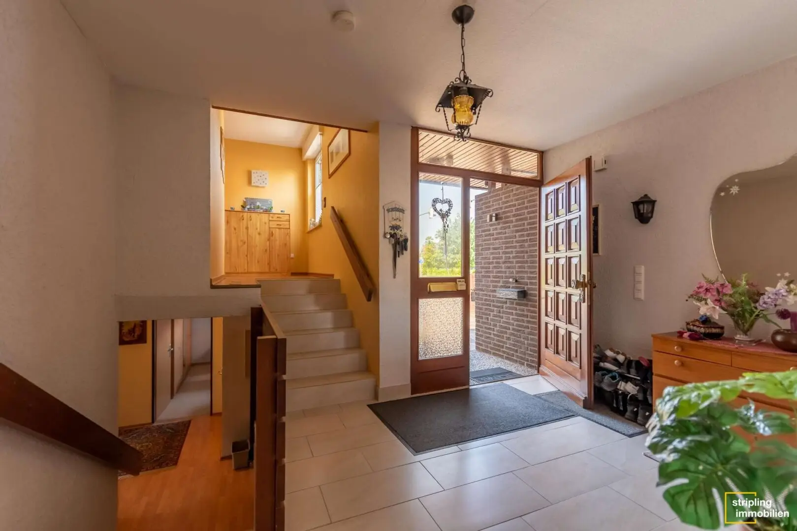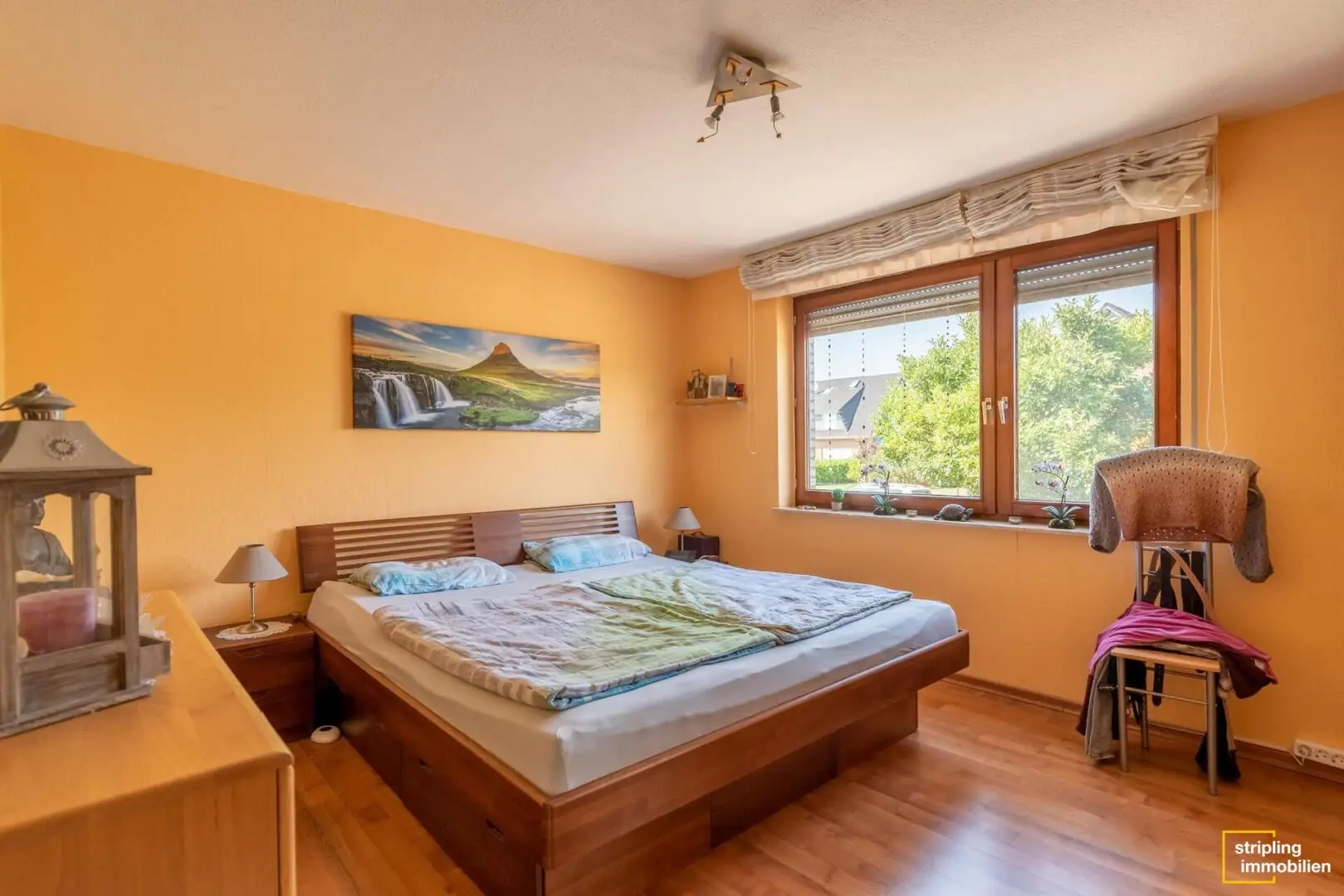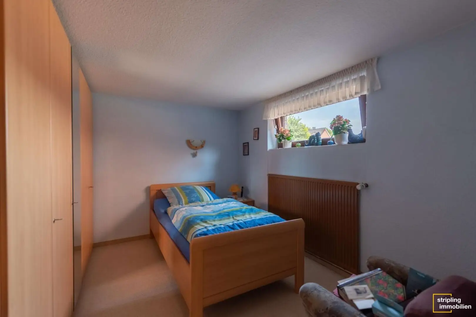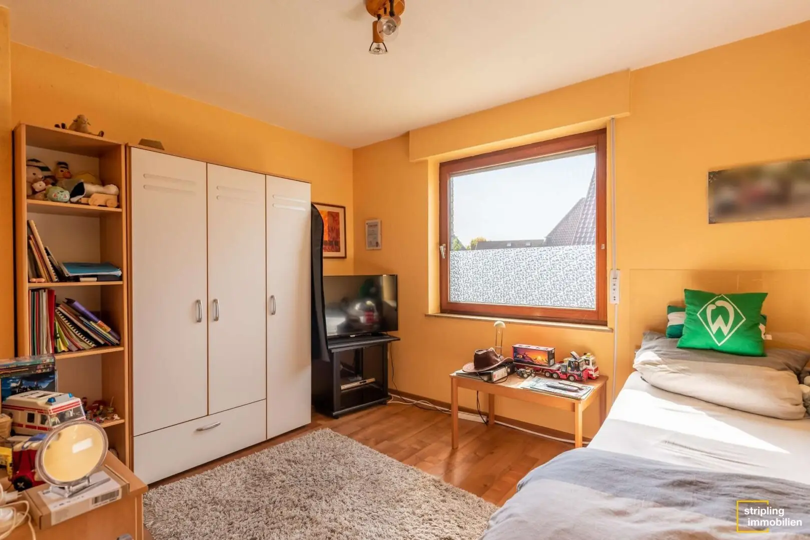 Vom Erdgeschoss aus führen wenige Stufen jeweils eine Halbetage nach oben und nach unten. Im oberen Geschoss liegen drei ansprechende Schlafräume und das Badezimmer mit Dusche und Wanne. Zwei der Zimmer sind als Kinderzimmer prädestiniert, könnten aber auch für ein Homeoffice oder als Gästeunterkunft verwendet werden. Sie sind großzügig geschnitten und hell – darin fühlt sich jeder Bewohner wohl. Das Hauptschlafzimmer liegt nach Norden, was es im Sommer angenehm kühl macht, und es hat eine schöne Größe.