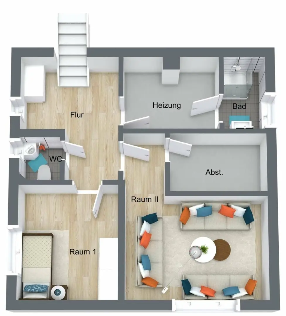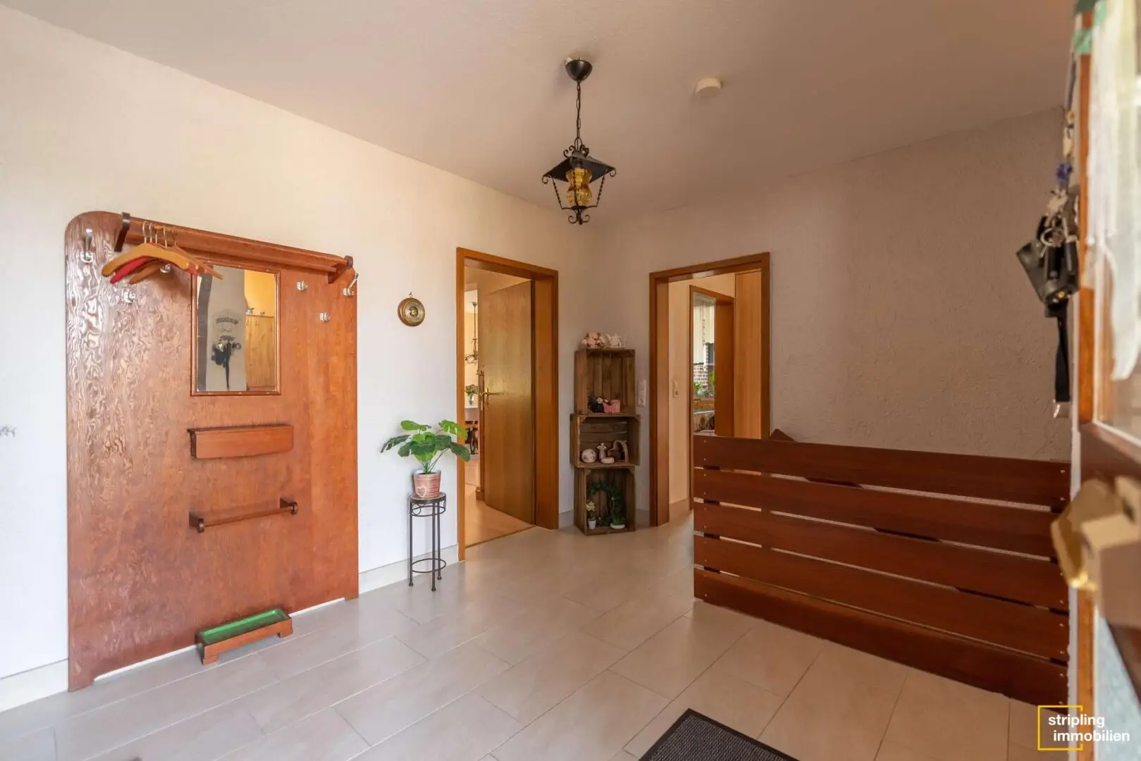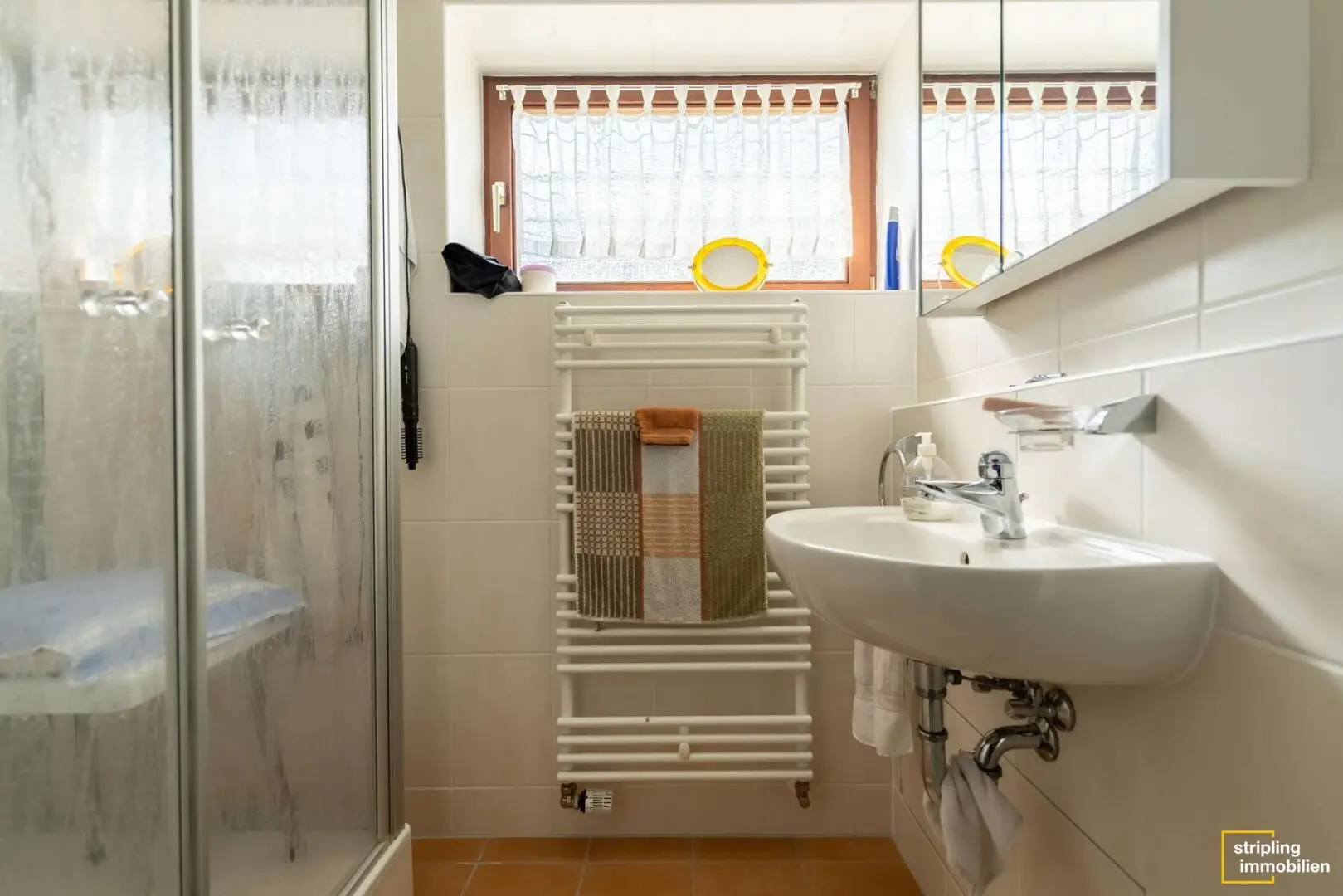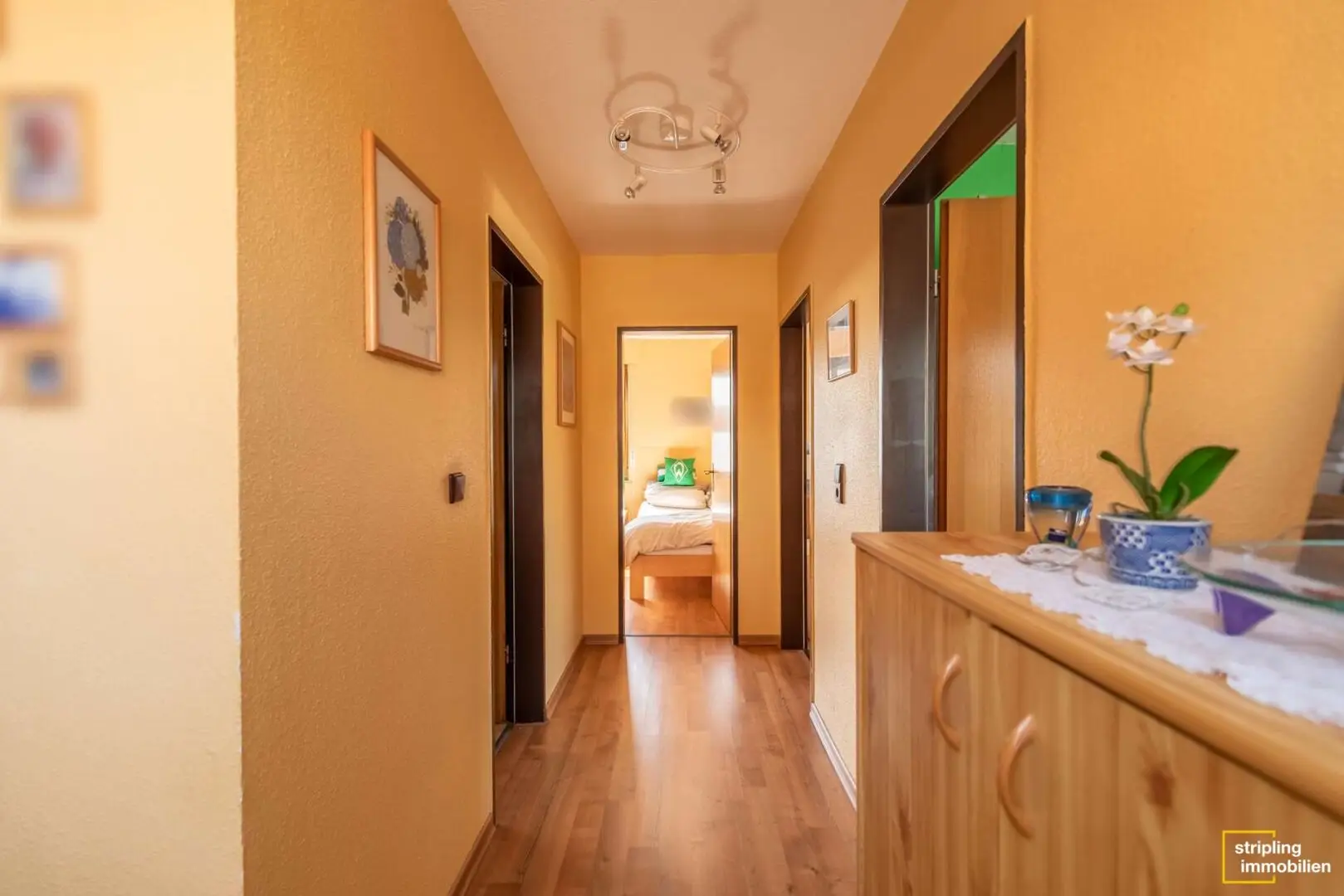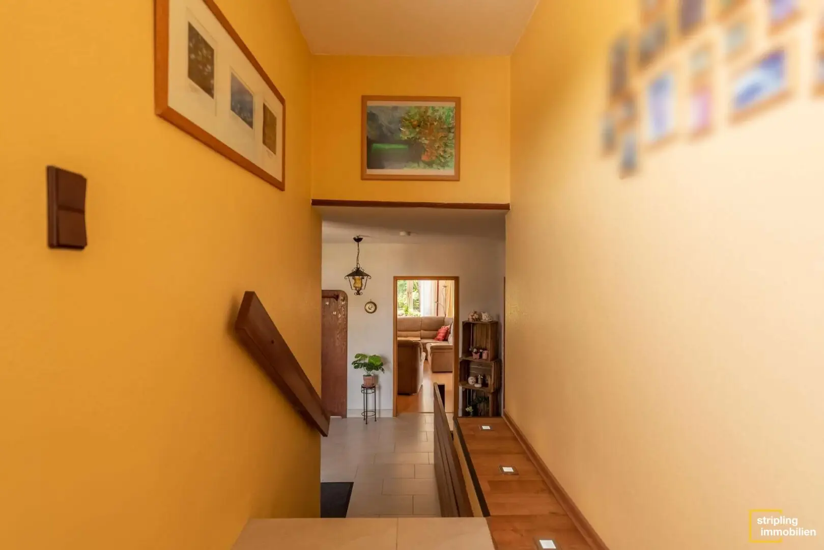 Vom Erdgeschoss aus führen wenige Stufen jeweils eine Halbetage nach oben und nach unten. Im oberen Geschoss liegen drei ansprechende Schlafräume und das Badezimmer mit Dusche und Wanne. Zwei der Zimmer sind als Kinderzimmer prädestiniert, könnten aber auch für ein Homeoffice oder als Gästeunterkunft verwendet werden. Sie sind großzügig geschnitten und hell – darin fühlt sich jeder Bewohner wohl. Das Hauptschlafzimmer liegt nach Norden, was es im Sommer angenehm kühl macht, und es hat eine schöne Größe.