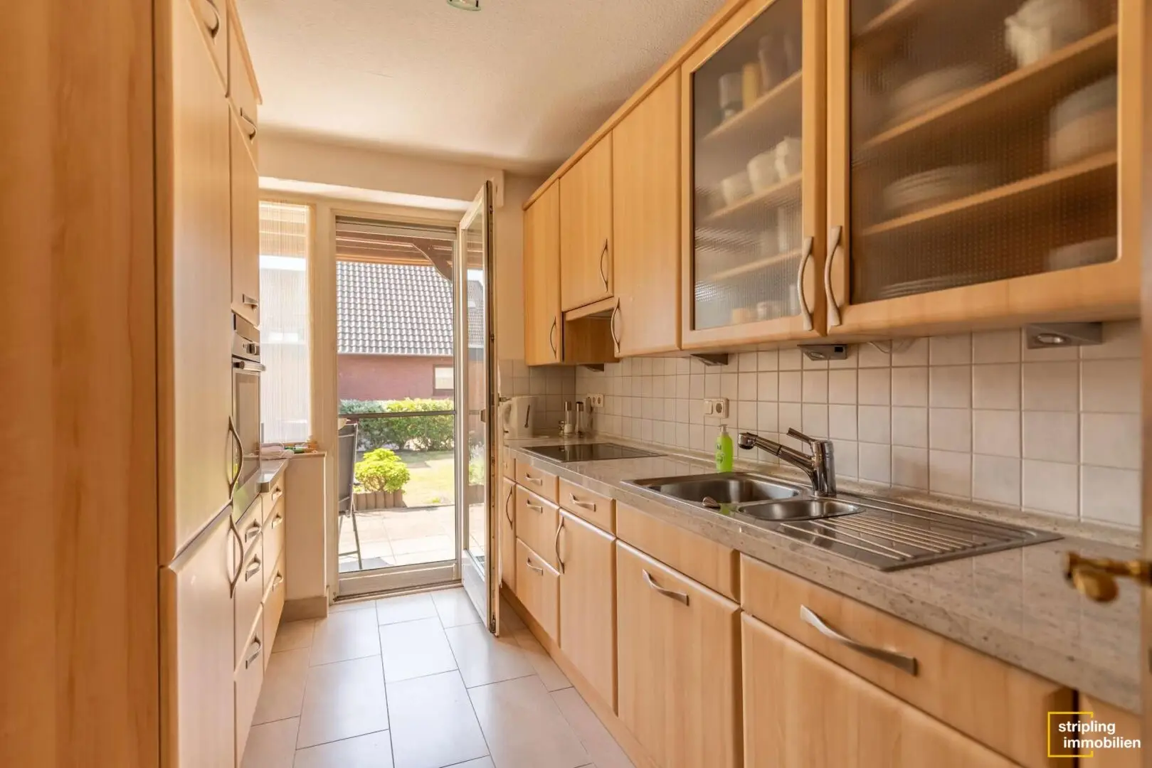 Gleich nebenan liegt die Küche. Sie ist räumlich vom Wohn-Ess-Ensemble getrennt, damit die Gerüche nicht das ganze Erdgeschoss fluten. Trotzdem ist der Raum von allen Seiten leicht zugänglich und besitzt einen eigenen Ausgang inklusive Mückenschutztür zu Garten und Terrasse. Die Einbauküche ist hochwertig, in holzfarbenem Dekor gehalten und Vitrinenschränke lockern das Gesamtbild auf. Mühelos zaubern Sie hier Leckereien für Familie und Gäste.