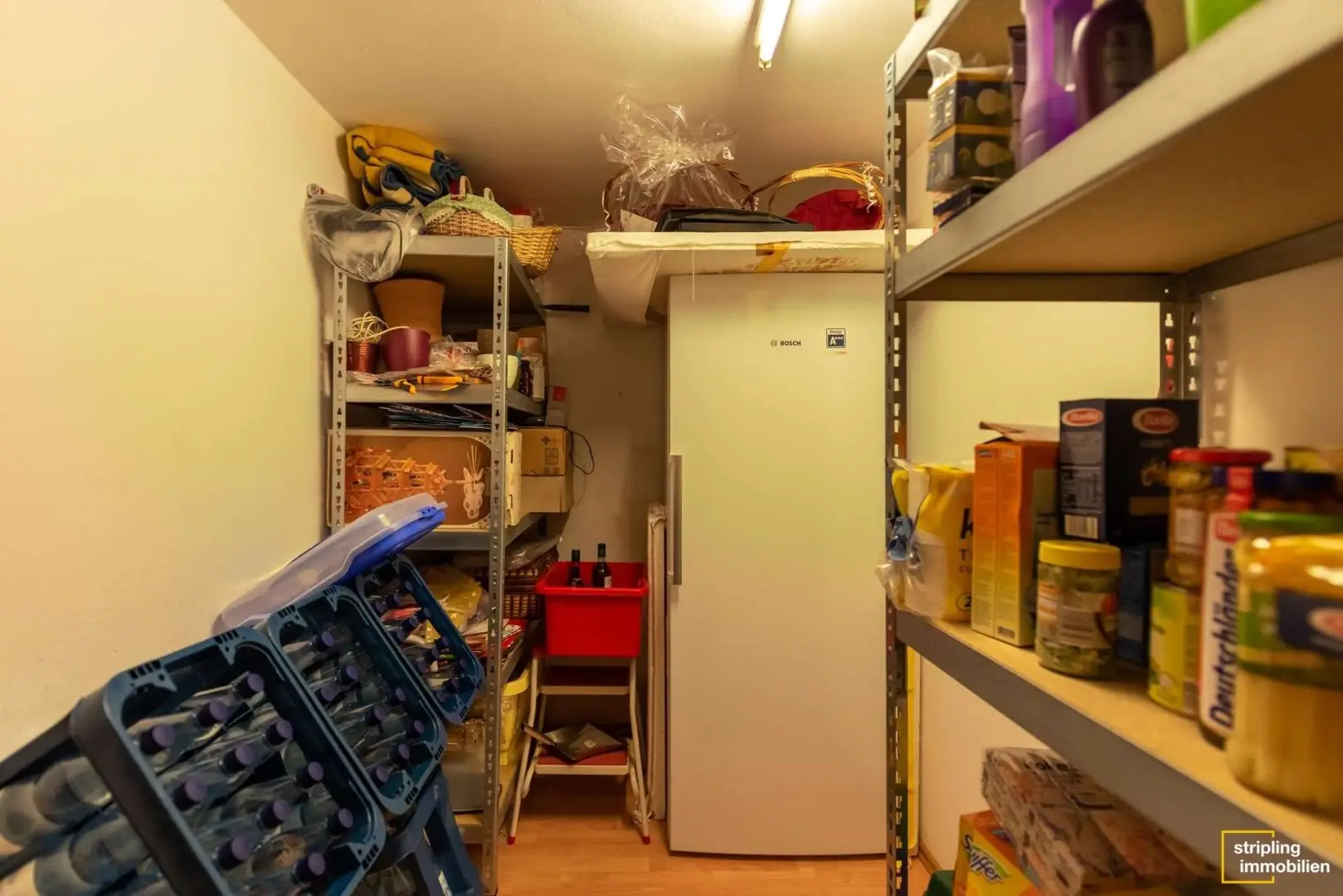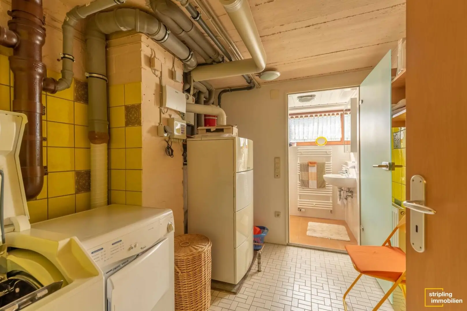 Im unteren Geschoss befindet sich der Keller des Hauses, der bereits wohnlich ausgebaut wurde, aber nicht zur Wohnfläche zählt. Die Kellerfenster liegen über dem Erdboden und bringen Helligkeit in die beiden Räume, die sich perfekt für ein Hobby, ein separates Fernsehzimmer oder eine Werkstatt eignen. Außerdem gibt es hier unten einen Hauswirtschaftsraum, einen Vorratskeller und ein Gäste-WC mit Dusche.