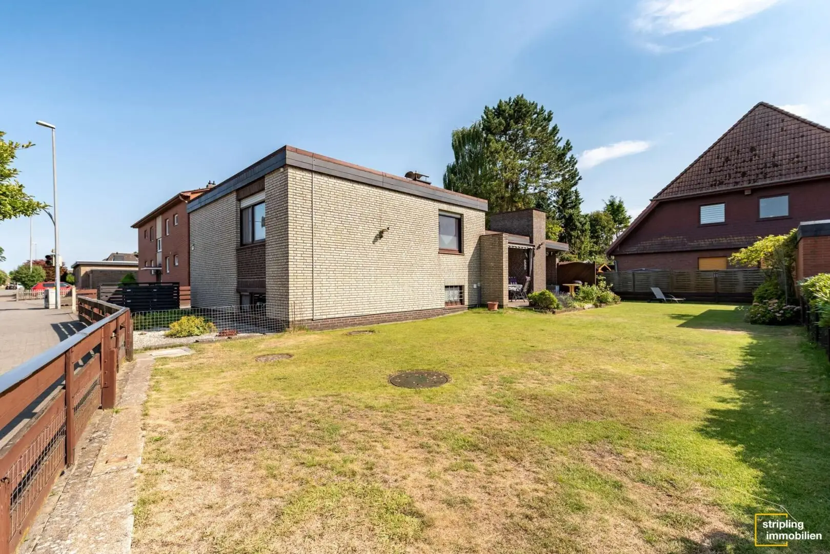 In Ganderkesee wartet ein Flachdachbungalow mit ca. 119,72 m² Wohnfläche auf seine neuen Bewohner. Der außergewöhnliche Entwurf schafft drei Ebenen, die jeweils über ein halbes Geschoss voneinander getrennt sind. Dadurch entsteht eine weiträumige Architektur, die frisch und offen wirkt. Im Erdgeschoss befindet sich der Wohnbereich, in dem das Leben der Familie stattfindet. Gleich nach der Tür öffnet sich ein Raum, der sich schon fast Eingangshalle nennen lässt. Helle Fliesen sorgen für ein strahlendes, freundliches Ambiente. Egal, wie viele Schulfreunde ihr Kind nach Hause bringt, hier finden alle Schuhe und Jacken mühelos Platz.