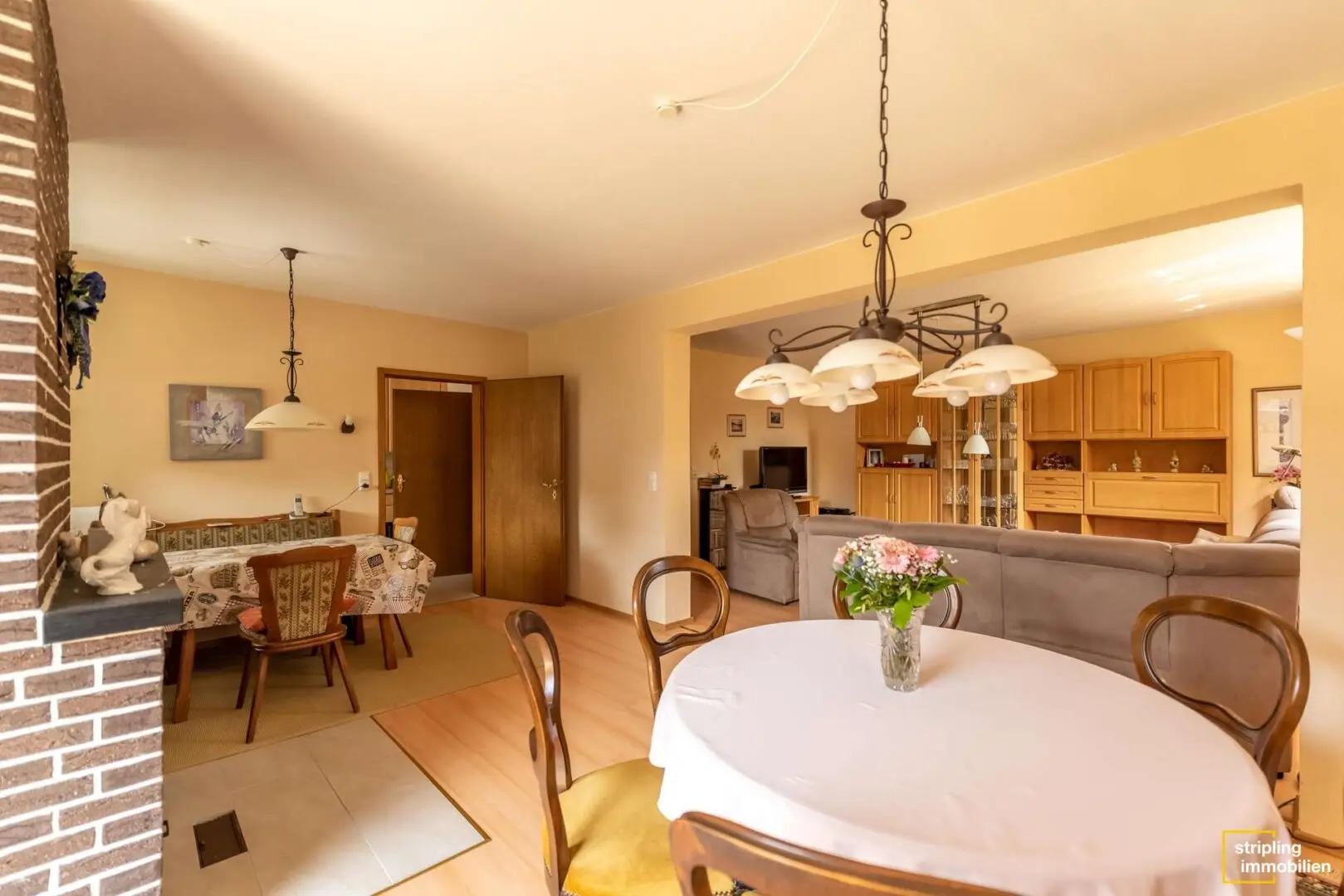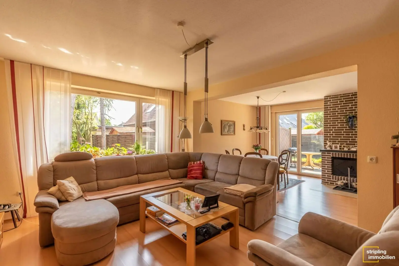 Durch eine Tür gelangen Sie ins Wohnzimmer, das ein riesiger Durchgang lediglich optisch vom Esszimmer trennt. Diese weitläufige Raumkombination lädt zum Einrichten ein, denn hier ist jede Menge Wohnraum vorhanden. Selbst die XXL-Sofalandschaft wirkt hier nicht überdimensioniert. Zwei Fensterfronten und eine doppelte Terrassentür bringen viel Licht hinein und die Sonnenstrahlen tanzen über den holzfarbenen Boden. Im Winter genießen Sie die wohlige Wärme des Kamins, während Sie sich von den Flammen hypnotisieren lassen. Haben Sie einmal keine Lust, anzufeuern, haben Sie es trotzdem kuschelig, denn das Erdgeschoss ist mit einer Fußbodenheizung versehen.