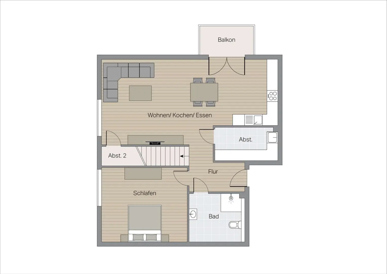 Über den Flur im Obergeschoss gelangen Sie in den offenen Wohn-, Koch- und Essbereich – das Herzstück der Wohnung. Bodentiefe, dreifach verglaste Fenster fluten den Raum mit Tageslicht und schaffen eine Atmosphäre, die zum Verweilen einlädt. Die offene Raumgestaltung verbindet Kochen, Essen und Wohnen zu einer großzügigen Einheit, in der das tägliche Zusammenleben ebenso selbstverständlich funktioniert wie der Abend mit Gästen. Von hier führt der Zugang direkt auf den sonnigen Balkon – eine nahtlose Verlängerung des Wohnbereichs ins Freie.