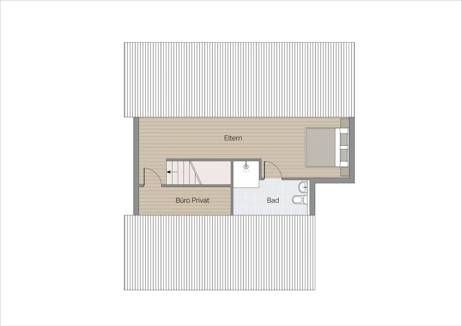 Die privaten Rückzugsbereiche verteilen sich durchdacht auf beide Ebenen. Im Obergeschoss liegt ein Schlafzimmer, das sich ideal als Kinder- oder Gästezimmer eignet, begleitet von einem modernen Bad mit bodentiefer Dusche, Waschbecken, WC und Fenster. Im Dachgeschoss erwartet Sie das großzügige Elternschlafzimmer und ein separates Arbeitszimmer – perfekt fürs Homeoffice. Ein zweites Bad mit identisch hochwertiger Ausstattung komplettiert diese Ebene und sichert maximale Privatsphäre im Alltag.