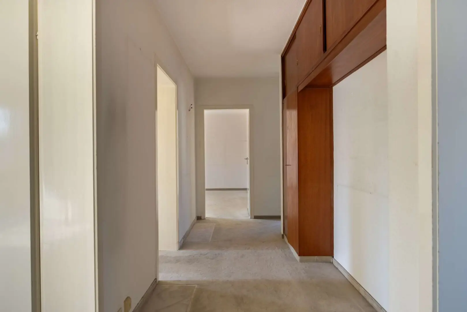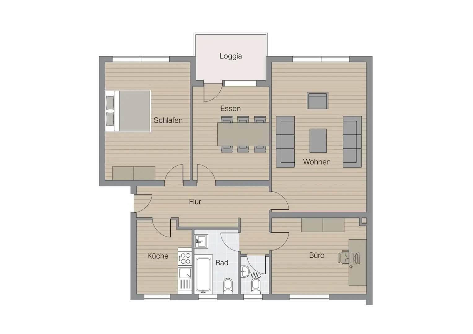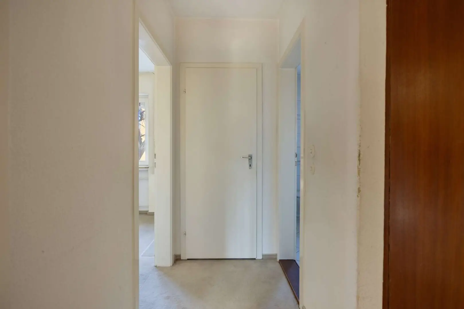 Sie betreten die Wohnung über einen eigenen Wohnungsflur, der den Grundriss strukturiert und jedem Raum seinen Platz zuweist. Von hier aus öffnet sich zur rechten eine separate Küche, und zur Linken das erste der drei Schlafzimmer. Eine Aufteilung, die klare Zonen für Kochen und Wohnen schafft und gleichzeitig Raum lässt für individuelle Umbaugedanken. Wer den Schnitt kennt, erkennt die Möglichkeiten: Vier Zimmer verteilen sich auf rund 95 m², was sowohl für Familien als auch für Paare mit Platzbedarf eine spannende Grundlage ergibt.
