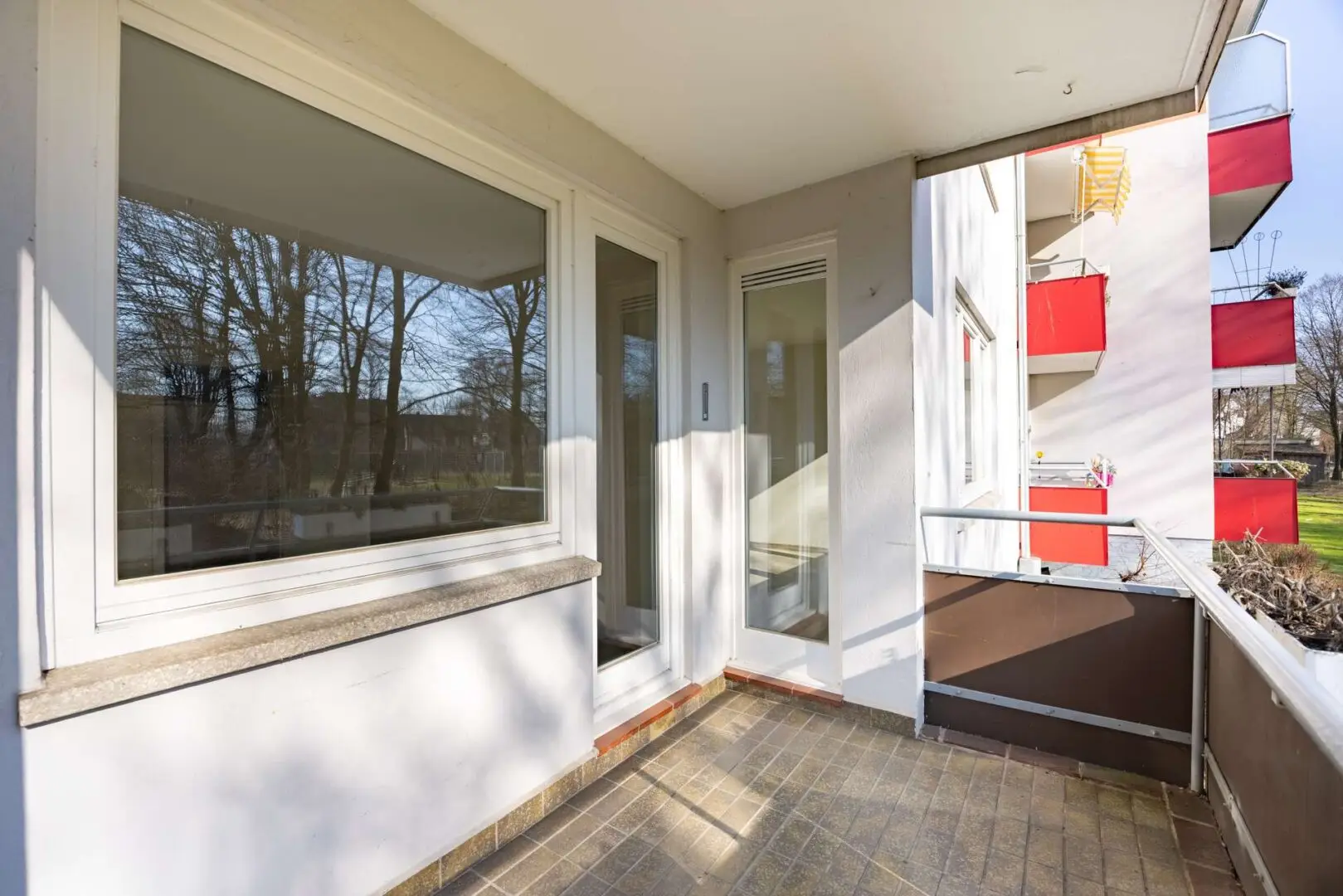 Der Balkon in Südausrichtung misst ca. 5,78 m² – kompakt genug für einen pflegeleichten Außenbereich, groß genug für Tisch und Stühle. Nach Süden ausgerichtet empfängt er die Sonne von morgens bis in den frühen Abend, was ihn für den Morgenkaffee ebenso taugt wie für entspannte Feierabende an der frischen Luft.