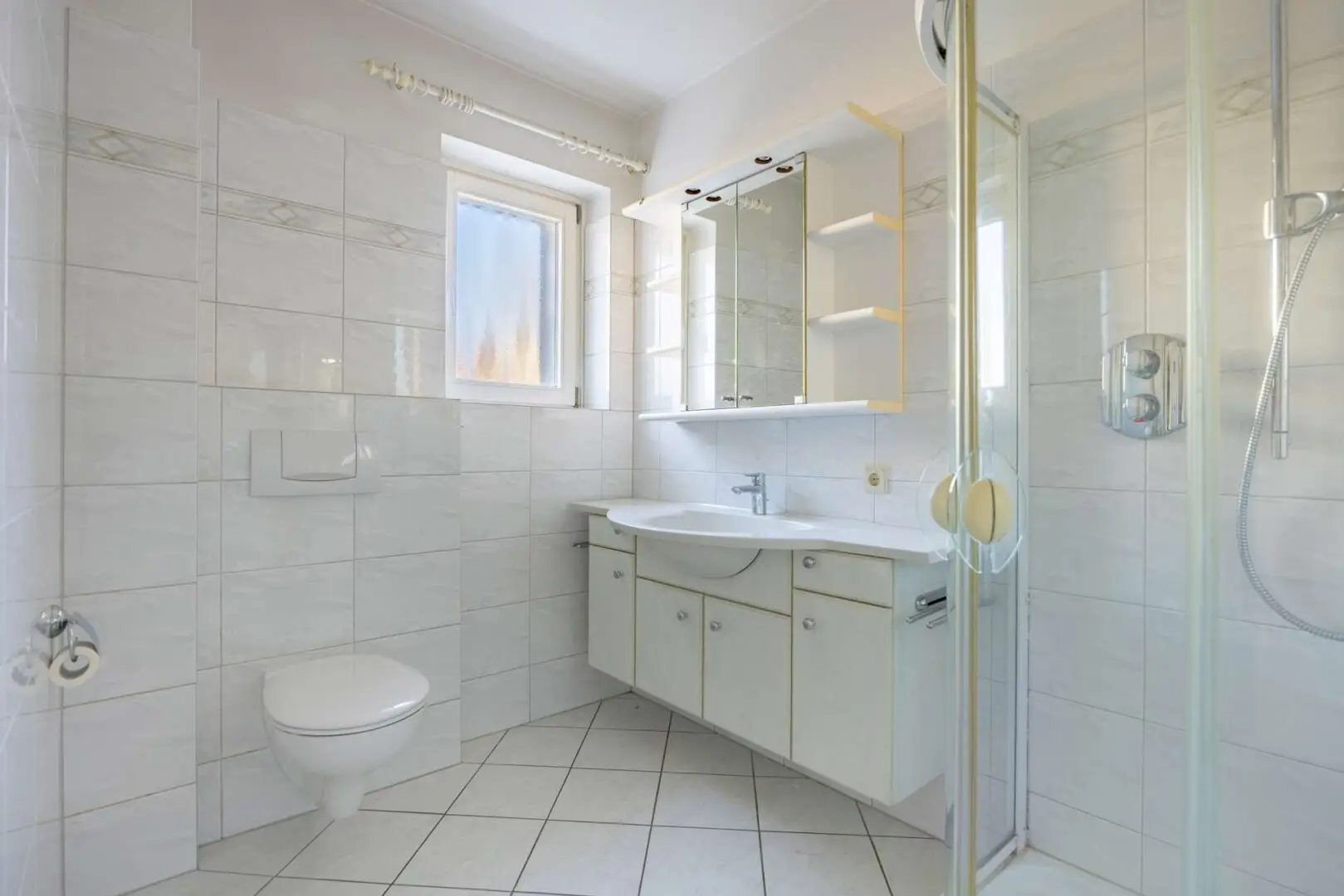 • Badezimmer mit Fenster, Toilette, Waschbecken und Dusche