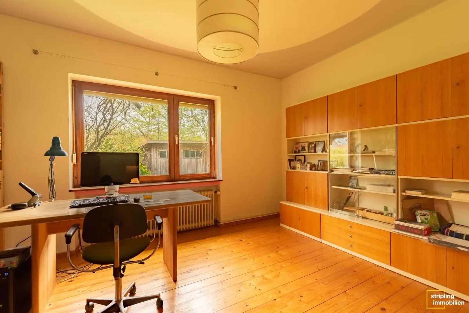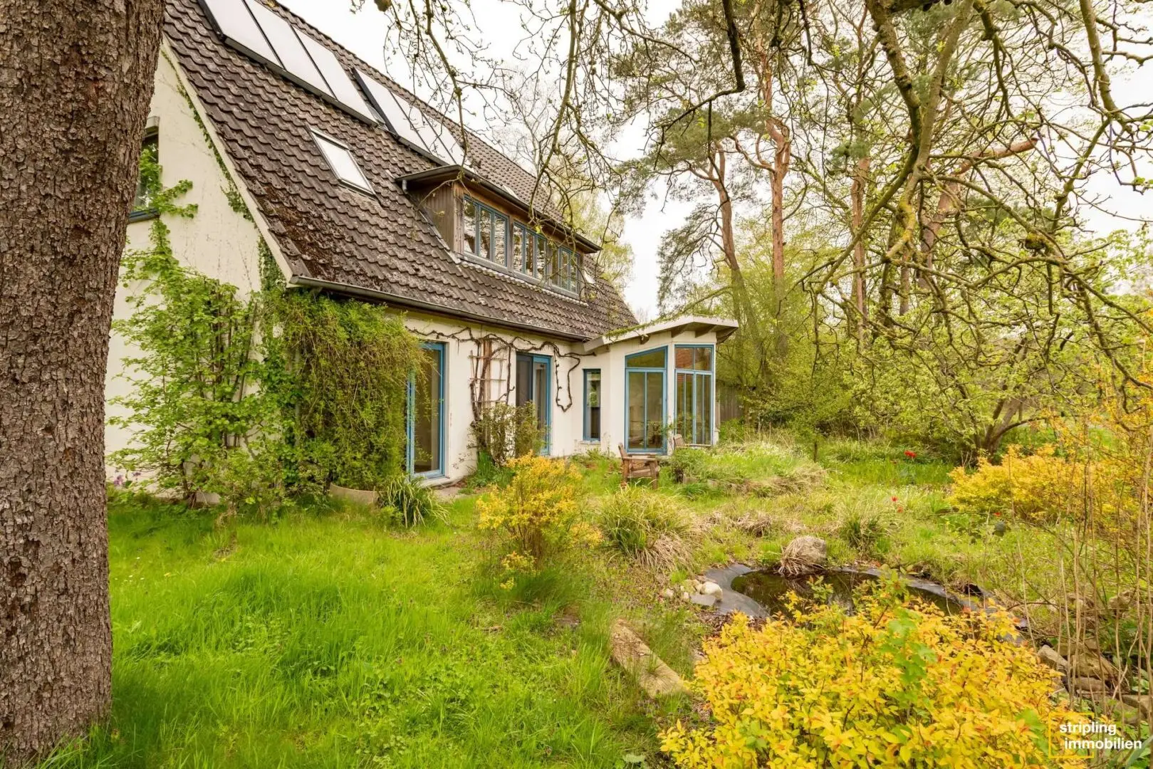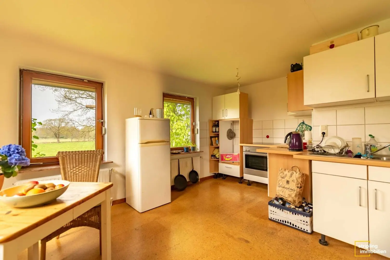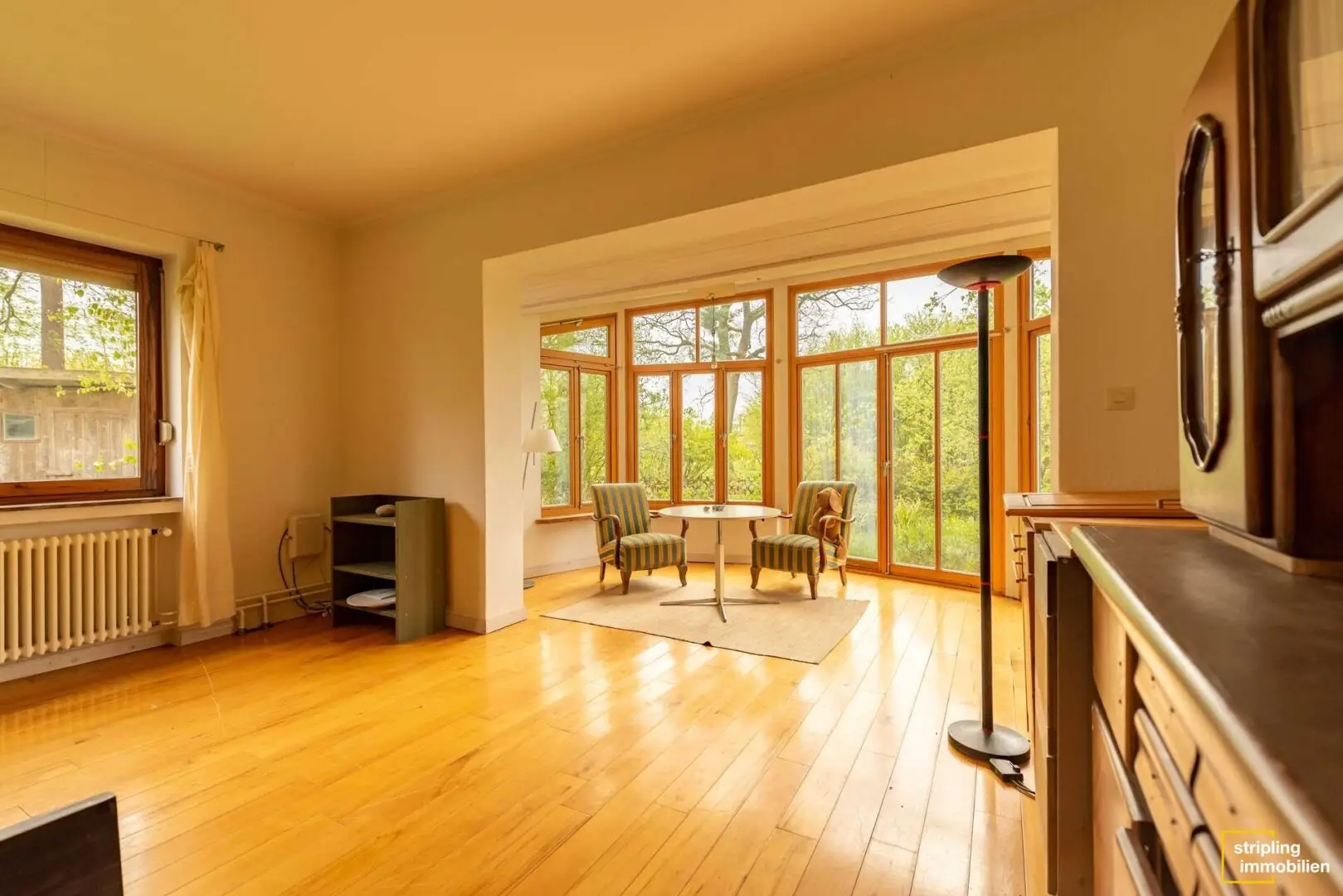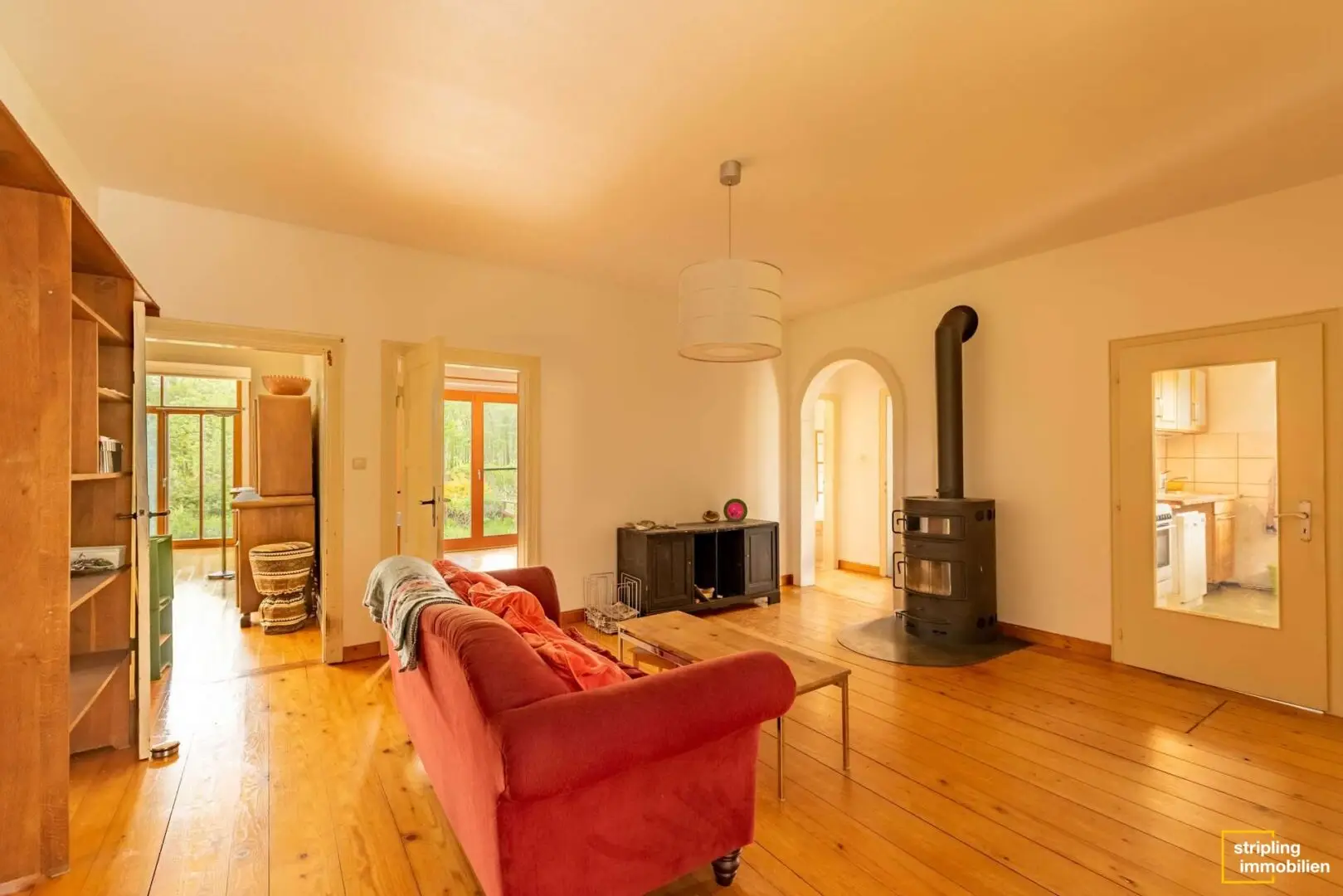 Die Diele, das Büro, das Wohnzimmer sowie Schlaf- und Kinderzimmer sind mit einem gepflegten Holzfußboden ausgestattet, der für ein angenehmes Raumklima und wohnliches Ambiente sorgt. Ein Blick durch die großzügigen Fenster der einzelnen Räume offenbart das Ausmaß des Grundstücks – Grün, so weit das Auge reicht. Besonders eindrucksvoll ist der Anbau im Wohnbereich, der die gesamte Wohnfläche mit Licht durchflutet und einen herrlichen Blick in den Garten zulässt. Stellen Sie sich vor, wie Sie mit einem frisch zubereiteten Kaffee oder Tee Ihren Gedanken freien Lauf lassen können.