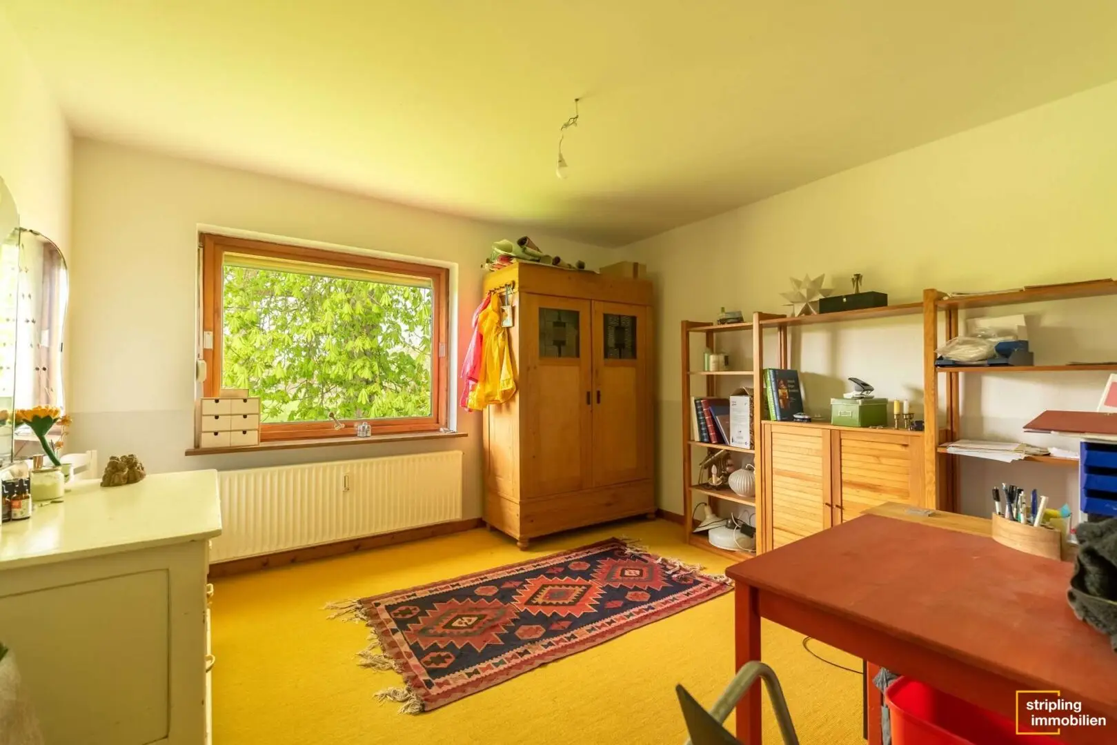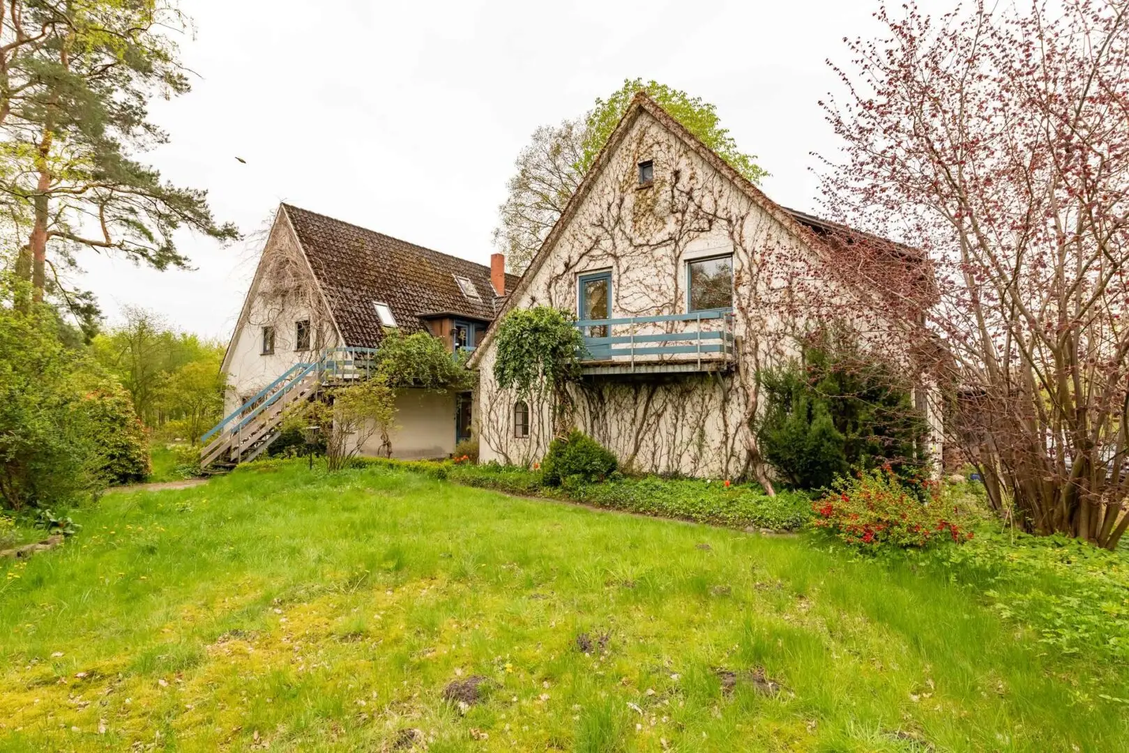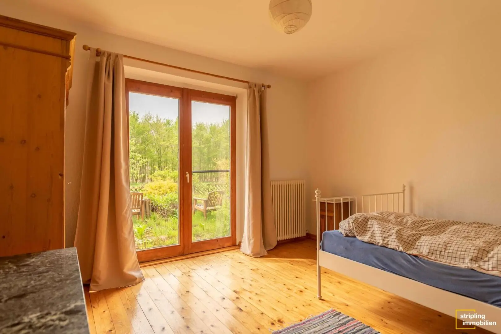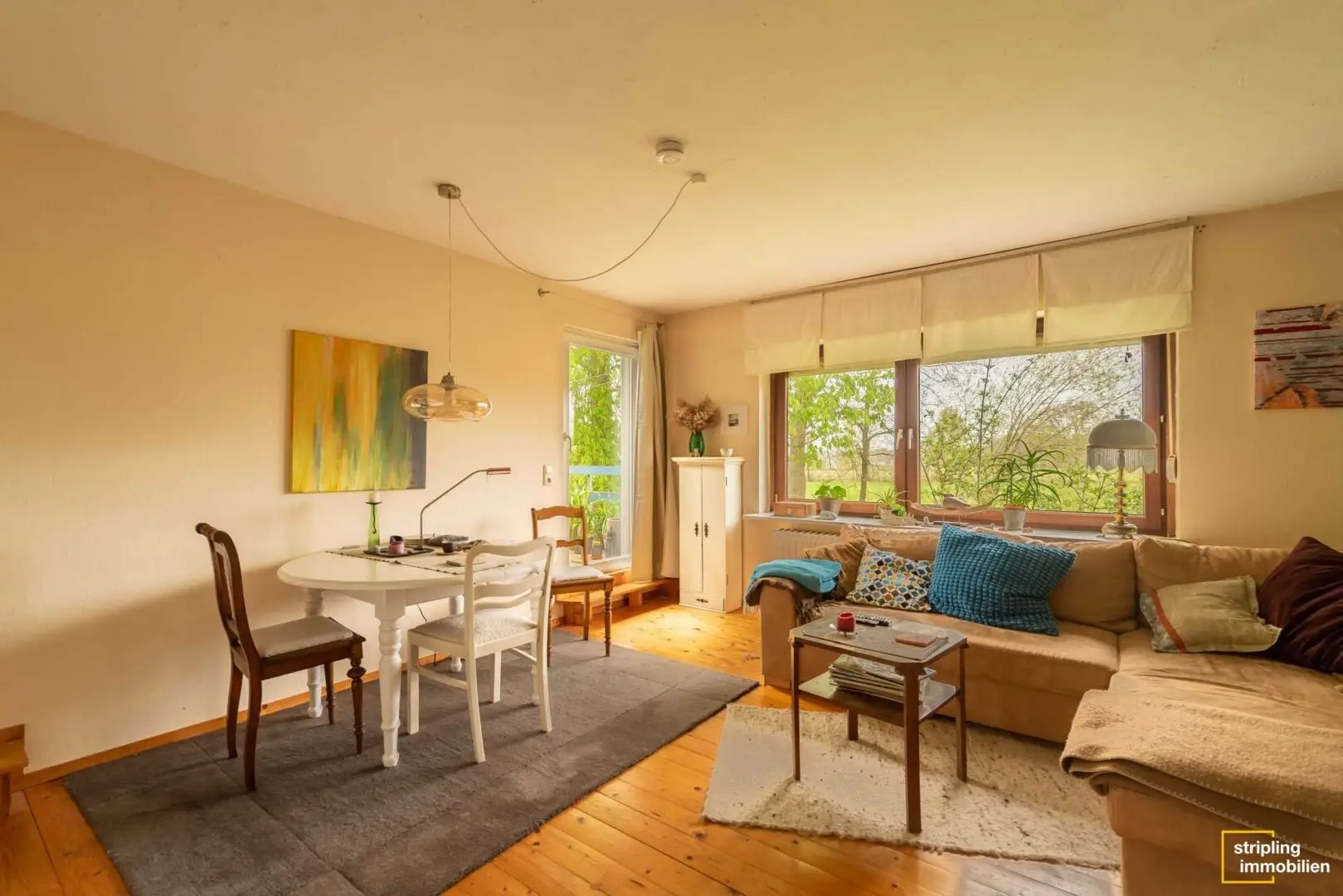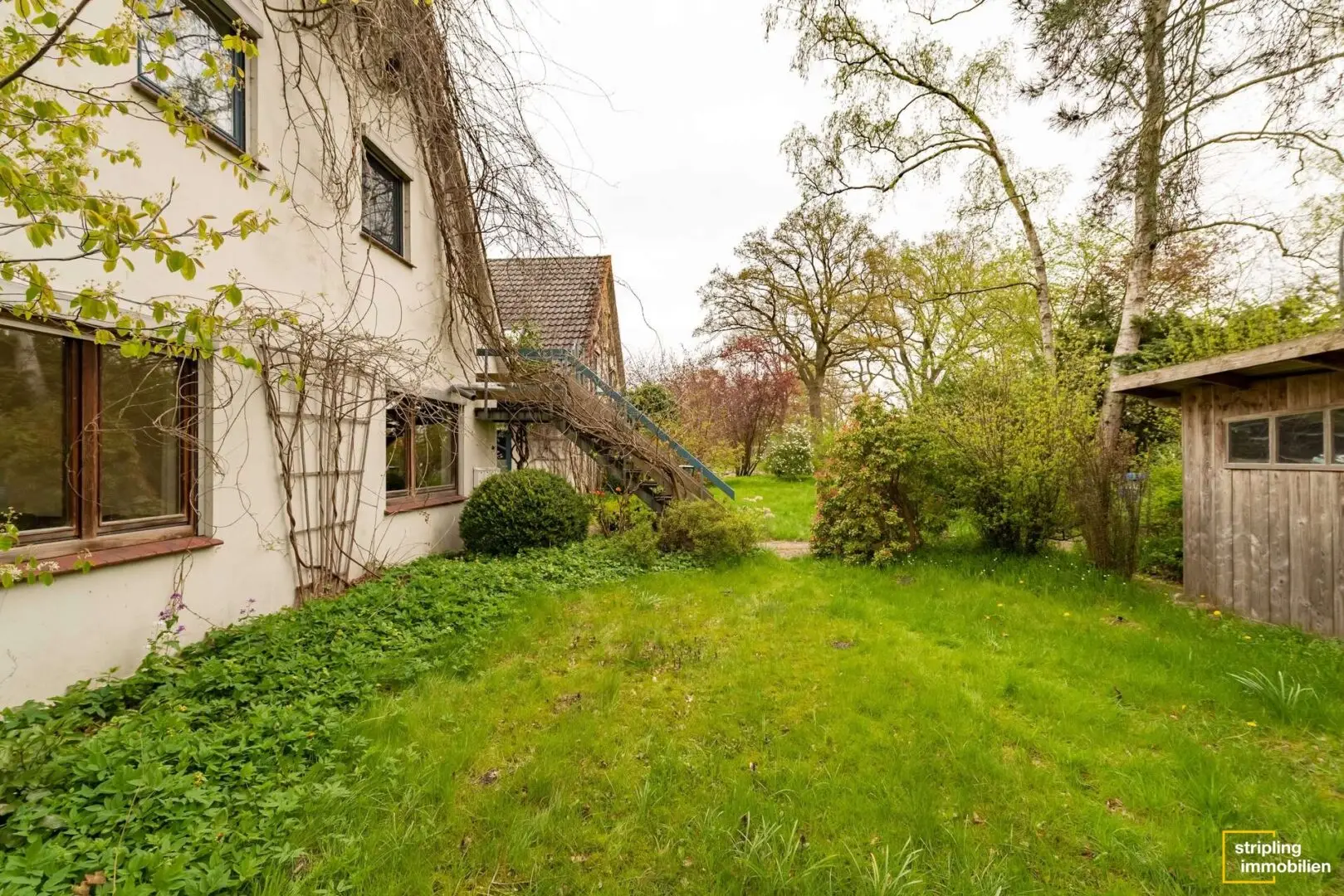 Die Diele, das Büro, das Wohnzimmer sowie Schlaf- und Kinderzimmer sind mit einem gepflegten Holzfußboden ausgestattet, der für ein angenehmes Raumklima und wohnliches Ambiente sorgt. Ein Blick durch die großzügigen Fenster der einzelnen Räume offenbart das Ausmaß des Grundstücks – Grün, so weit das Auge reicht. Besonders eindrucksvoll ist der Anbau im Wohnbereich, der die gesamte Wohnfläche mit Licht durchflutet und einen herrlichen Blick in den Garten zulässt. Stellen Sie sich vor, wie Sie mit einem frisch zubereiteten Kaffee oder Tee Ihren Gedanken freien Lauf lassen können.