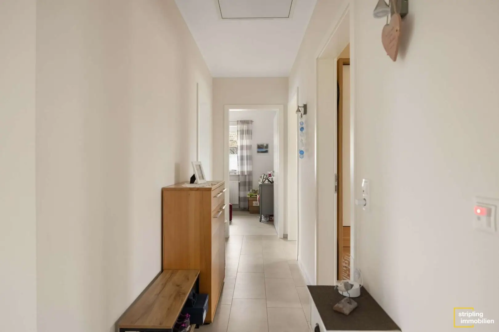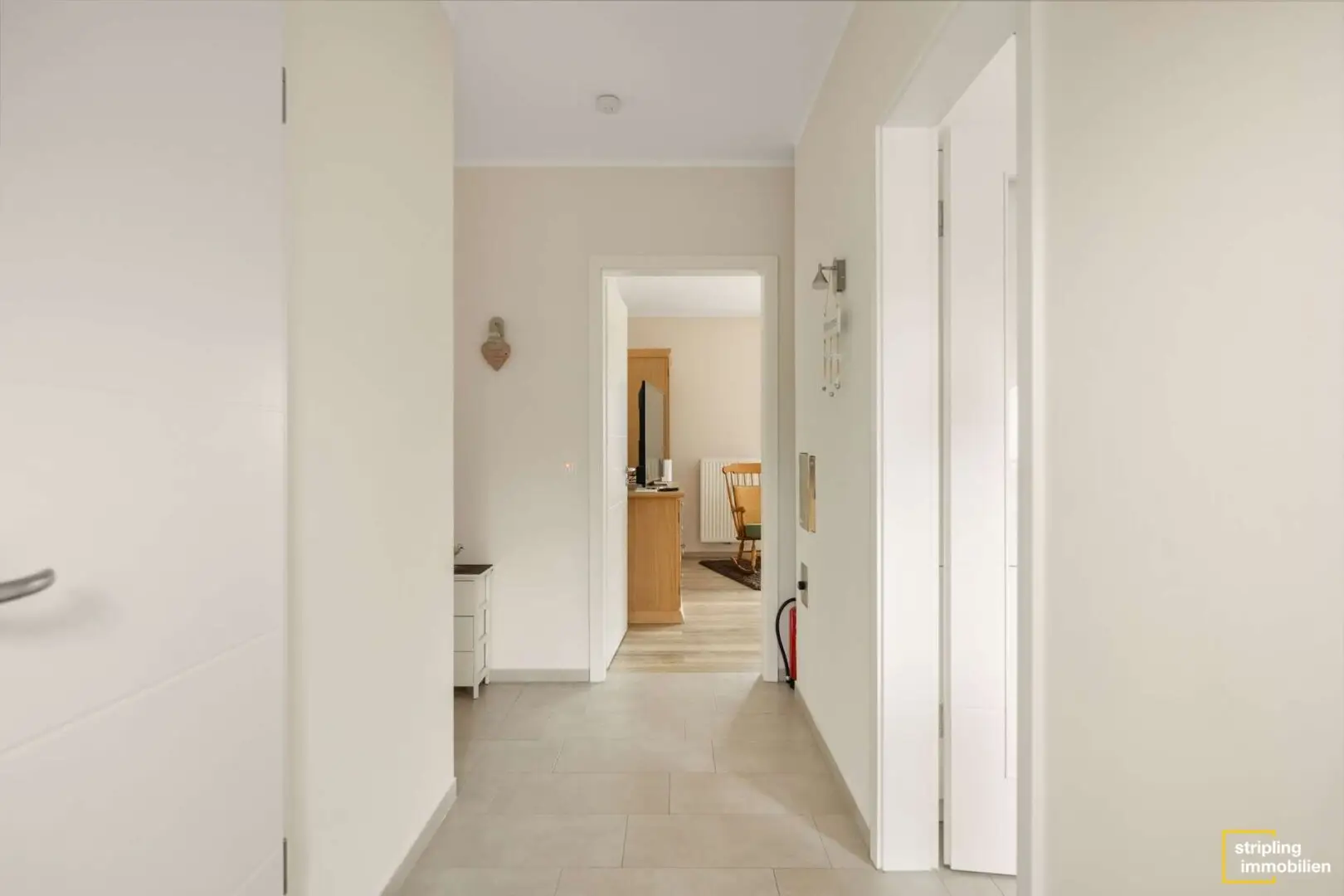 Der erste Raum, in den Sie gelangen, wenn Sie durch die Eingangstür treten, ist ein L-förmiger Flur, der gleichzeitig das Zentrum des Hauses ist. Er bietet einerseits ausreichend freie Wandfläche, um eine Garderobe oder Kommoden zu platzieren. Andererseits ist er so angelegt, dass er direkten Zugang zu allen Zimmern bietet.