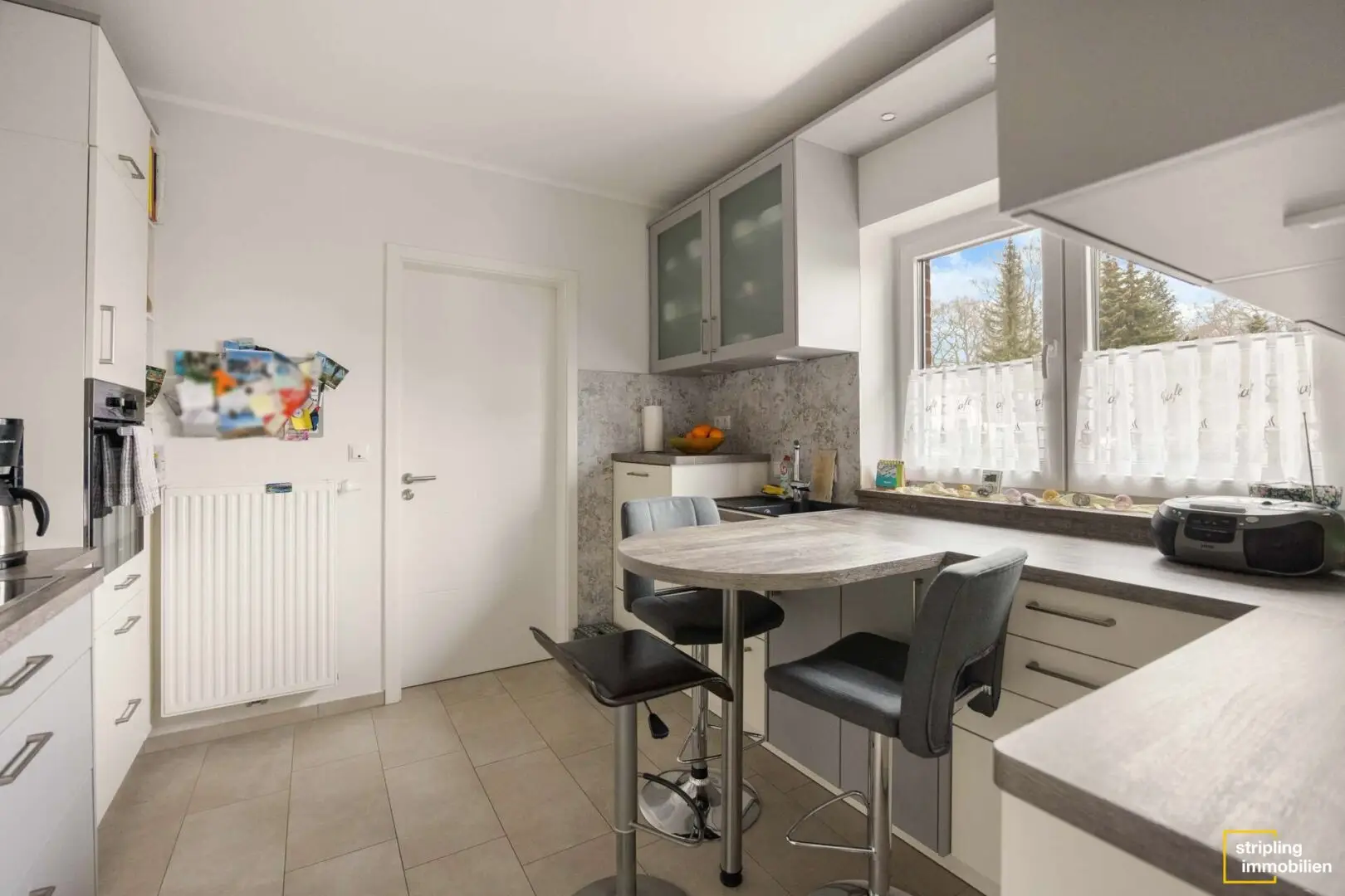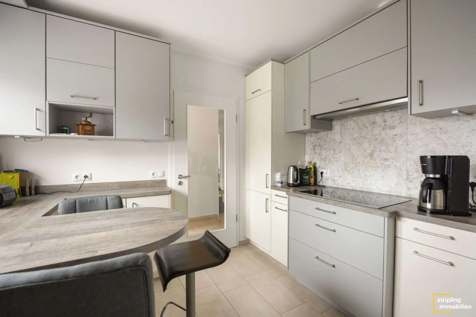 Rechts neben dem Eingang befindet sich die Küche mit angrenzendem Hauswirtschaftsraum. So können Sie Ihre Vorräte in direktem Zugriff aufbewahren. Die Einbauküche inklusive der Elektrogeräte (Marke Neff und Miele) stammt aus dem Jahr 2022 und ist somit als neuwertig zu betrachten. Die vorhandene Fläche wird perfekt ausgenutzt, sodass es ausreichend Stauraum und Arbeitsfläche gibt. Als Ergänzung zur Arbeitsplatte wurde geschickt ein kleiner Sitzbereich integriert. Die Wohnfläche der Küche beträgt ca. 9,77 m², während der Hauswirtschaftsraum zusätzlich ca. 5,06 m² bietet.