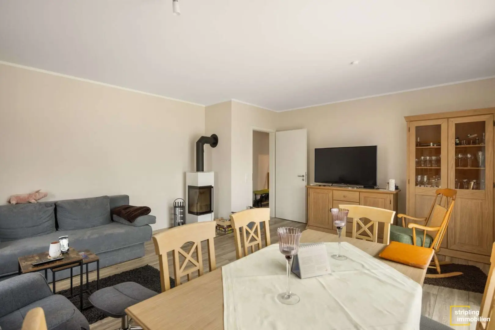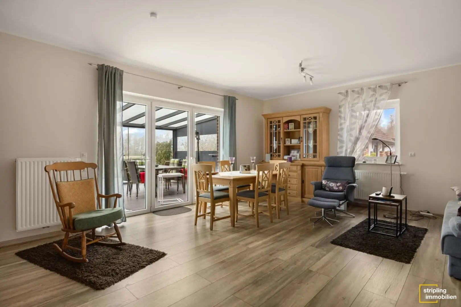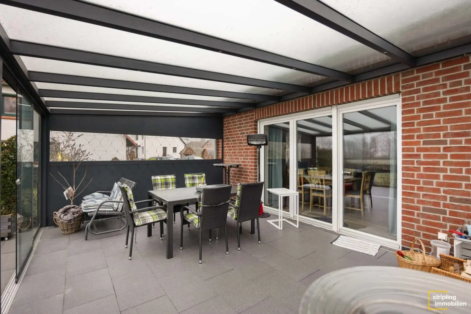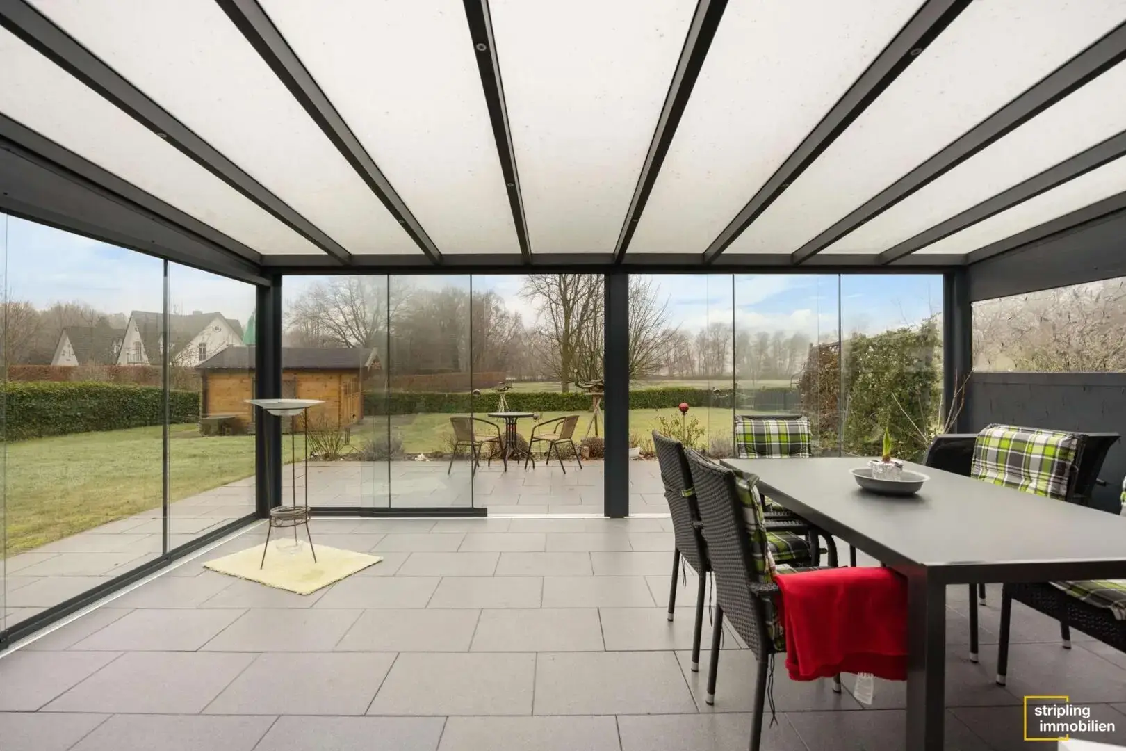 Neben der Küche befindet sich das ca. 28,14 m² große Wohn- und Esszimmer. Dieses verfügt über eine große, bodentiefe Glasfront sowie ein weiteres Fenster, sodass der Raum hell und lichtdurchflutet ist. Ein Kaminofen verspricht gemütliche Stunden im Herbst und im Winter. Besonders eindrucksvoll ist zudem die angrenzende Terrasse gestaltet. Es handelt sich um eine Mischung aus Wintergarten und Terrasse. Sie gelangen vom Wohnzimmer zunächst in den Wintergarten, der sich über eine Fläche von ca. 23,4 m² erstreckt. Große Glaselemente schützen Sie vor der Witterung und lassen gleichzeitig einen Blick in den idyllischen Garten zu. Außerhalb des Wintergartens gibt es eine Terrasse, sodass Sie frische Luft und Sonnenstrahlen auch direkt genießen können – perfekte Bedingungen für jedes Wetter.