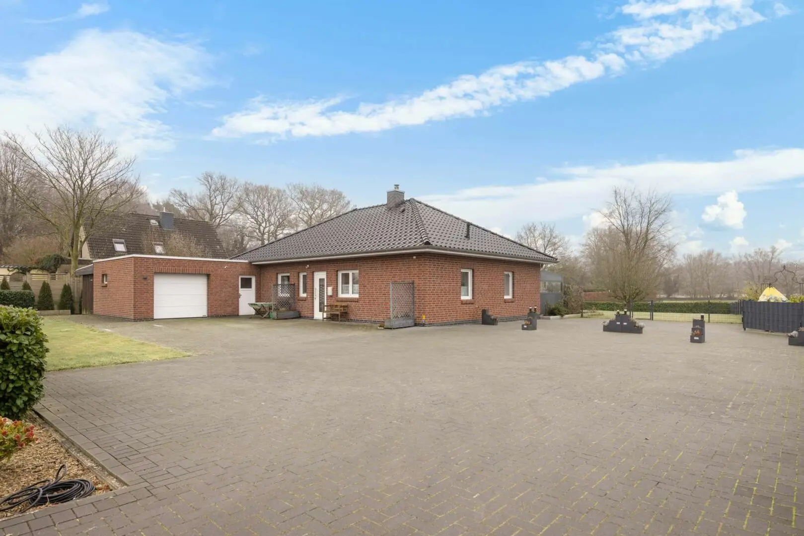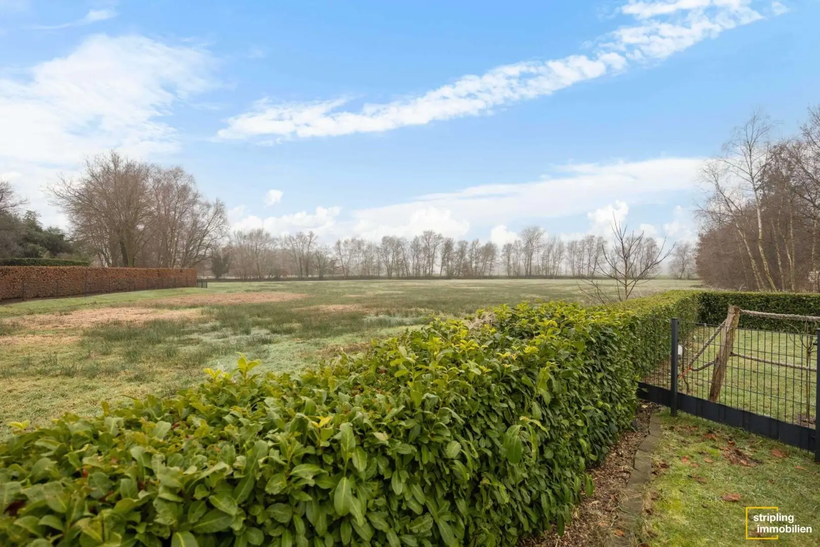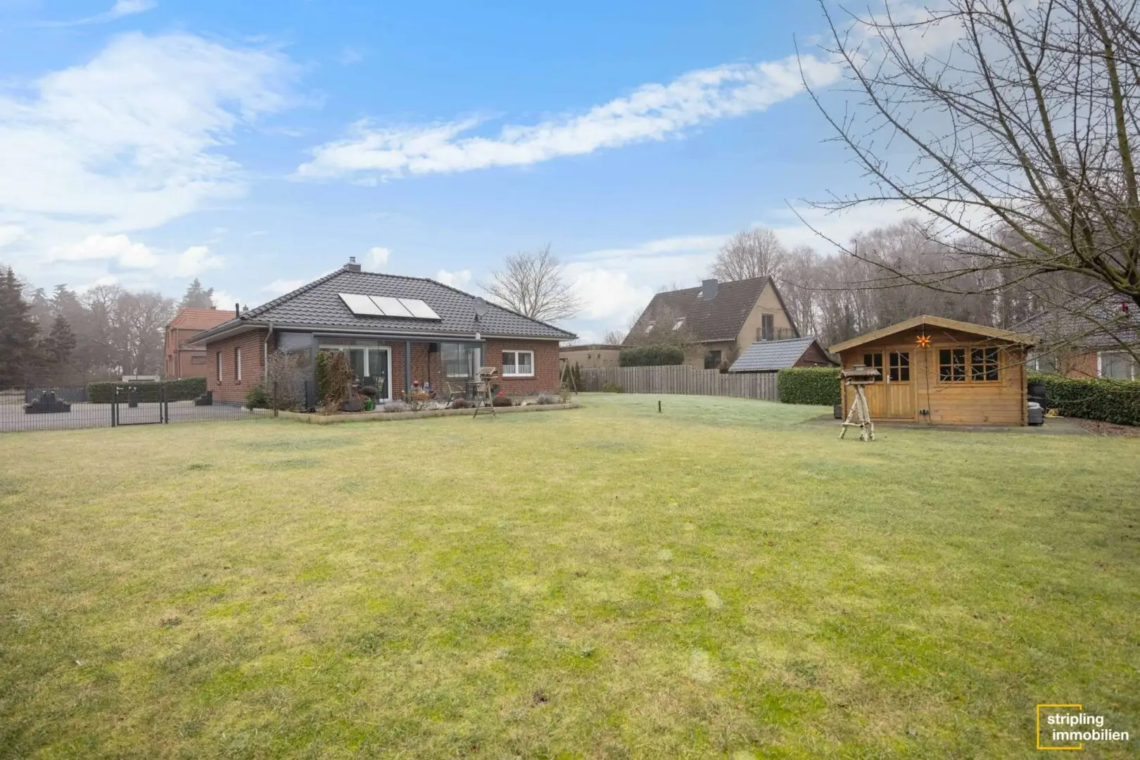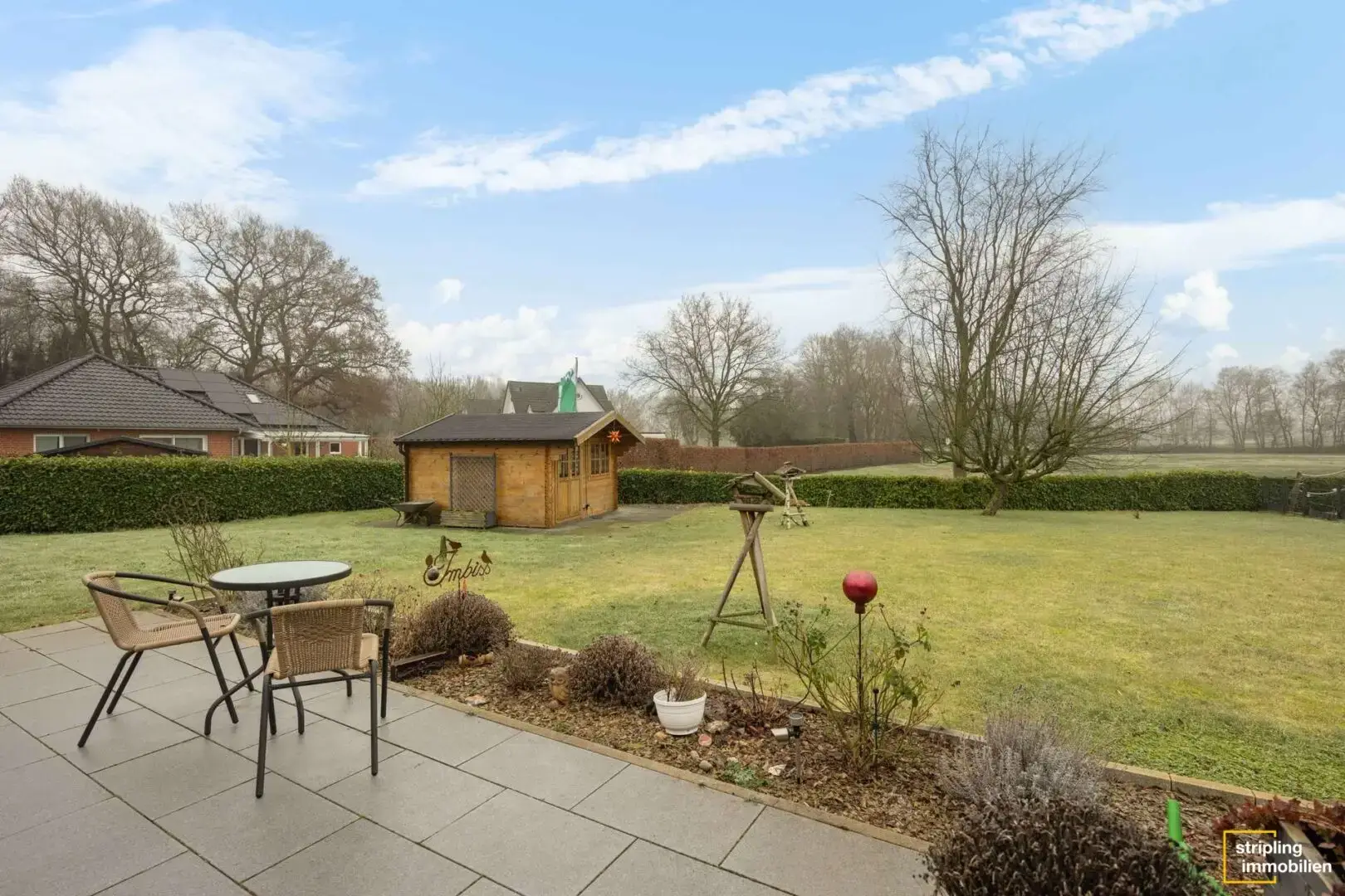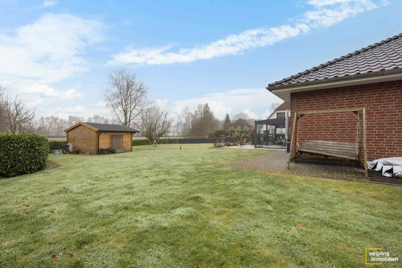 Abschließend möchten wir noch den Garten erwähnen, der bei einem solch großen Grundstück nicht fehlen darf. Er umschließt die Terrasse und einen Teil des Hauses und besteht aus einer großen Rasenfläche, einigen Blumenbeeten und einem Gartenhaus. Zusätzlich wurde in 2022 eine Grundwasserpumpe für die Bewässrung des Gartens installiert. Besonders erwähnenswert ist der unverbaubare Ausblick ins Grüne. An der Grundstücksgrenze ist eine Hecke gepflanzt. Die freie Fläche bietet viel Platz zum Spielen oder lassen Sie Ihrer Kreativität freien Lauf und legen zum Beispiel weitere Beete an – welcher Gartentyp sind Sie?