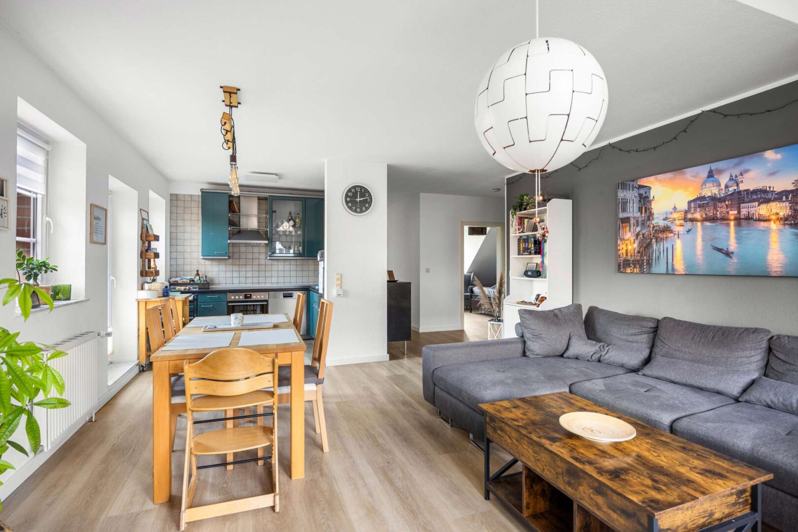 Der Weg in den großen Wohn- und Essbereich eröffnet die stärkste Qualität dieser Wohnung: das weit gefächerte Tageslicht, das über mehrere Fensterachsen von beiden Seiten eindringt und den Raum in eine freundliche, inspirierende Atmosphäre taucht. Die leicht geneigten Decken des Dachgeschosses schaffen einen wohnlichen Rahmen, der sich harmonisch mit dem hellen Boden verbindet. Der Wohnbereich öffnet sich zur Küche, die durch ihre Positionierung angenehm separiert ist und gleichzeitig nah genug liegt, um den Essplatz selbstverständlich einzubinden.