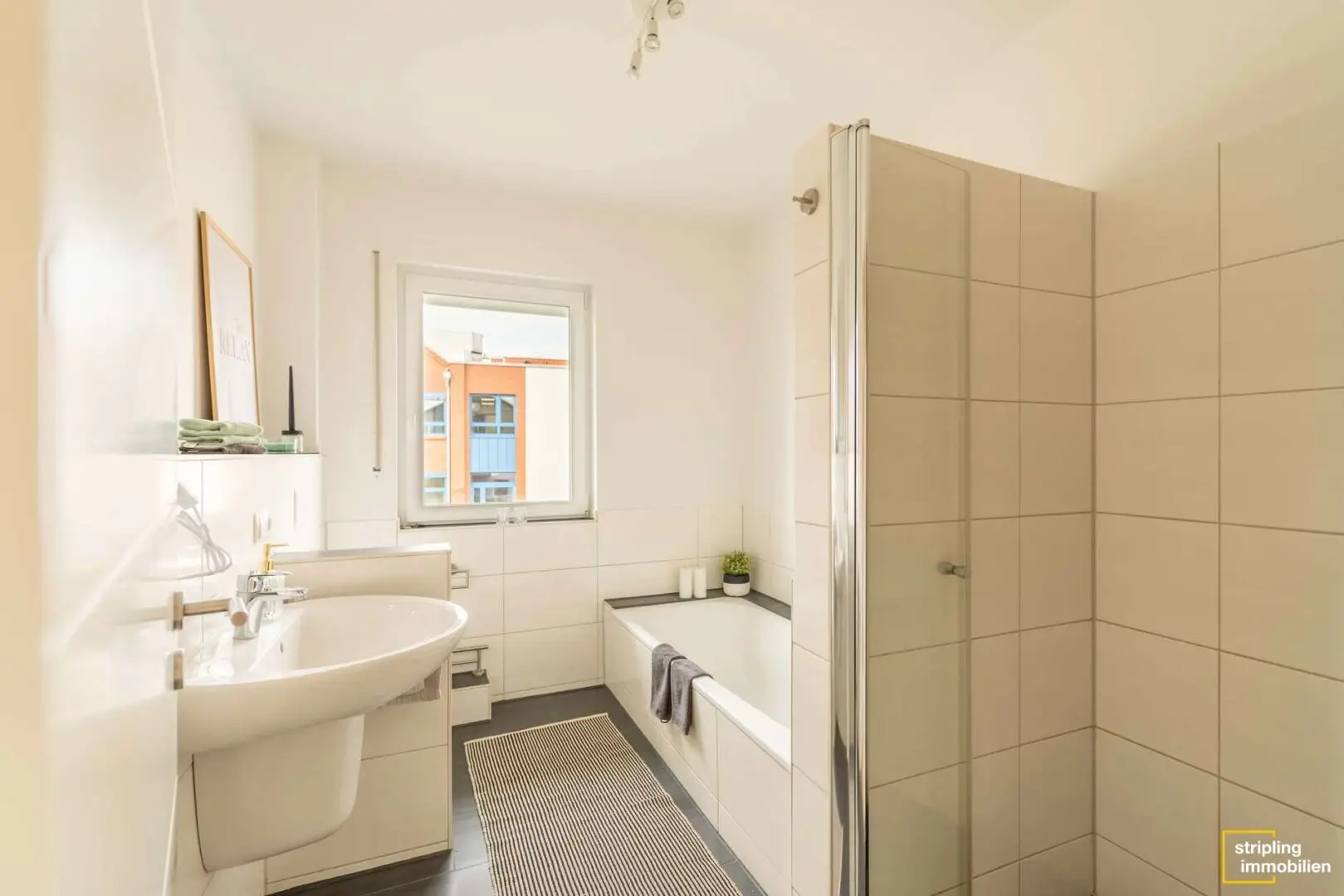Genau wie das Äußere punktet auch das Hausinnere mit geschmackvollem, geradlinigem Design und einer durchdachten Raumaufteilung. Im Erdgeschoss stehen Sie zunächst in einer geräumigen, weitläufig wirkenden Diele mit Zugang zur Treppe. Hier gibt es genug Platz für Schränke und andere Garderobenmöbel. Nebenan liegt das Gäste-WC mit eigenem Fenster und einem modernen Fliesenspiegel in Weiß und Anthrazit. Über die restliche Etage ziehen sich helle Fliesen und schaffen eine freundliche, lichte Atmosphäre. Das wirkt auch im Wohn- und Esszimmer großzügig und einladend. Dieser fast 35 m² große Raum hat nach Südosten zum Garten hin zwei doppelte Terrassentüren, die die Sonne ins Haus holen. Gleichzeitig bietet er üppig Wandstellflächen. Von der riesigen Couchlandschaft über eine lange Familientafel hin zu Bildern in Galeriegröße – in dieser Raumkombination müssen Sie Ihrem Einrichtungstraum keine Grenzen setzen.