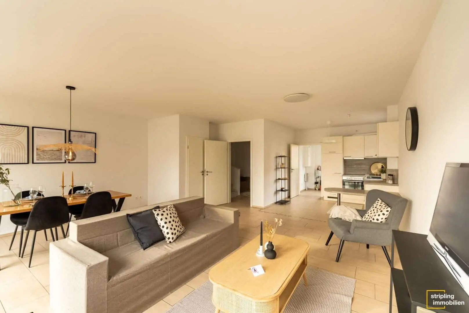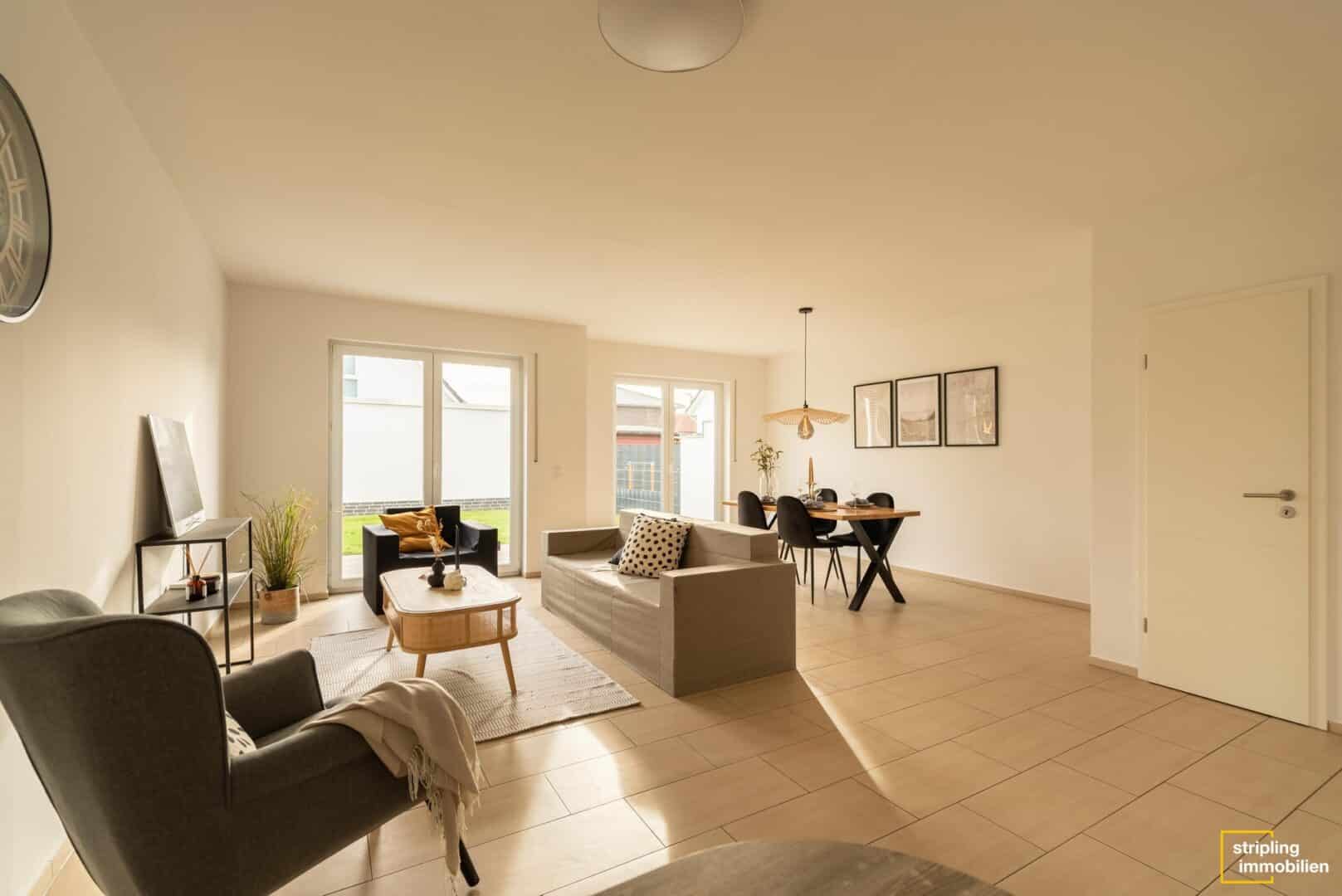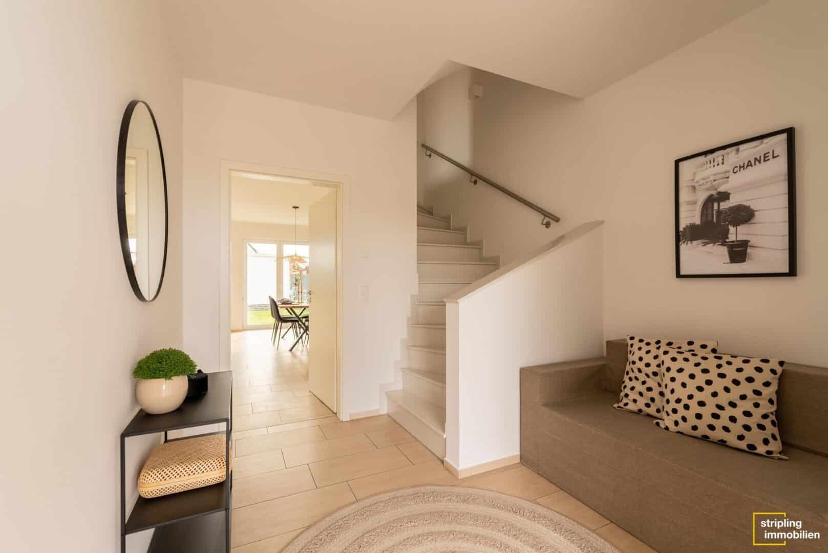Genau wie das Äußere punktet auch das Hausinnere mit geschmackvollem, geradlinigem Design und einer durchdachten Raumaufteilung. Im Erdgeschoss stehen Sie zunächst in einer geräumigen, weitläufig wirkenden Diele mit Zugang zur Treppe. Hier gibt es genug Platz für Schränke und andere Garderobenmöbel. Nebenan liegt das Gäste-WC mit eigenem Fenster und einem modernen Fliesenspiegel in Weiß und Anthrazit. Über die restliche Etage ziehen sich helle Fliesen und schaffen eine freundliche, lichte Atmosphäre. Das wirkt auch im Wohn- und Esszimmer großzügig und einladend. Dieser fast 35 m² große Raum hat nach Südosten zum Garten hin zwei doppelte Terrassentüren, die die Sonne ins Haus holen. Gleichzeitig bietet er üppig Wandstellflächen. Von der riesigen Couchlandschaft über eine lange Familientafel hin zu Bildern in Galeriegröße – in dieser Raumkombination müssen Sie Ihrem Einrichtungstraum keine Grenzen setzen.
