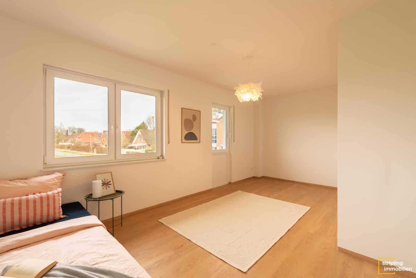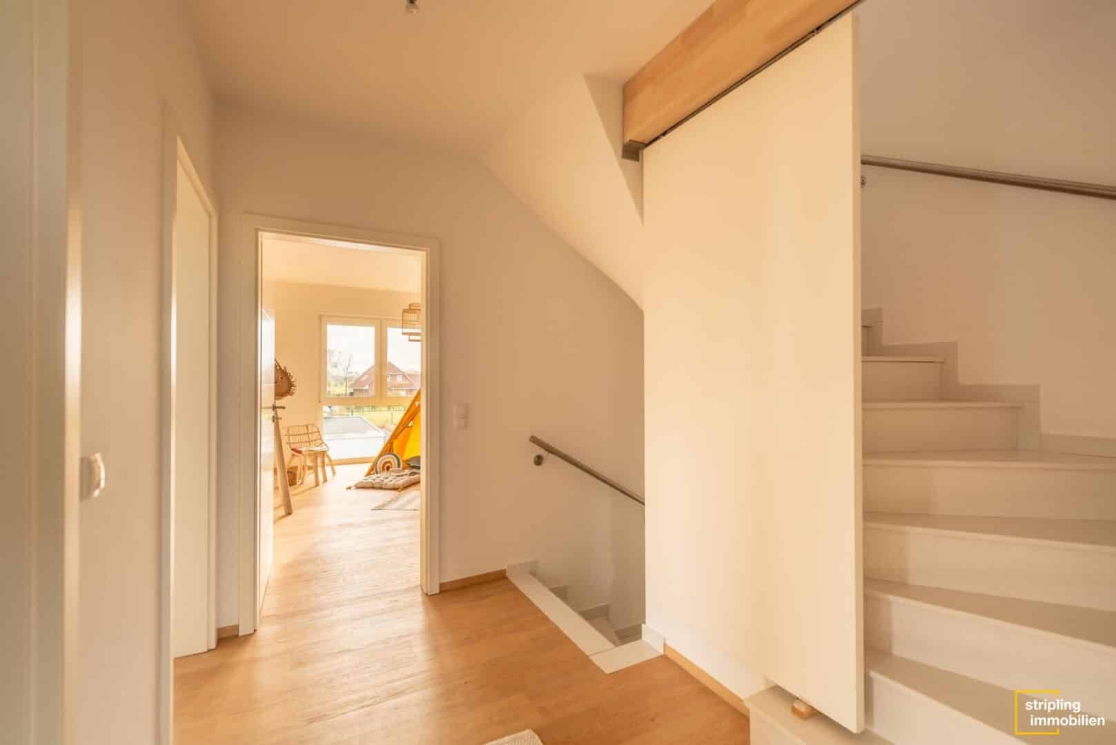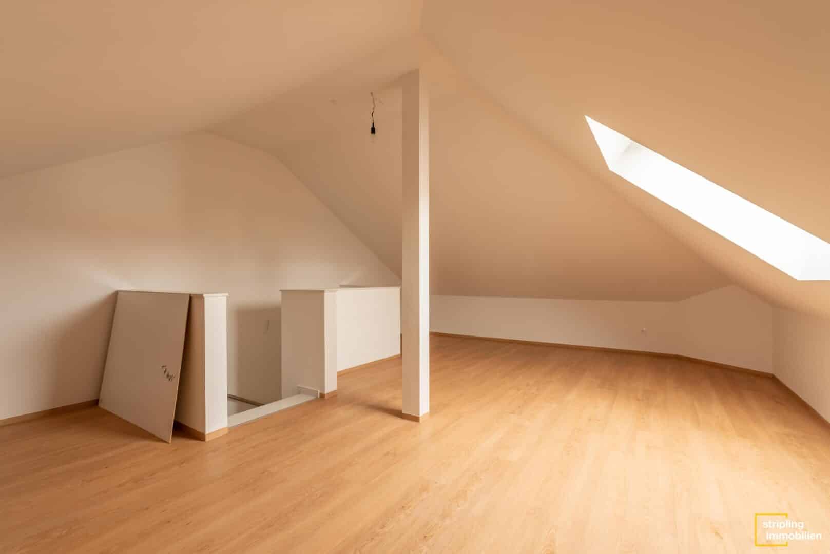 Die zweite Etage wartet mit insgesamt drei Schlafzimmern auf, die mit einem hochwertigen Vinylboden ausgestattet sind. Das Material ist äußerst pflegeleicht und besitzt gleichzeitig – täuschend echt – die Optik eines massiven Holzbodens. Üppige Fensterflächen durchfluten die Zimmer mit Licht und machen sie zu traumhaften Kinder-, Schlaf- oder Gästezimmern. Der größte Raum bietet mit seinem länglichen Schnitt sogar die Möglichkeit, einen Ankleidebereich optisch abzutrennen. Zwischen den Zimmern liegt das Hauptbad, das mit denselben Fliesen wie das Gäste-WC belegt ist. Es ist geräumig und verwöhnt seine Bewohner mit einer gemütlichen Badewanne und einer bodenebenen Dusche. Durch eine elegante Schiebetür hindurch gelangen Sie in den ausgebauten Spitzboden. Er hat fast 19 m² Wohnfläche und bezaubert mit seiner fesselnden Deckenstruktur. Wie könnten Sie diesen Raum nutzen? Bestimmt haben Sie schon eine Idee. Homeoffice, Hauptschlafzimmer oder Hobbyraum – es gibt viele Möglichkeiten.