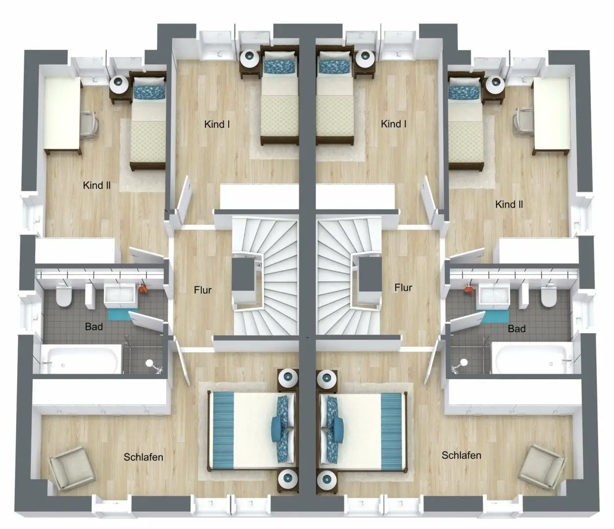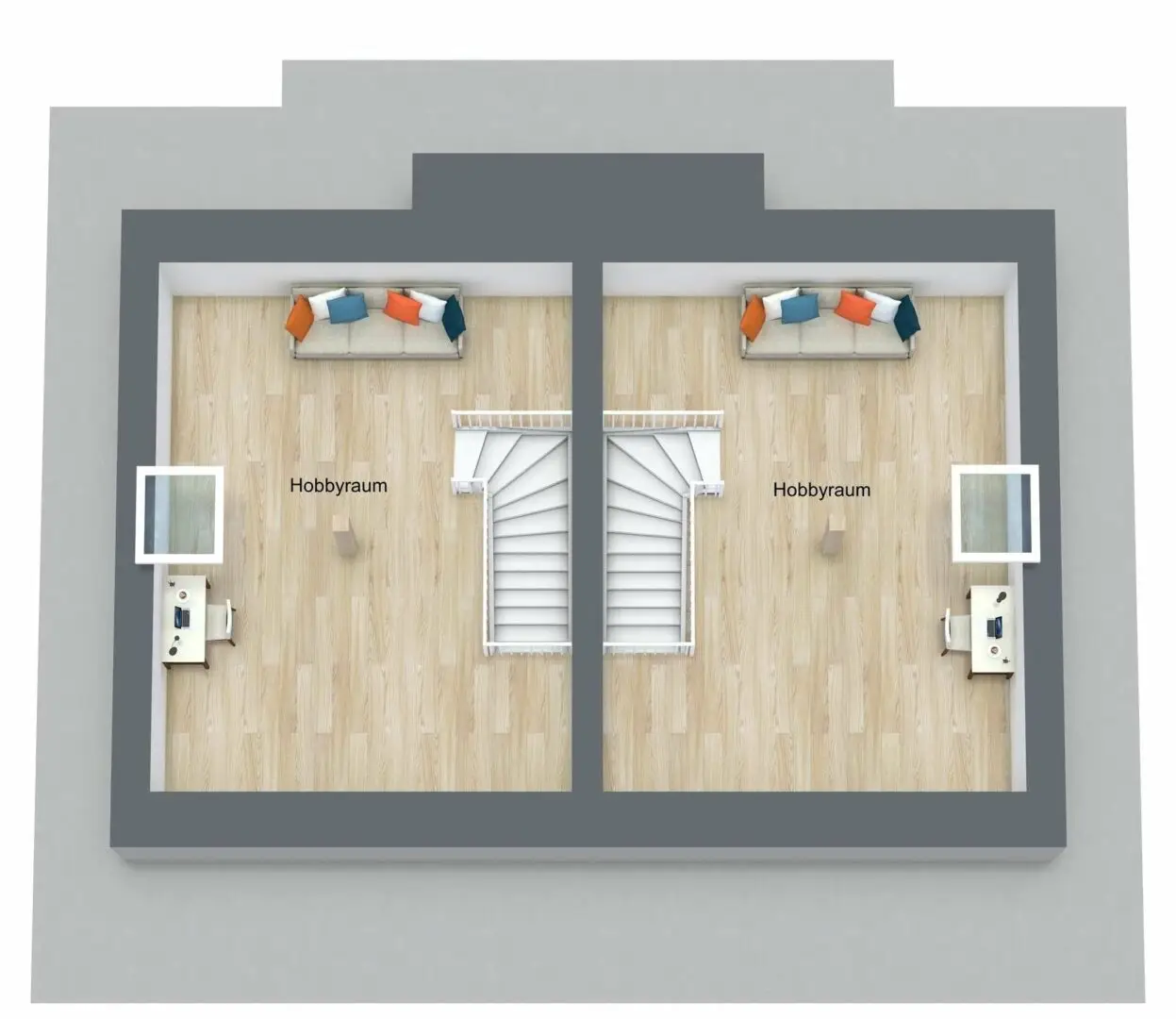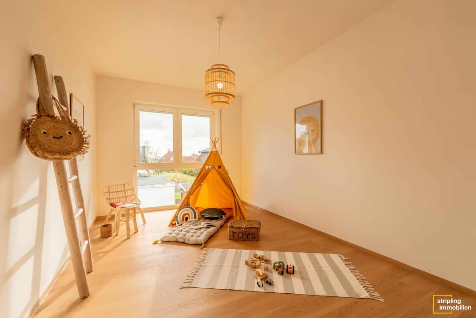 Die zweite Etage wartet mit insgesamt drei Schlafzimmern auf, die mit einem hochwertigen Vinylboden ausgestattet sind. Das Material ist äußerst pflegeleicht und besitzt gleichzeitig – täuschend echt – die Optik eines massiven Holzbodens. Üppige Fensterflächen durchfluten die Zimmer mit Licht und machen sie zu traumhaften Kinder-, Schlaf- oder Gästezimmern. Der größte Raum bietet mit seinem länglichen Schnitt sogar die Möglichkeit, einen Ankleidebereich optisch abzutrennen. Zwischen den Zimmern liegt das Hauptbad, das mit denselben Fliesen wie das Gäste-WC belegt ist. Es ist geräumig und verwöhnt seine Bewohner mit einer gemütlichen Badewanne und einer bodenebenen Dusche. Durch eine elegante Schiebetür hindurch gelangen Sie in den ausgebauten Spitzboden. Er hat fast 19 m² Wohnfläche und bezaubert mit seiner fesselnden Deckenstruktur. Wie könnten Sie diesen Raum nutzen? Bestimmt haben Sie schon eine Idee. Homeoffice, Hauptschlafzimmer oder Hobbyraum – es gibt viele Möglichkeiten.