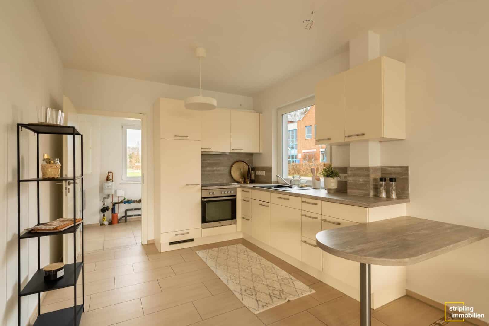 Im Sommer öffnen Sie die Terrassentüren und erweitern den Wohnraum um die Terrassenfläche und den angrenzenden Garten. Das Grundstück ist mit Zaun und Hecken vollständig eingefasst und bereit für Sonnenhungrige, Partygäste oder tobende Kinder. Von hier aus haben Sie Zugang zum Abstellraum des Carports, der sich dadurch auch für die Unterbringung von Gartenutensilien oder Spielsachen eignet. Zurück im Haus fällt als Nächstes die offene Küche mit großem Fenster ins Auge. Die Einbaumöbel sind in gedecktem Weiß gehalten und heben sich stilsicher von Arbeitsfläche und Rückwand in Holzoptik ab. Ein kleiner Frühstückstisch ist prädestiniert für eine Mahlzeit zwischendurch oder den Kaffeeplausch zu zweit. Von der Küche aus gelangen Sie schließlich in den Hauswirtschaftsraum, in dem sich auch die Heizanlage befindet. Eine Außentür verbindet sie praktisch mit dem Vorplatz.