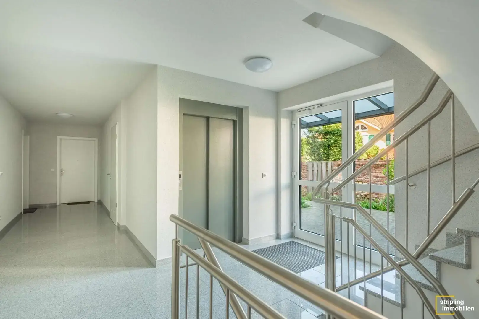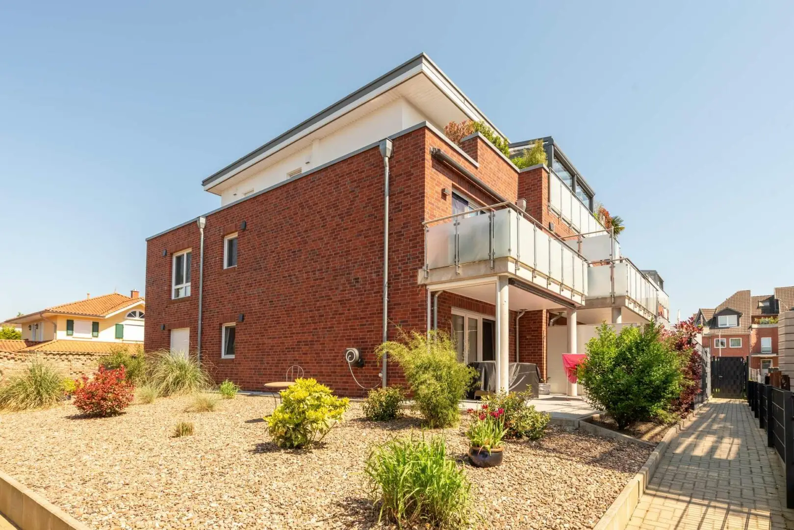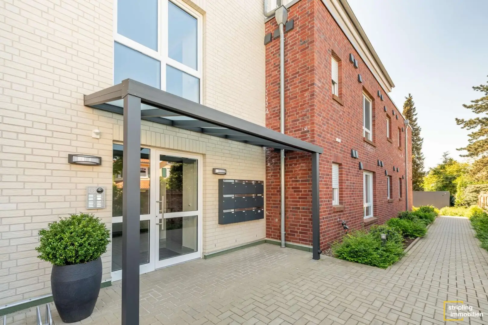 Der erste Eindruck zählt – bereits von außen überzeugt das 2021 erbaute Mehrfamilienhaus. Roter und cremefarbener Klinker stehen in einem warmen Kontrast zueinander, ein Glasvordach bietet Schutz vor Regen und Schnee und die Balkongeländer aus Glas und Edelstahl wirken modern und zeitlos zugleich. Und auch wenn Sie das großzügige, helle Treppenhaus betreten, werden Sie begeistert sein. Der Fahrstuhl befindet sich direkt auf der rechten Seite. Links gelangen Sie zu einer Treppe mit einem Geländer aus gebürstetem Edelstahl, die in das erste Obergeschoss zur Eigentumswohnung führt. Wollen wir einen Blick hineinwerfen?