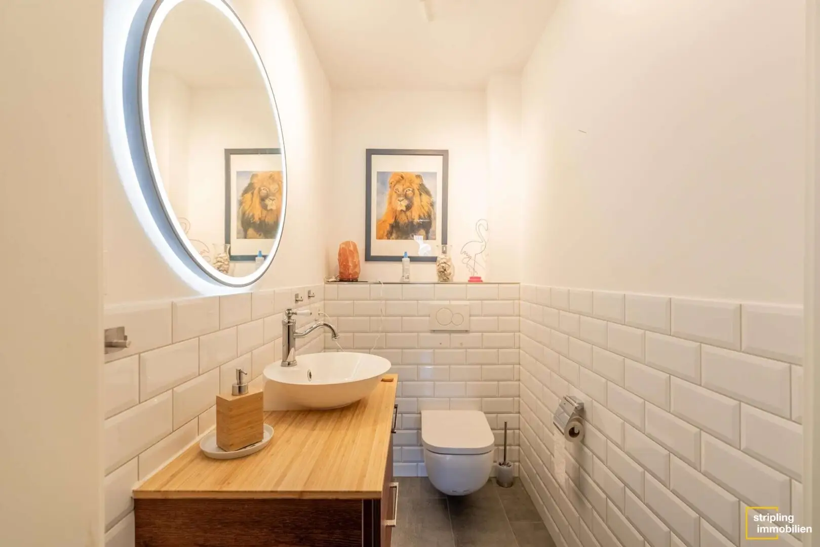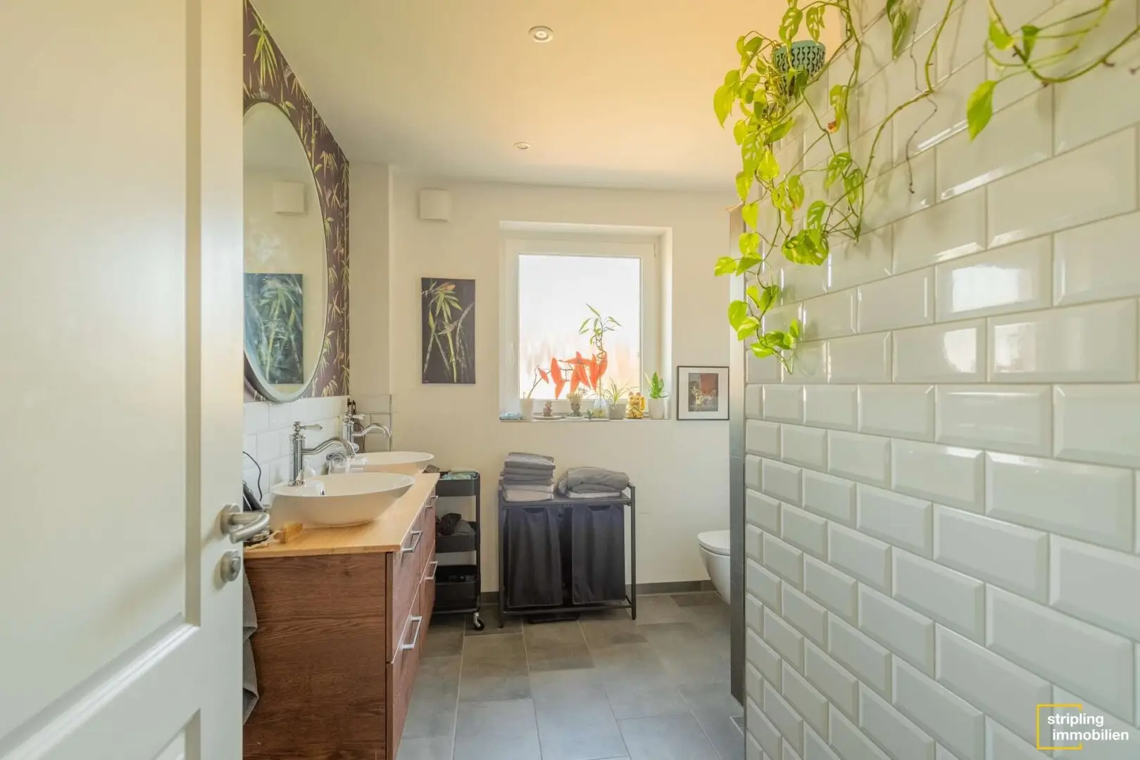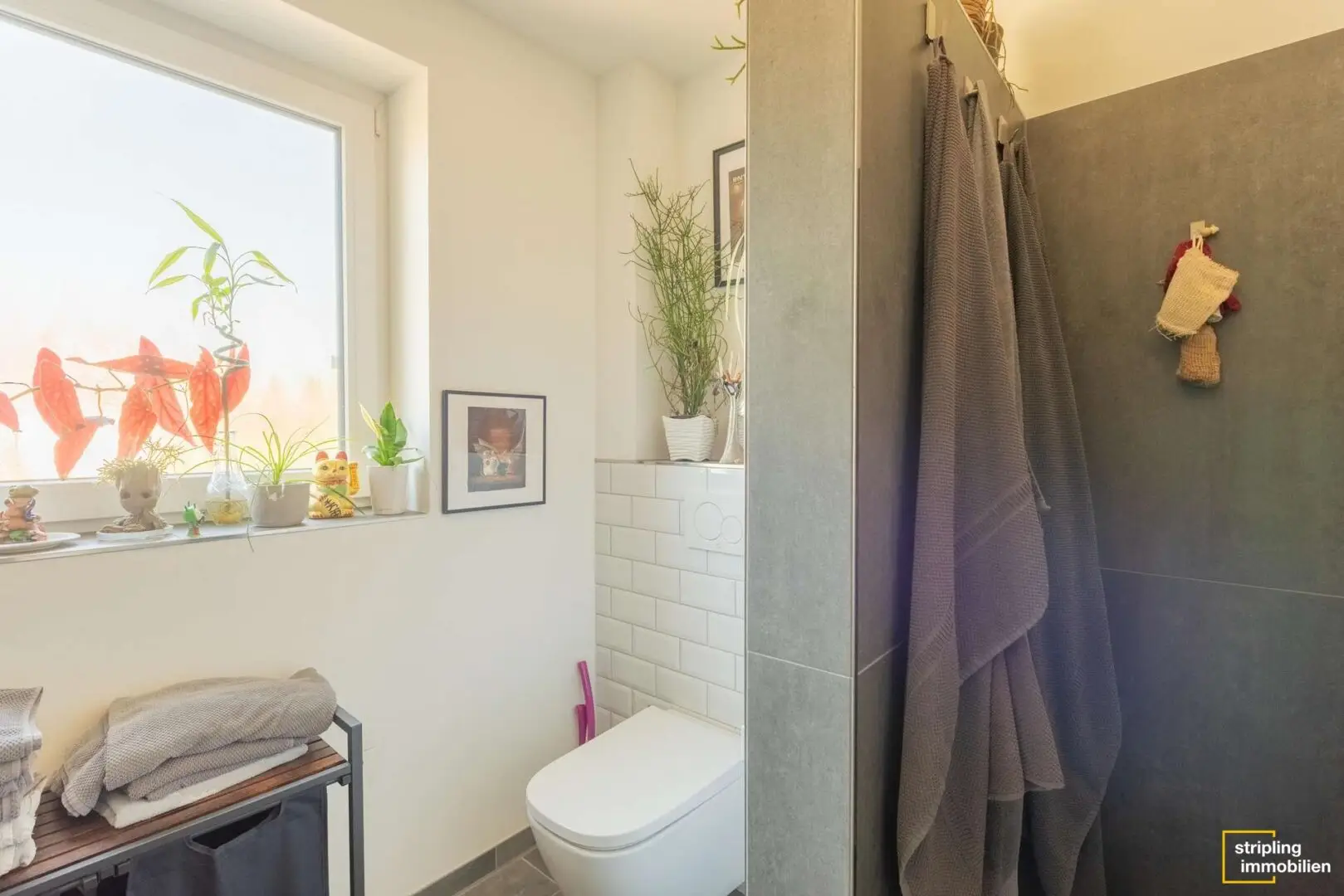 Das Badezimmer und ein Gäste-WC befinden sich auf gegenüberliegenden Seiten des Flures. Sie sind einheitlich in Grautönen und Weiß gefliest. Bei der Auswahl der Dekoration sind Ihnen also keine Grenzen gesetzt. Welche Farbakzente möchten Sie setzen? Die sanitären Anlagen sind hochwertig, die Dusche ist begehbar.