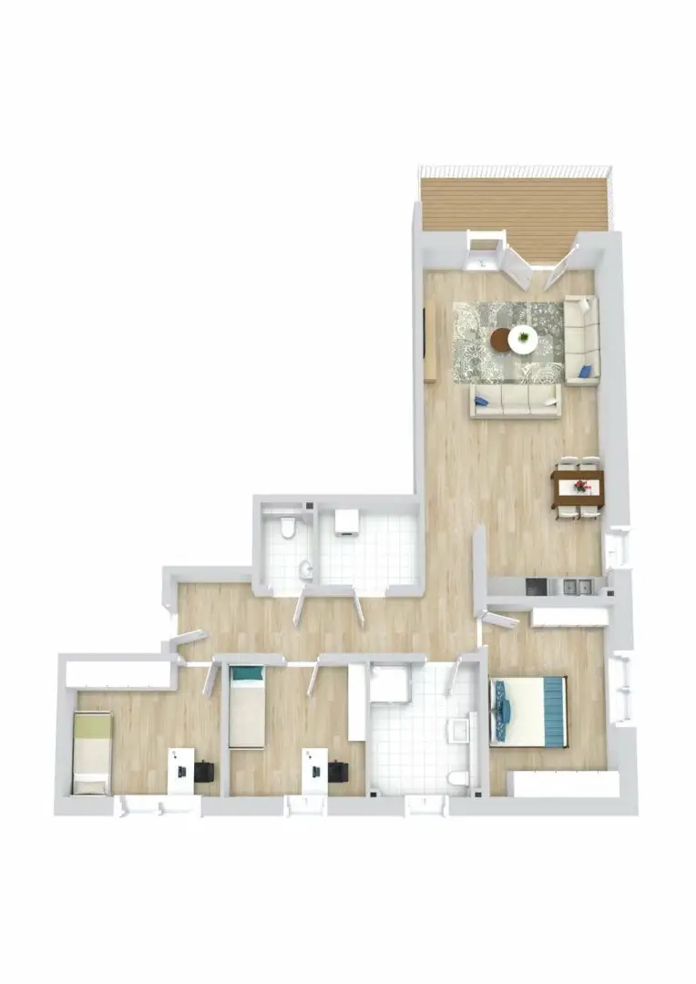 Die Wohnung hat eine Wohnfläche von etwa 107,39 m². Sie ist L-förmig geschnitten – jeder Raum ist direkt über einen Zugang vom Flur zu erreichen. Wenn Sie durch die Eingangstür eintreten, befindet sich auf der linken Seite eine Nische, die Platz für eine Garderobe bietet. Weitere Schuhschränke können bei Bedarf auf der rechten Seite des breiten Flures platziert werden.