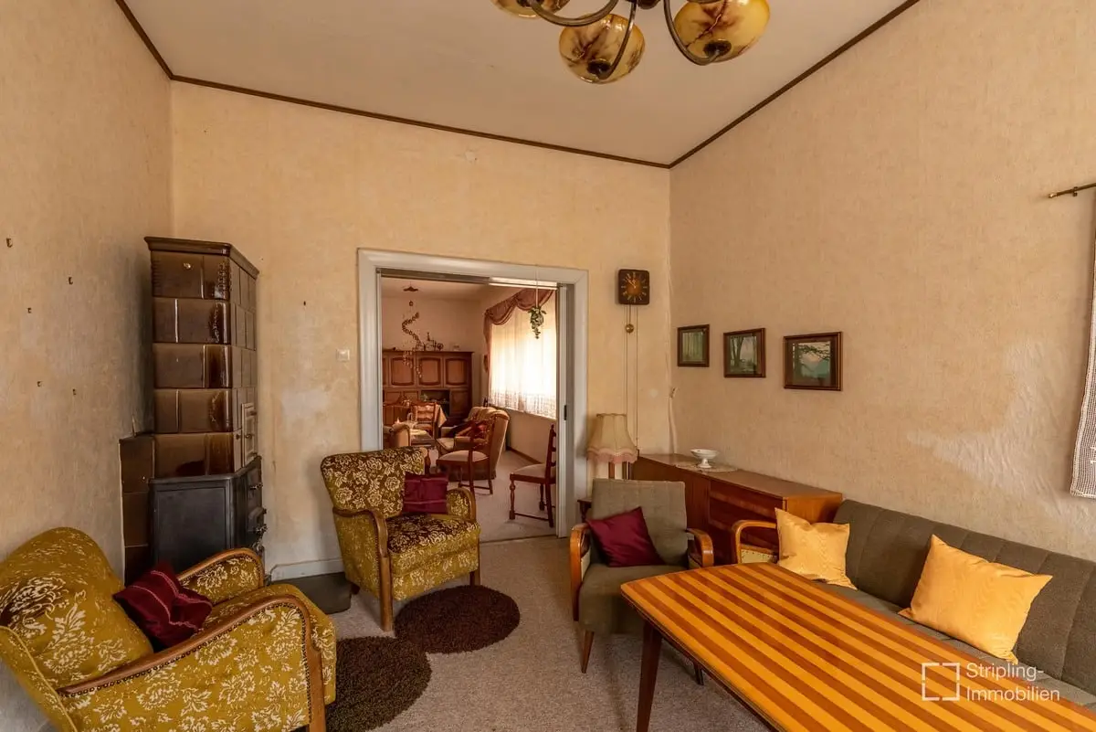 Gleich hinter dem Windfang liegt ein Flur, den man schon eher als Eingangshalle bezeichnen muss. Auf drei Metern Breite und zehn Metern Länge können Sie hier nicht nur Gäste begrüßen, sondern so manche Party abhalten. Einfach ein paar Tische aufstellen und die Feier kann starten. Rechts vom Flur liegen im Moment zwei Zimmer mit 16 und 26 m², die durch eine Schiebetür verbunden sind. Sie wurden als üppige Wohnlandschaft und Essbereich genutzt. Die hohen Decken des Erdgeschosses kommen hier besonders zur Geltung, denn in Verbindung mit den großen Fenstern ist alles hell und großzügig. Kaminöfen sorgen für gemütliche Wärme.