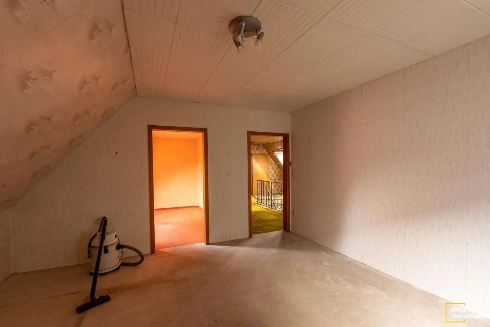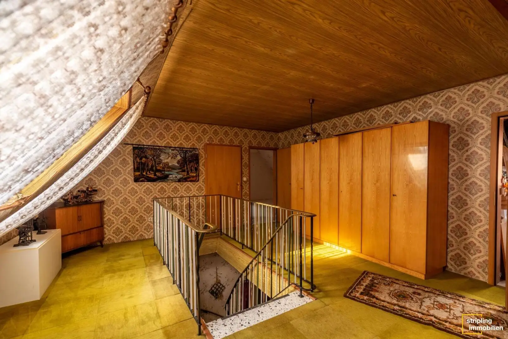 Durch das Treppenhaus kommen Sie ins Obergeschoss. Hier liegt ein großer Flur, den Sie vielleicht als Bibliothek, als Musik- oder als Spielzimmer benutzen könnten. Eine Tür führt auf den Boden mit viel Stauraum. Hinter den beiden anderen Türen liegen zum einen ein Kinderzimmer und zum anderen zwei Durchgangszimmer. Sie könnten sich ebenfalls als Schlafzimmer mit begehbarem Kleiderschrank anbieten.