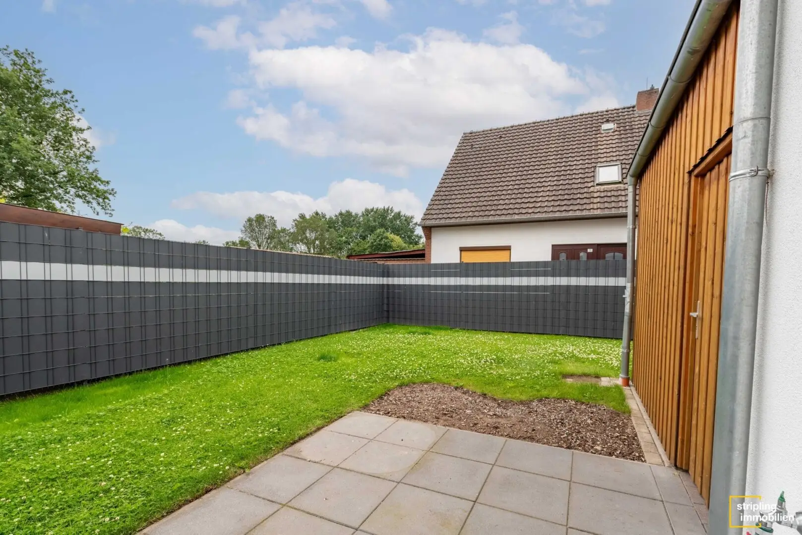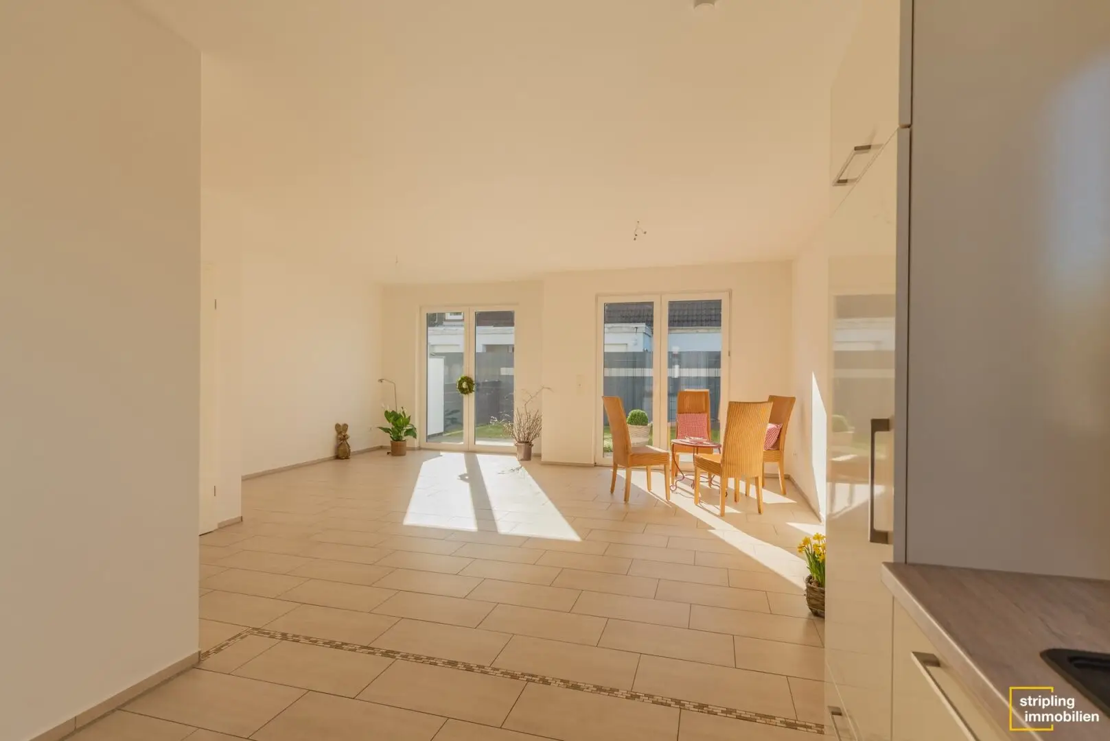 Eine Tür weiter gelangen Sie in die Wohnoase des Gebäudes. Auf etwas mehr als 39 m² kommen hier Wohn-, Esszimmer und Küche zusammen. In diesem gemütlichen Bereich trifft sich die Familie im Alltag, isst, lacht, redet und entspannt. Genauso gut werfen Sie hier das nächste Familienfest oder laden zu einer Cocktailparty ein. Über die beiden doppelten Terrassentüren betreten Sie die großzügige Terrasse mit Ausrichtung nach Südosten und den gepflegten Rasen, der das Haus umgibt. Auf dieser Fläche toben sich Kinder aus oder Sie verwöhnen Ihre Gäste mit einem Barbecue. Sogar an den Familienhund wäre gedacht, denn das Grundstück hat ordentliche 325 m² und ist komplett umzäunt.