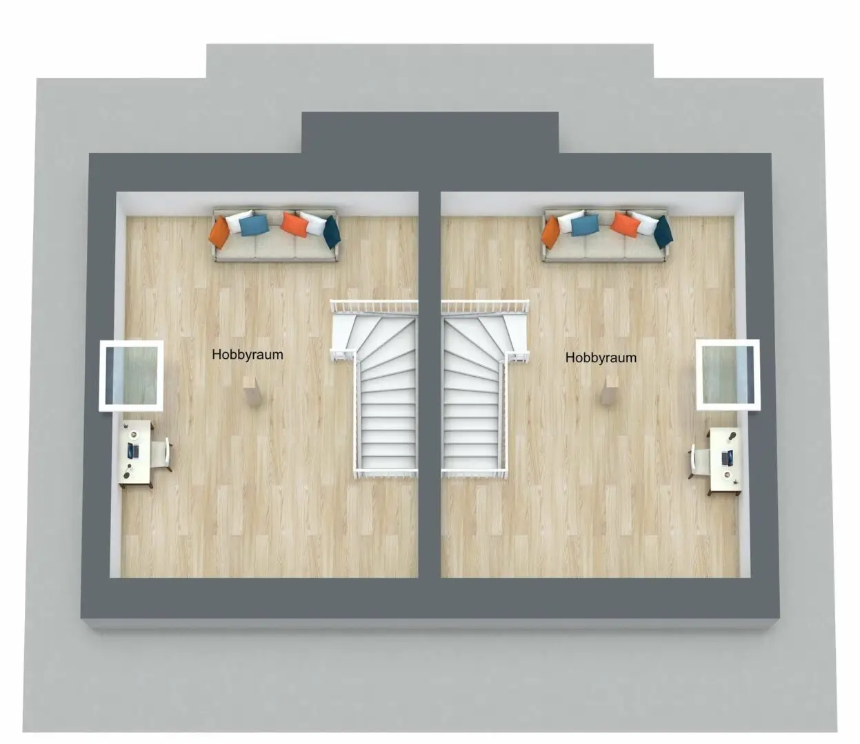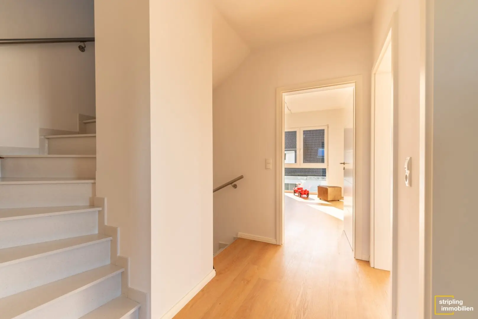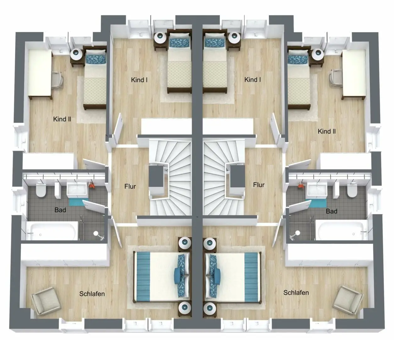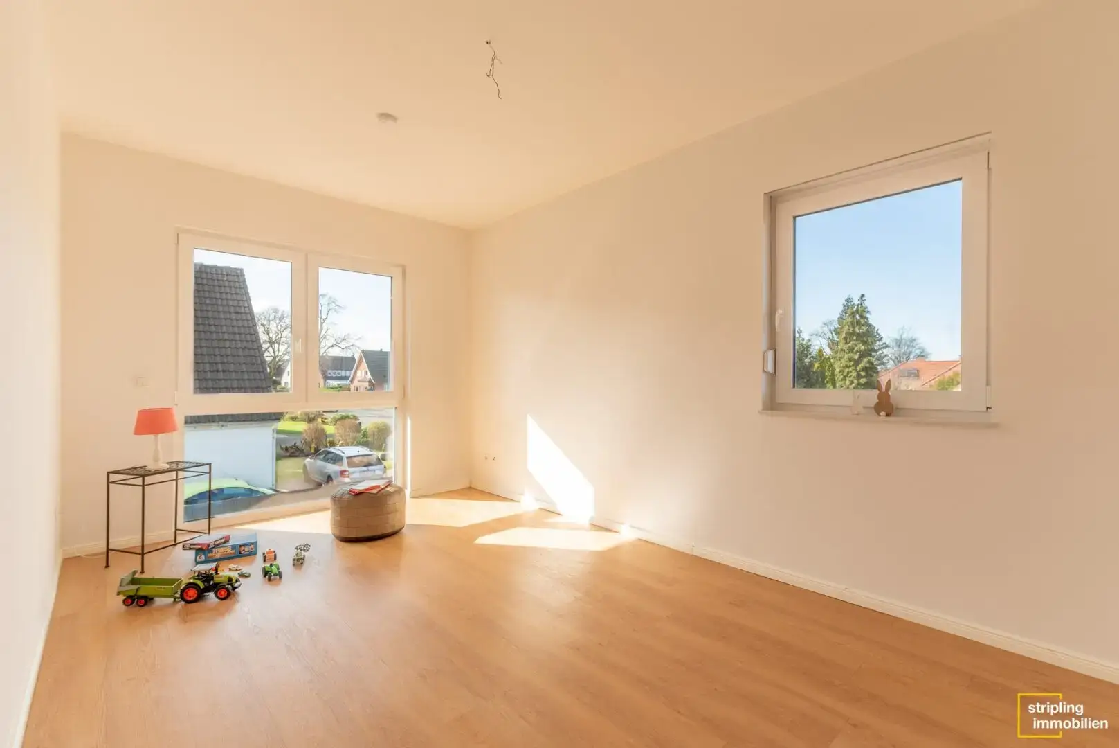 Im ersten Obergeschoss befinden sich die drei wunderschönen Schlafzimmer. Der Boden ist hochwertiges Vinyl in stilvollem Holzdesign. Die hellen Räume, die für die Kinder vorgesehen sind, punkten durch die gute Größe und jeweils einem bodentiefen Fensterausschnitt. Durch das feste Glas in Bodennähe ist er kindersicher. Das üppige Schlafzimmer nimmt die gesamte Hausbreite ein. Ein stattlicher Kleiderschrank passt hinein und es ist sogar ein begehbarer Bereich aus Schränken denkbar.