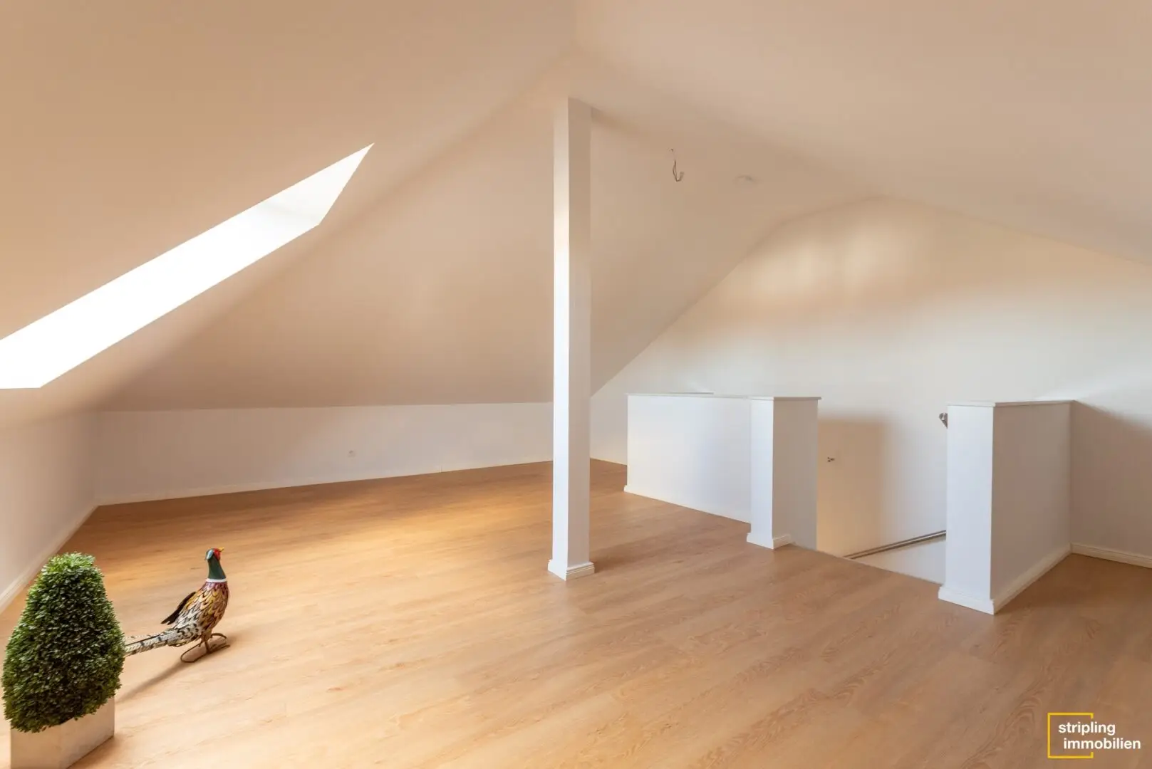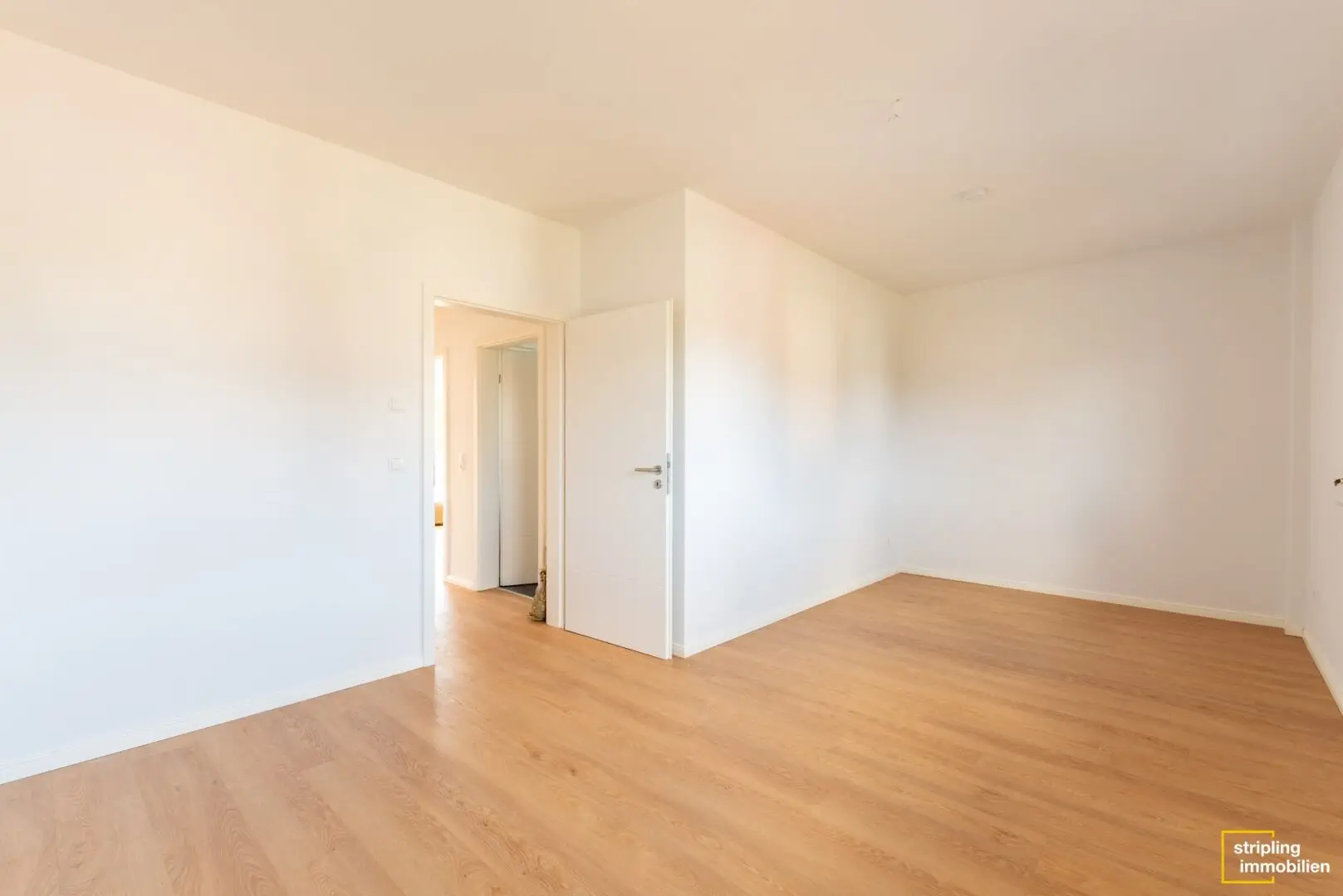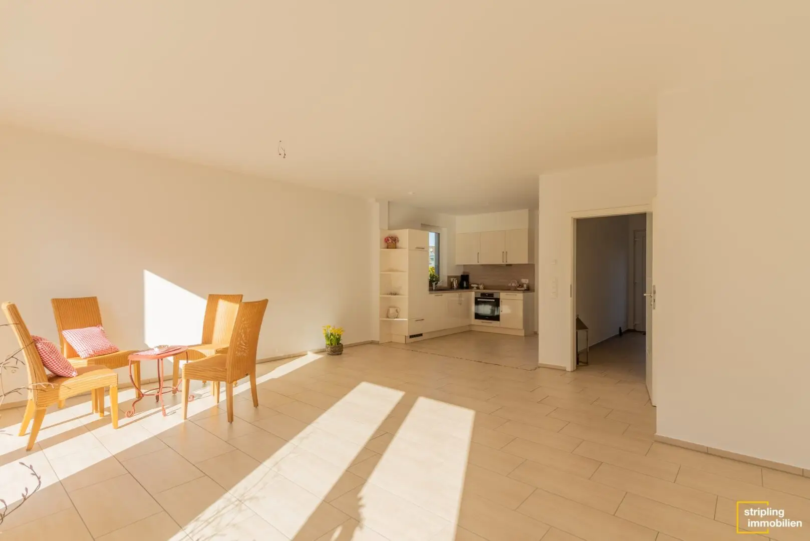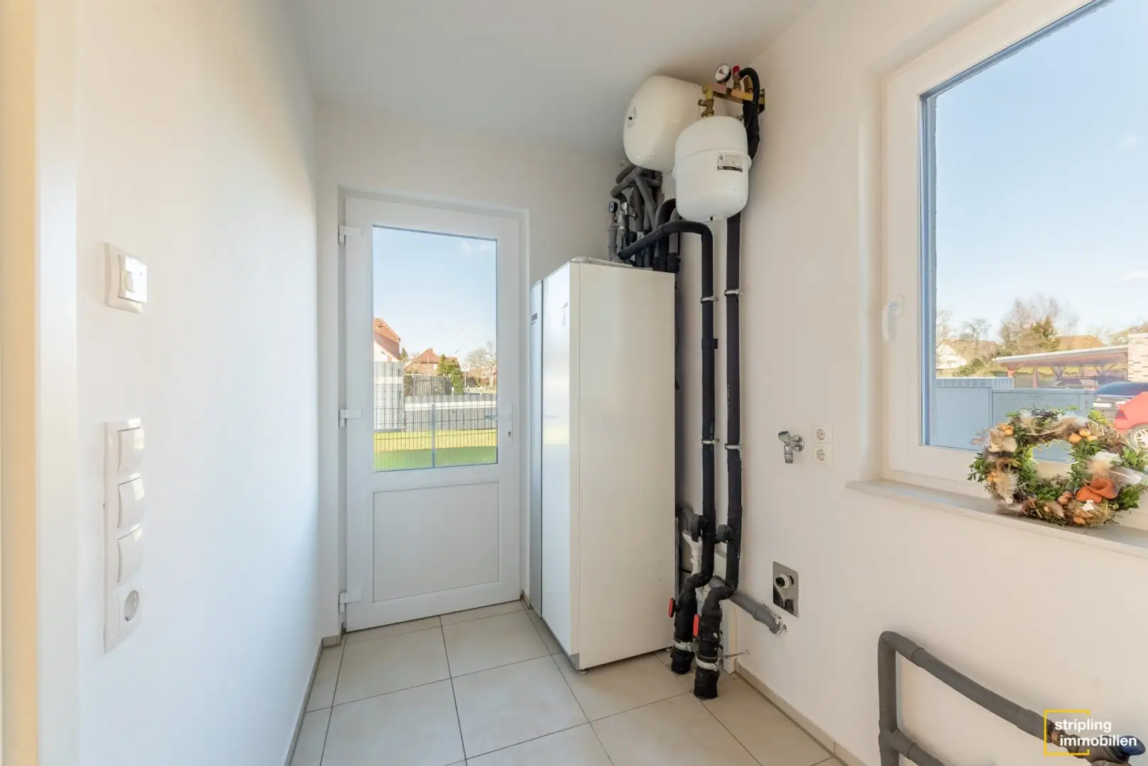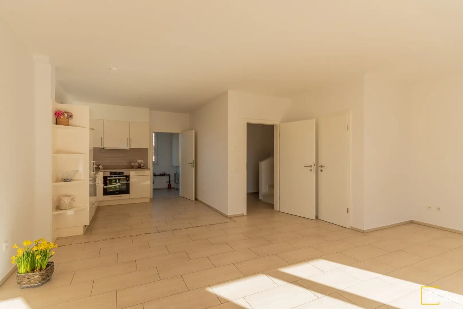 In der offenen Küche finden Sie bereits Einbaumöbel mit eleganten Fronten im Vanilleton vor. Nebenan gibt es eine Tür, die in den Technikraum führt. Er hat eine separate Eingangstür vom Hof aus. Dadurch bringen Sie Ihre Einkäufe auf direktem Weg vom Auto in die Küche. Ein Regal für Vorräte hätte hier anstandslos Platz. Für mehr Stauraum gibt es noch eine Abstellkammer auf diesem Stock.