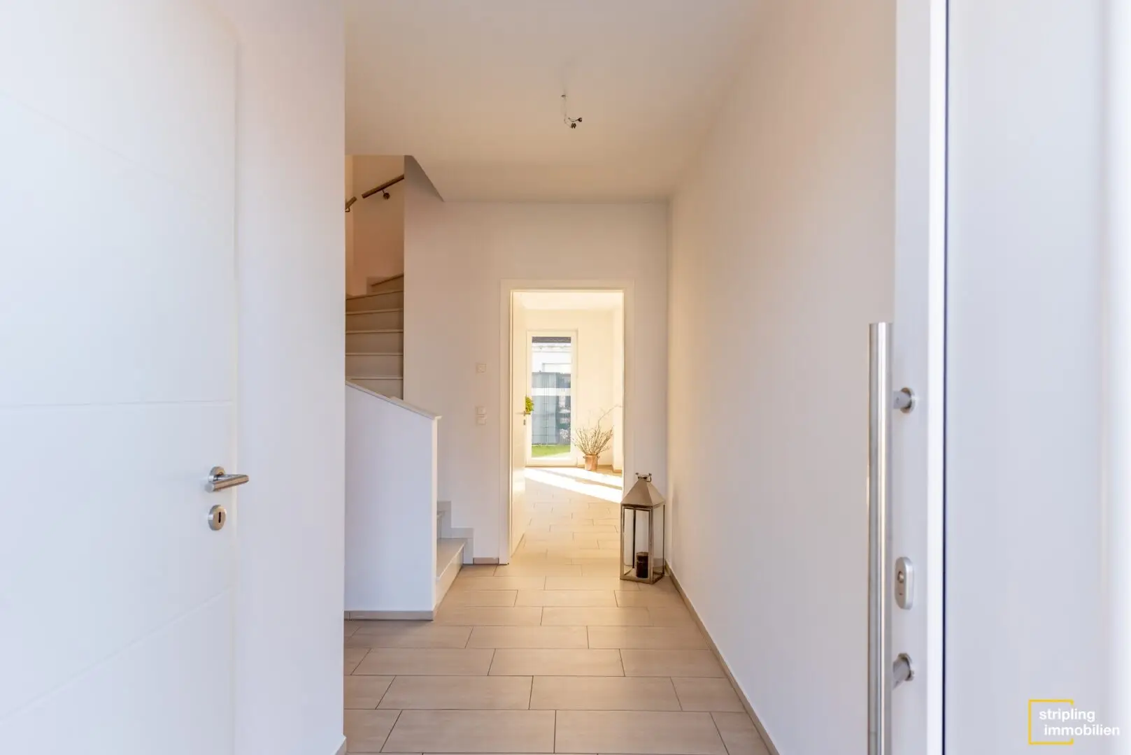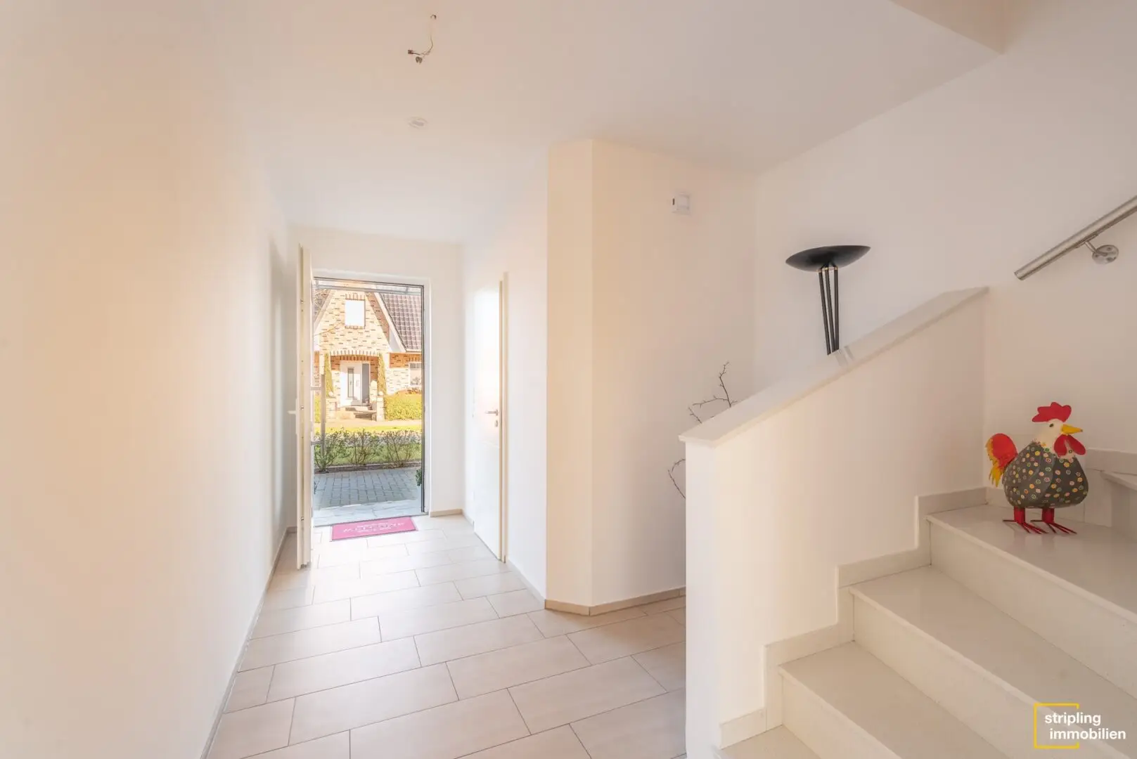 Im Eingangsbereich fällt die exquisite Ausstattung ins Auge. Die Zimmertüren kleiden sich in angesagtes Weiß und die großformatigen, beigen Bodenfliesen verleihen Helligkeit und Weite. Gleich neben der Tür befindet sich das Gäste-WC mit eigener Dusche und großem Fenster. Genau wie das Hauptbad im ersten Stock ist es mit anthrazitfarbenen Fliesen am Boden belegt und die Wände haben als schicken Kontrast einen weißen Fliesenspiegel.