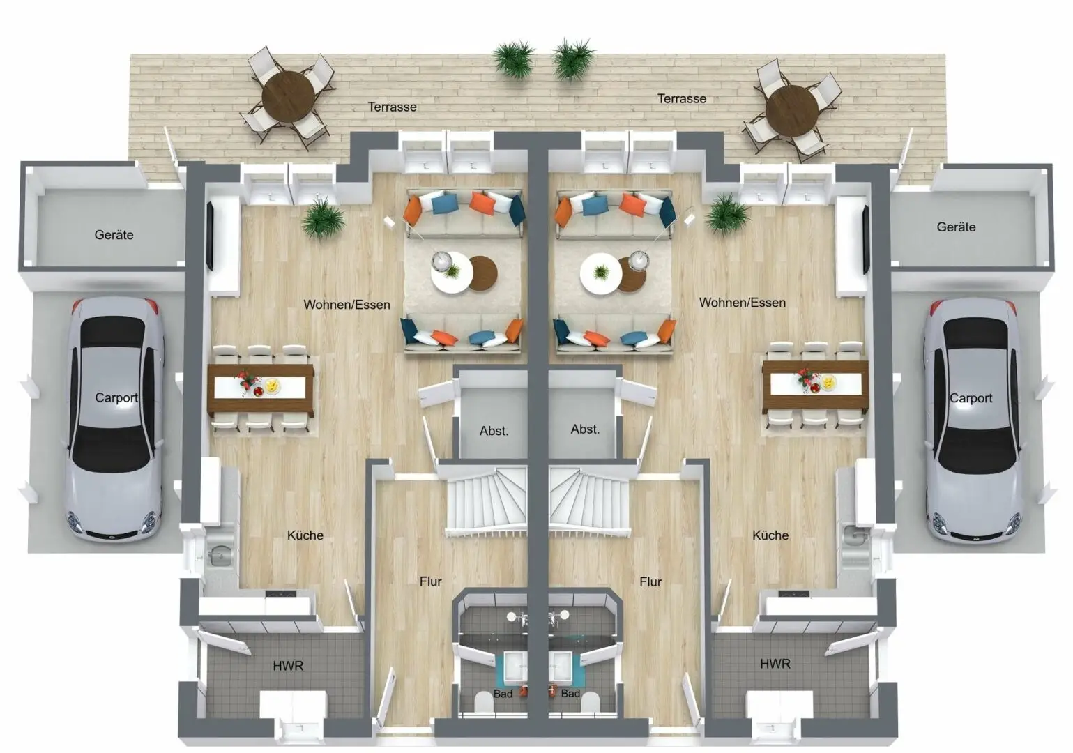 Das Badezimmer befindet sich ebenfalls auf diesem Stockwerk und beherbergt eine bodenebene Dusche. Wer zwischendurch ein entspanntes Bad nehmen möchte, lässt sich genüsslich in die geräumige Wanne gleiten. An Zimmern noch nicht genug, hält die Doppelhaushälfte noch einen weiteren Raum im Dachgeschoss bereit. Unter den heimeligen Dachschrägen richten Sie ein Homeoffice ein oder üben ein Hobby aus, bringen Gäste unter oder nutzen es für eine friedliche Stunde mit einem Buch. Damit nicht nur die Menschen einen Platz für sich haben, gibt es auf dem Grundstück ein Carport sowie einen weiteren Stellplatz für die motorisierten Gefährte. Fahrräder, Kinderspielzeug und Gartengeräte kommen in dem kleinen Geräteraum des Carports unter.
