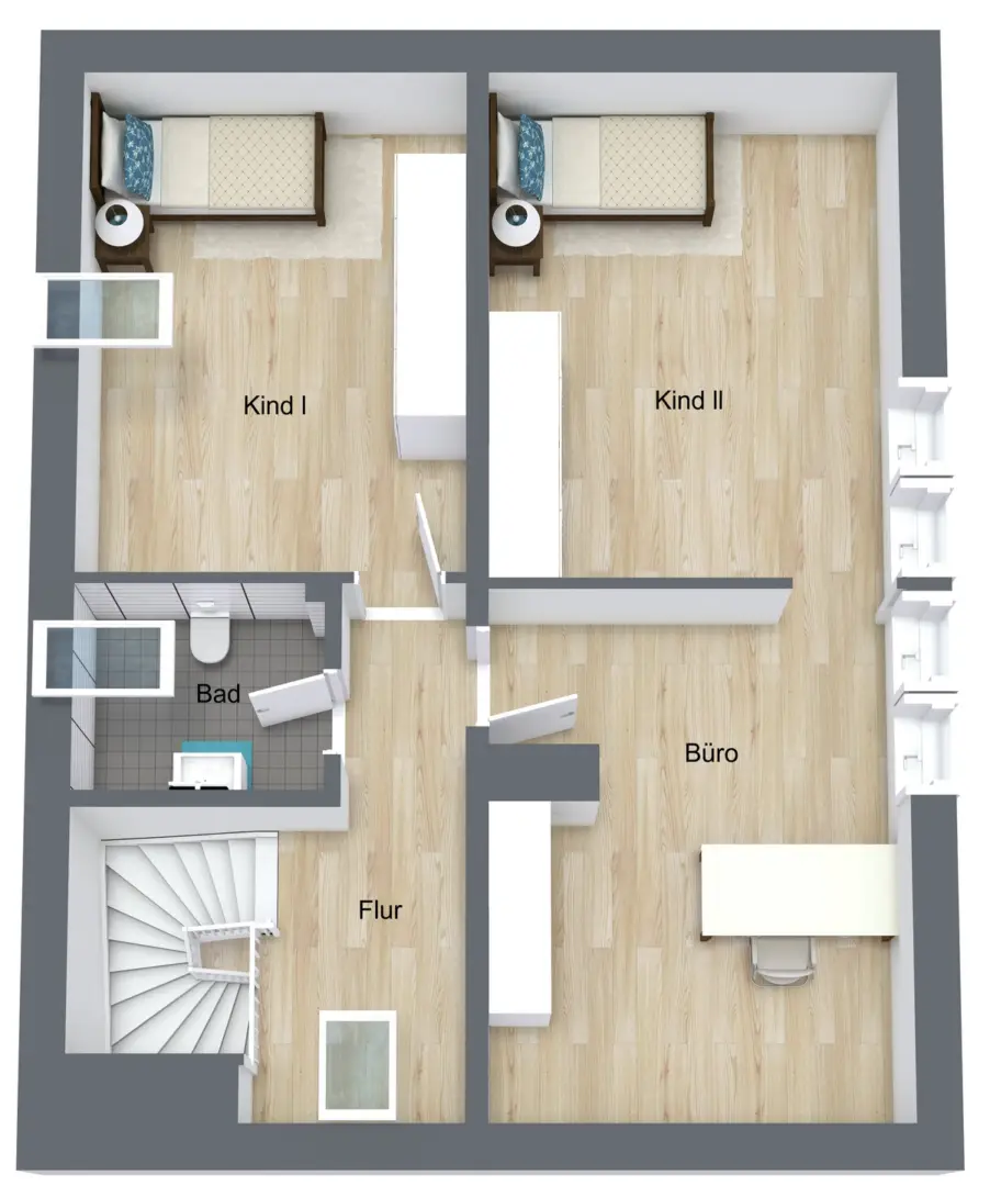 Im Obergeschoss besitzt das Einfamilienhaus weitere drei Zimmer, von denen eines ein Durchgangszimmer ist. Es würde sich als Spielezimmer für zwei Kinder anbieten oder ein schickes Büro. Vielleicht planen Sie auch eine Bibliothek mit Leseecke – lassen Sie Ihrer Fantasie freien Lauf. Die beiden anderen Räume können als Kinder- oder Gästezimmer fungieren. Eines der Zimmer hat bereits Anschlüsse für eine Küche. Ideal, wenn Ihre Kinder später einmal ein eigenes Reich benötigen. Außerdem liegt auf diesem Stockwerk ein hübsches Kinderbad mit WC und Waschbecken.