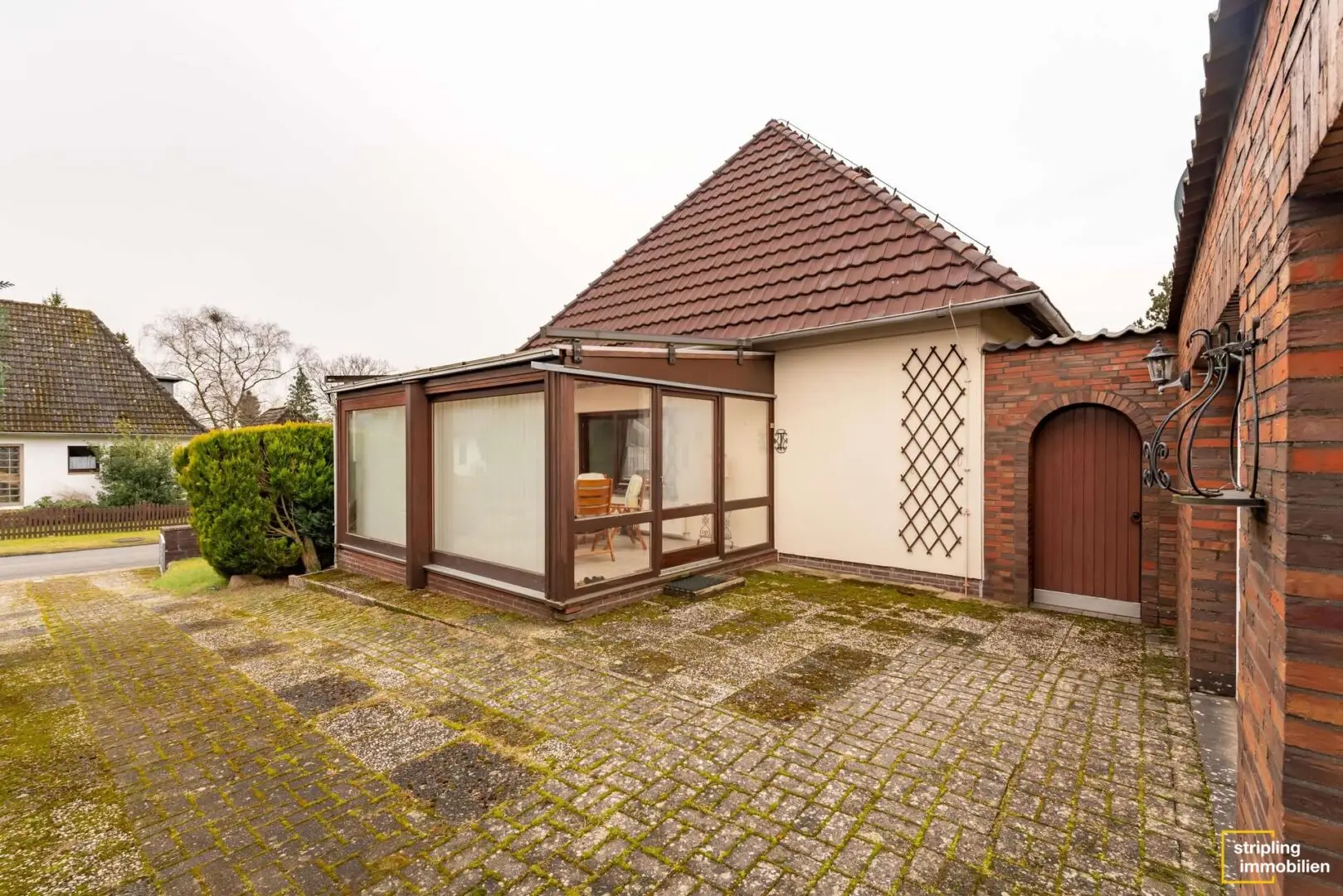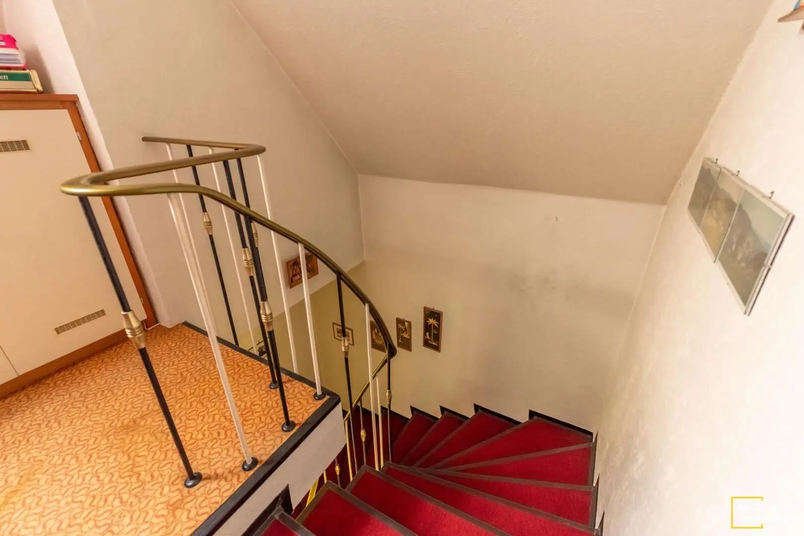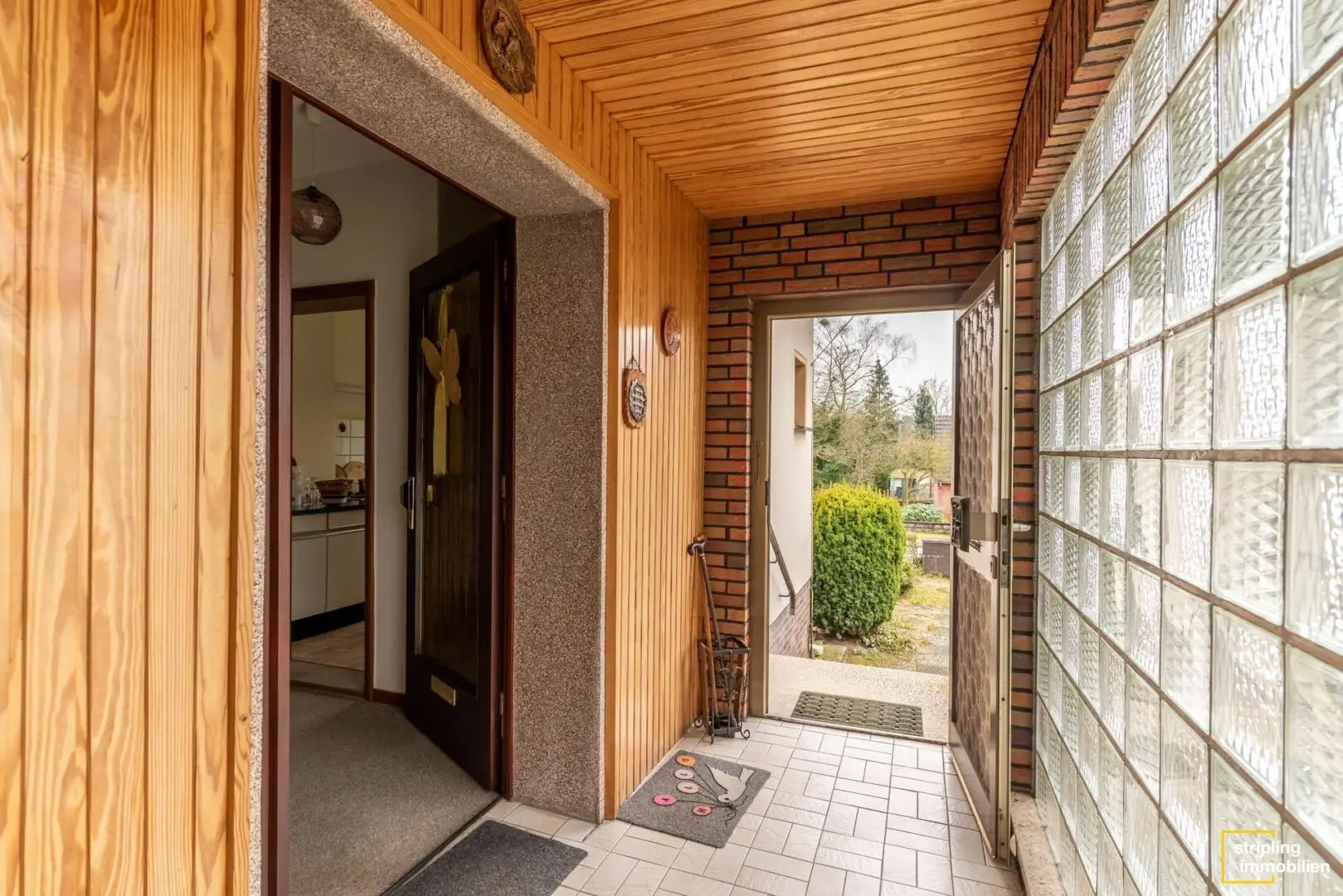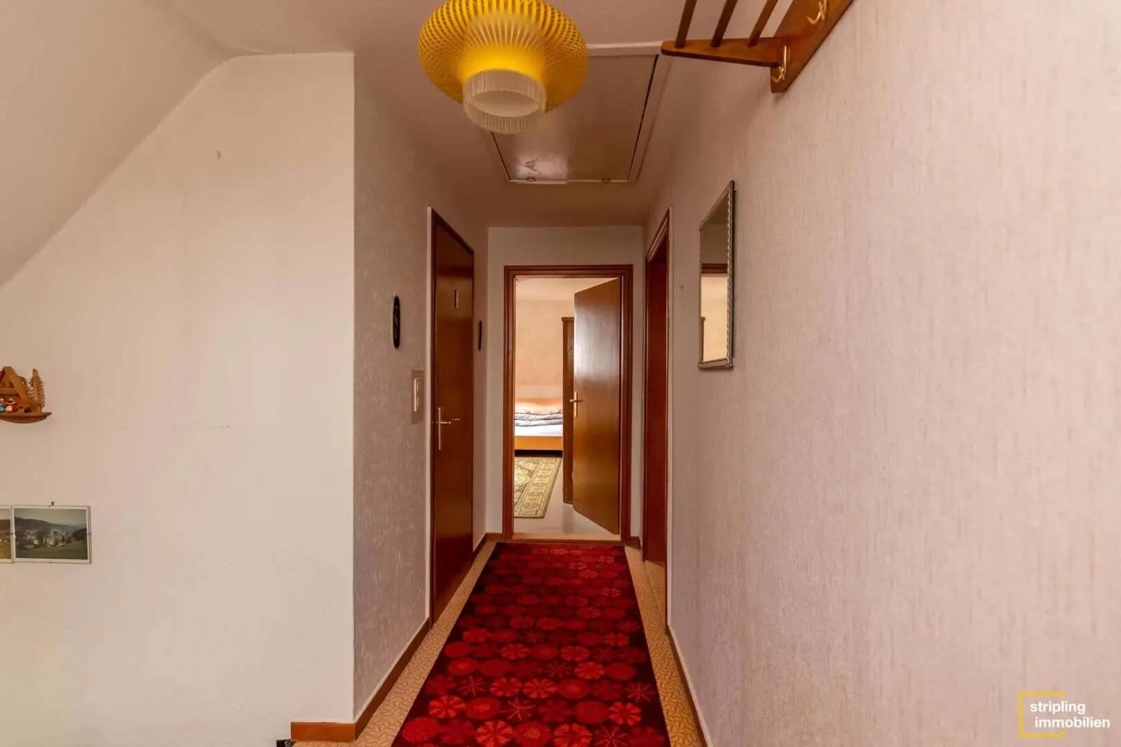 Das Haus selbst steht auf großzügigen 1020 m², mit zwei vollwertigen Garagen und einer schönen Einfahrt. Durch ein kleines Gartentor gehen Sie auf den Eingang zu, der einen Vorbau mit eigener Haustür besitzt. Zum einen ist so ein Windfang energetisch interessant, zum anderen bietet er zusätzlichen Raum für Schuhe, Stiefel, Jacken und Schirme. Davon profitiert der offen wirkende Flur hinter der eigentlichen Haustüre. Er muss nicht wie in vielen anderen Objekten als Stauraum herhalten, sondern kann liebevoll mit einigen ausgewählten Dekoelementen ausgestattet werden. Den Blick zieht im Empfangsbereich jedoch die gewendelte Treppe mit dem herrlichen 60er-Jahre Flair auf sich. Sie endet im Obergeschoss mit einer kleinen Galerie.
