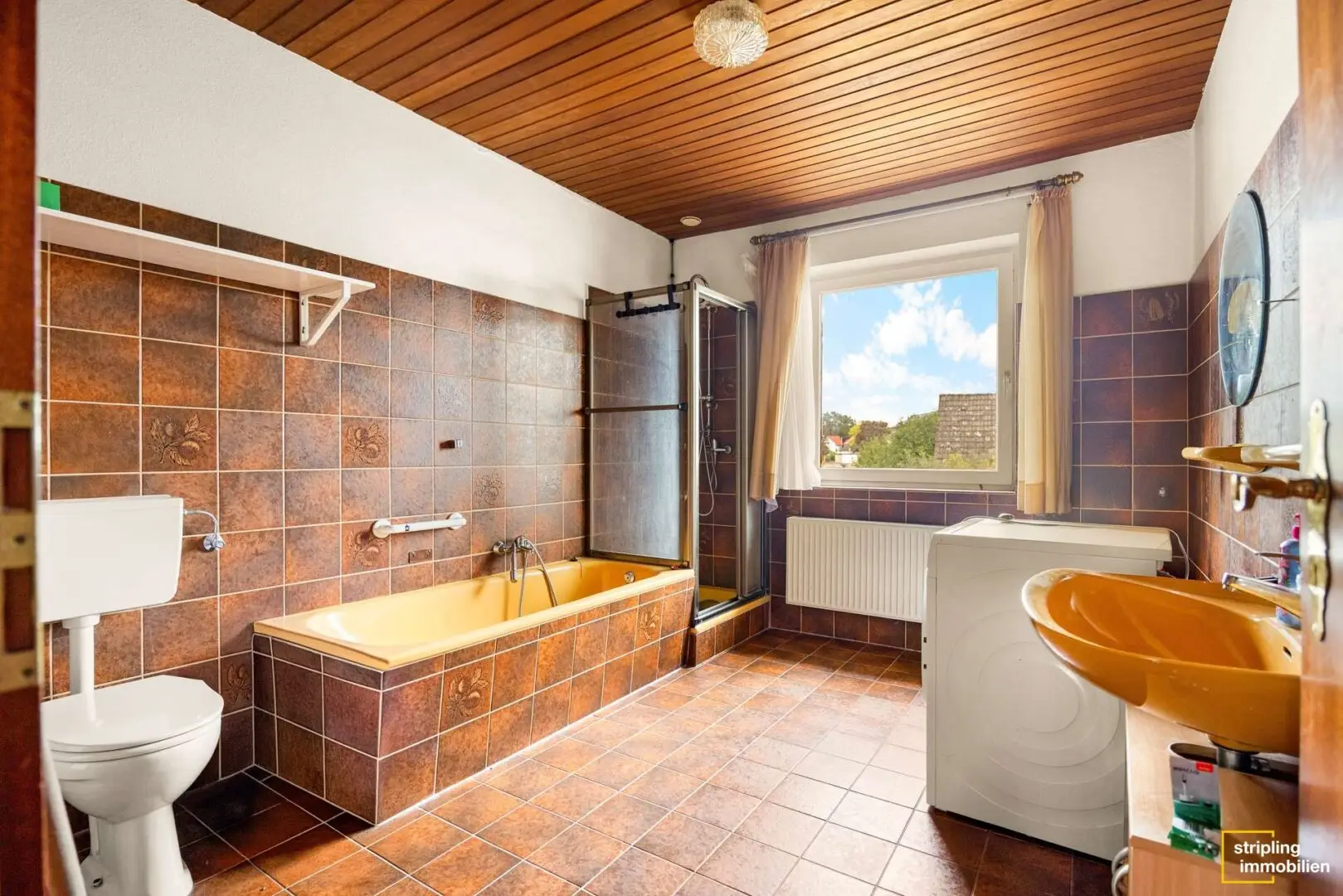 Über eine Holztreppe gelangt man ins Obergeschoss mit drei gut geschnittenen Schlafzimmern. Das Badezimmer mit Badewanne, Dusche, WC, Waschbecken und Fenster bietet eine solide Grundlage für eine stilvolle Renovierung. Ein besonderes Plus ist die Sauna, die private Wellnessmomente ermöglicht. Der Dachboden ist bislang nicht ausgebaut, bietet aber wertvolles Potenzial für zusätzlichen Wohn- oder Nutzraum.