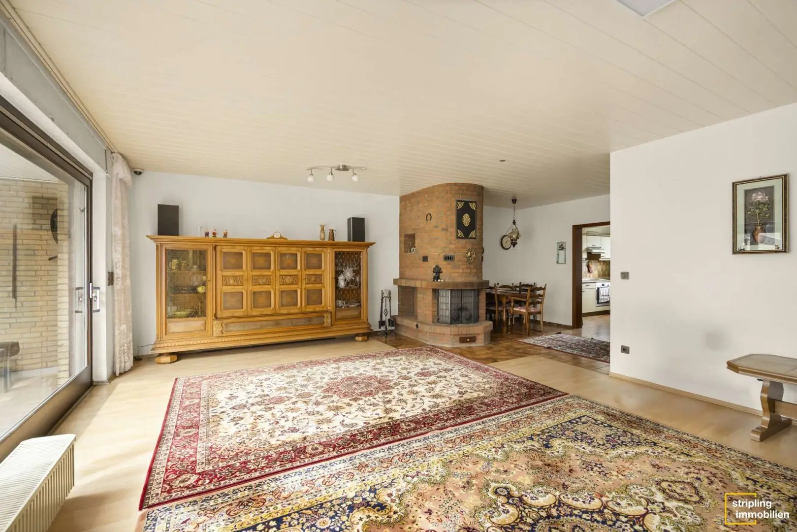 Im Erdgeschoss öffnet sich der rund 33 m² große Wohnbereich mit direktem Zugang zur Terrasse in Südausrichtung. Großzügige Fensterfronten lassen viel Tageslicht herein und schaffen eine freundliche Atmosphäre. An kühlen Abenden sorgt der gemauerte Kamin für wohlige Wärme – ein Platz, an dem Familie und Freunde gerne zusammenkommen.