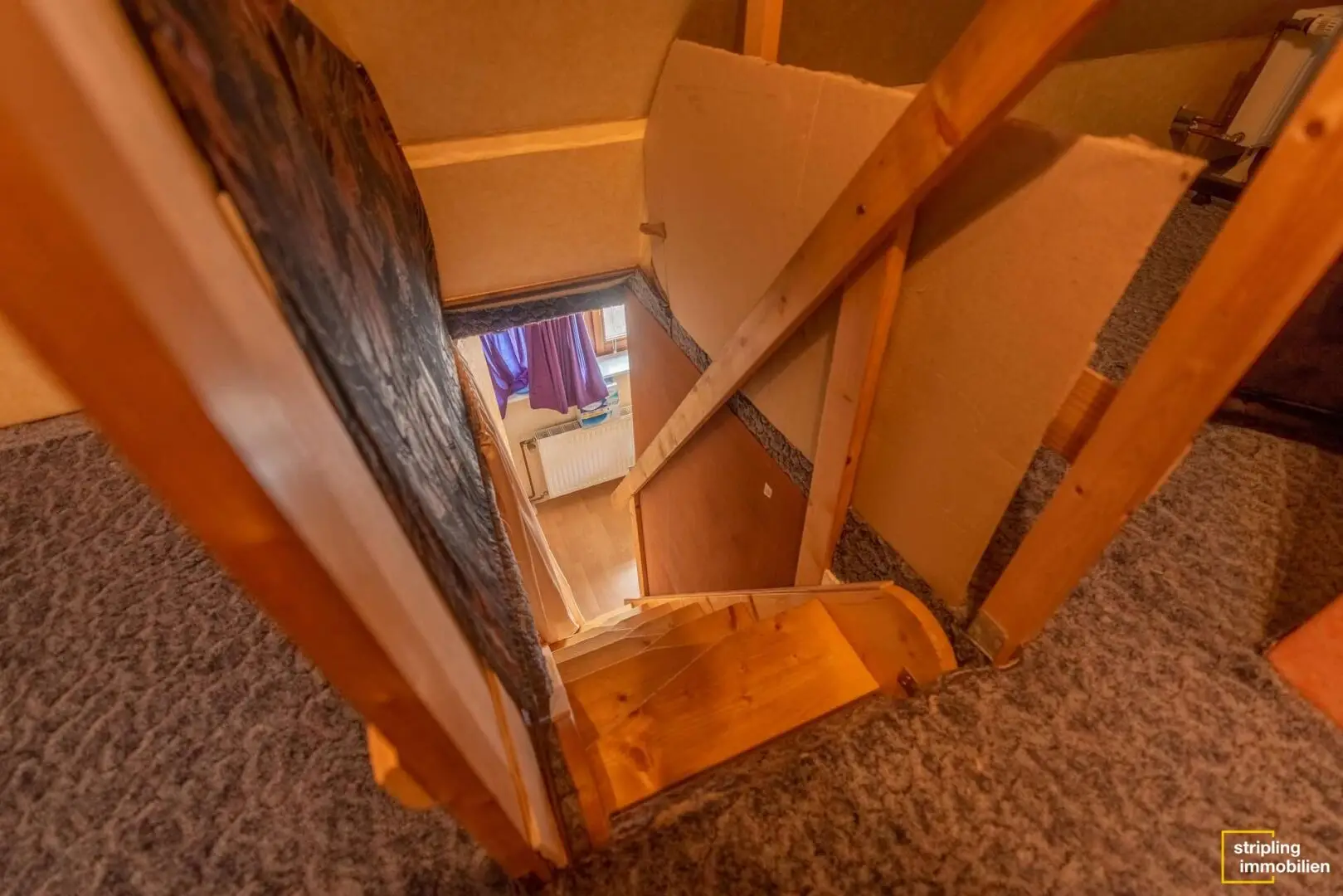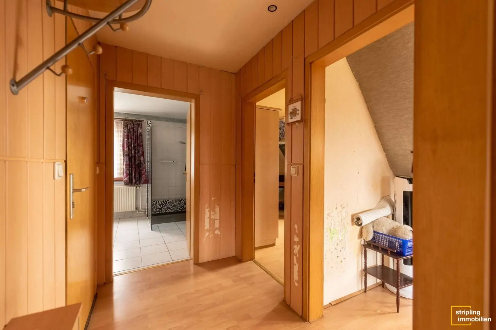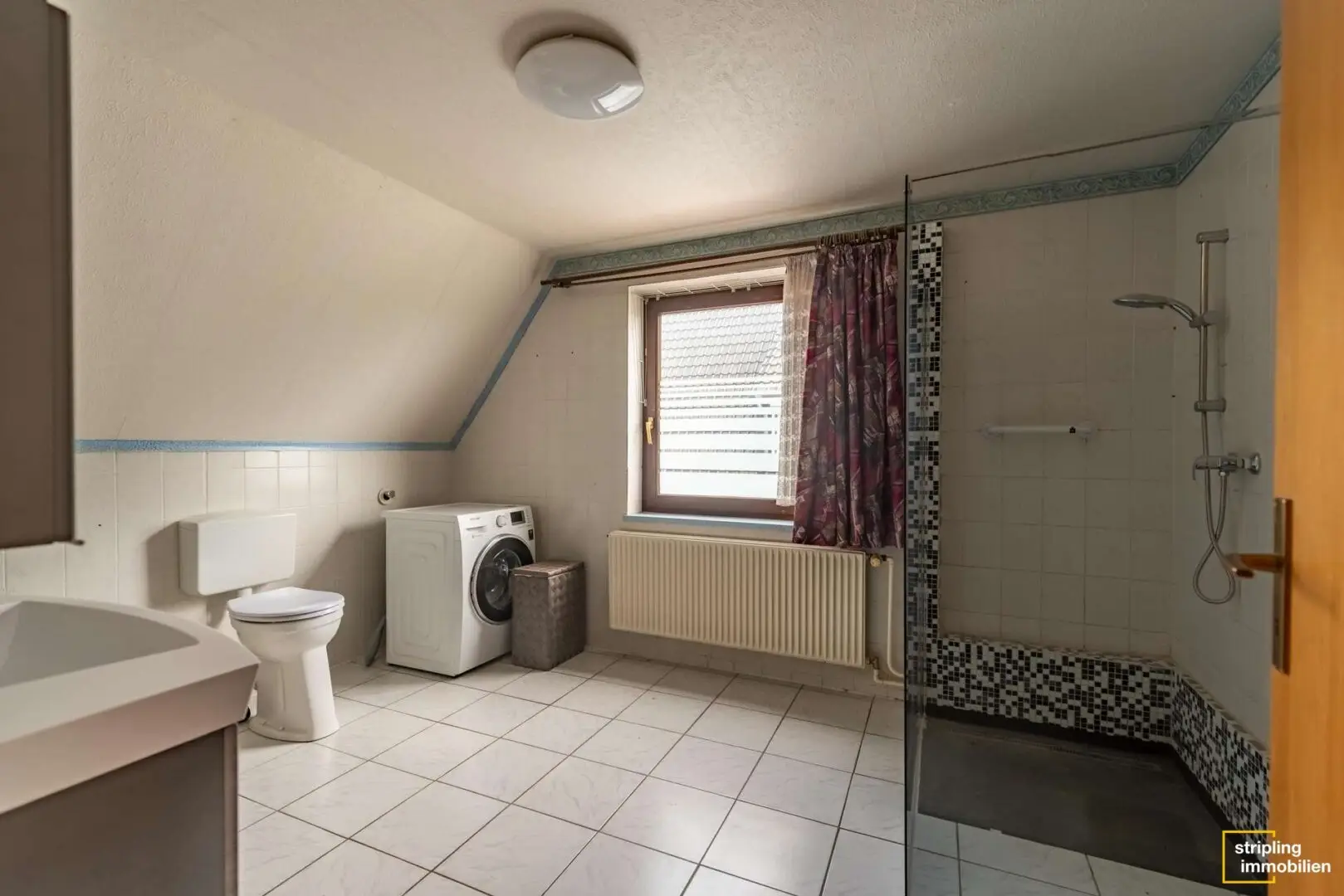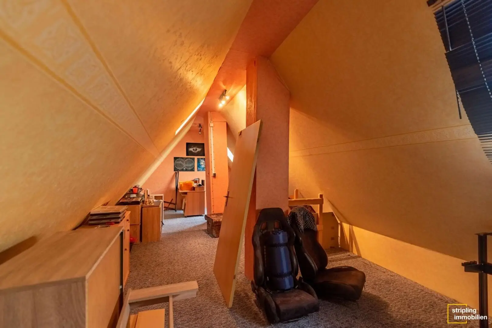 Stauraum ist in diesem großzügigen Einfamilienhaus ebenfalls vorhanden: Direkt hinter dem Flur im 1. Stock liegt ein praktischer Abstellraum. Von einem der Kinderzimmer führt eine Leiter nach oben in den Dachboden. Dieser ist ausgebaut und bietet viel Potenzial, lässt sich alternativ aber ebenfalls als Stauraum nutzen. Darüber hinaus ist die Immobilie unterkellert und bietet eine Garage. Bis zu vier Autos finden in der Garage sowie auf der Zufahrt Platz.