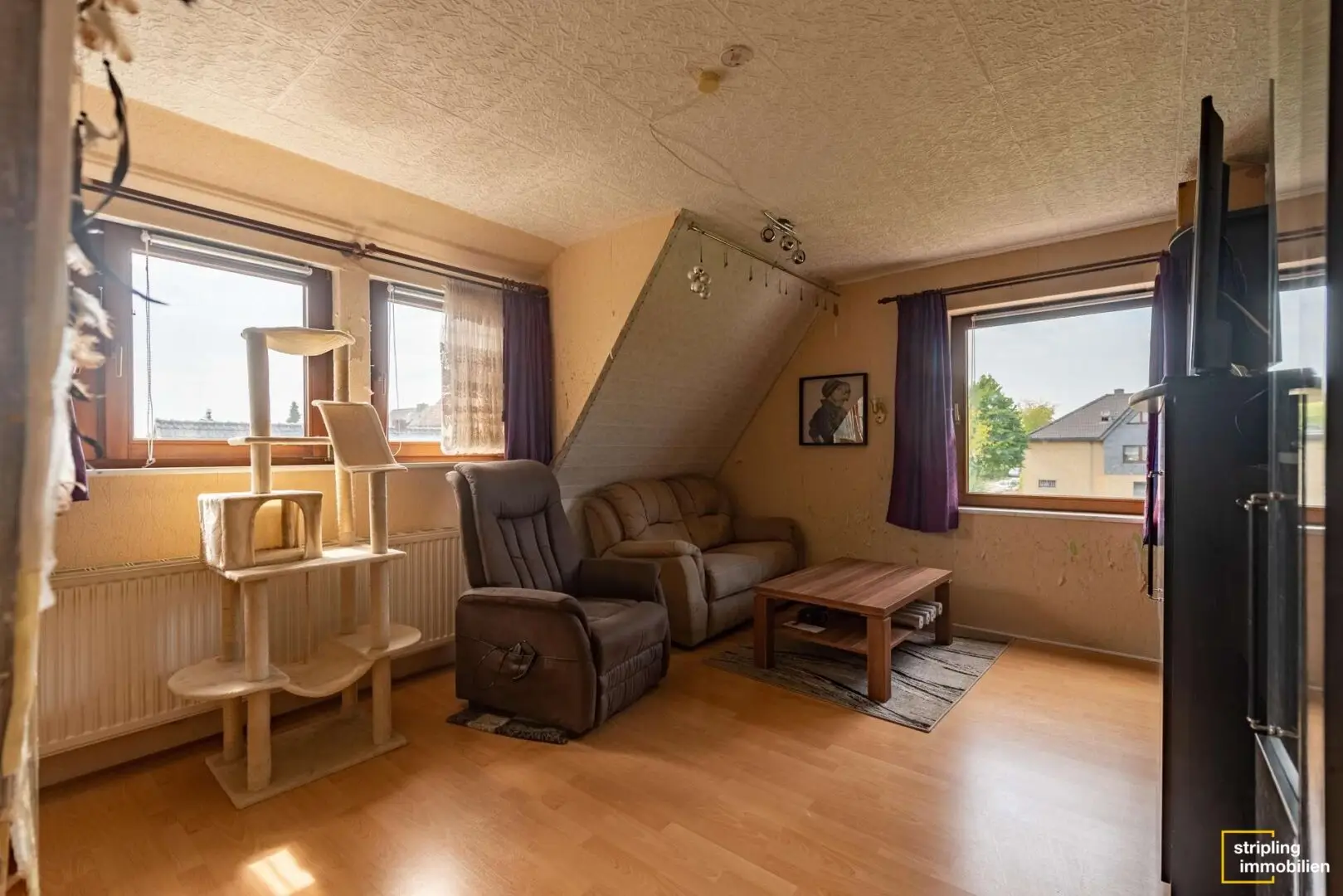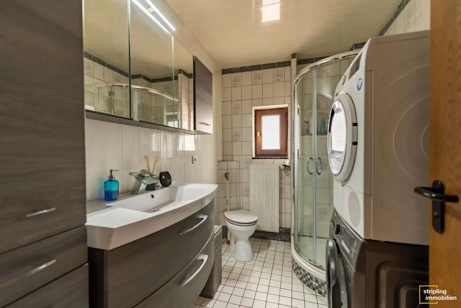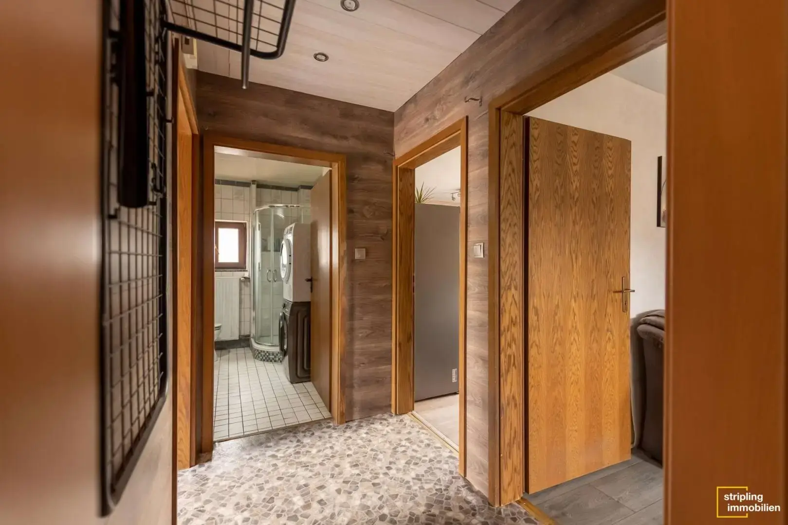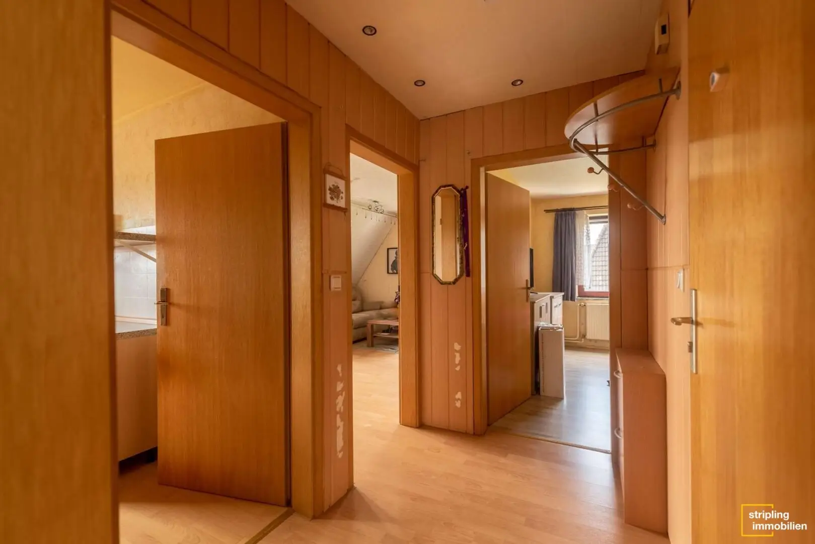 Stauraum ist in diesem großzügigen Einfamilienhaus ebenfalls vorhanden: Direkt hinter dem Flur im 1. Stock liegt ein praktischer Abstellraum. Von einem der Kinderzimmer führt eine Leiter nach oben in den Dachboden. Dieser ist ausgebaut und bietet viel Potenzial, lässt sich alternativ aber ebenfalls als Stauraum nutzen. Darüber hinaus ist die Immobilie unterkellert und bietet eine Garage. Bis zu vier Autos finden in der Garage sowie auf der Zufahrt Platz.