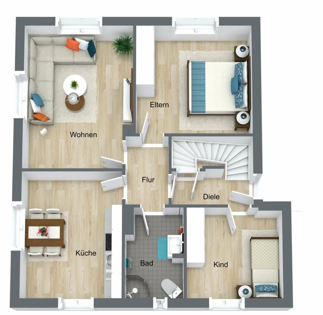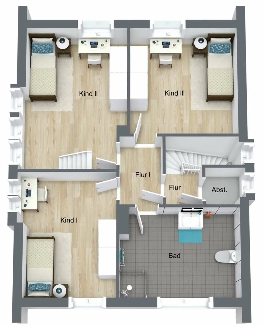 Rechts von der Haustür führt eine Holztreppe in das Obergeschoss der Immobilie. Hier befinden sich drei weitere geräumige Schlafzimmer, die sehr gut für Kinder geeignet sind. Sie alle haben ausreichend Platz für ein Bett, einen Schrank, einen Schreibtisch und weitere Einrichtungsgegenstände. Zudem gibt es ein großes Badezimmer, in dem sich aktuell eine Dusche befindet. Auch WC und Waschbecken sind vorhanden. Auf Wunsch ist hier ausreichend Platz, um eine Badewanne einzubauen.