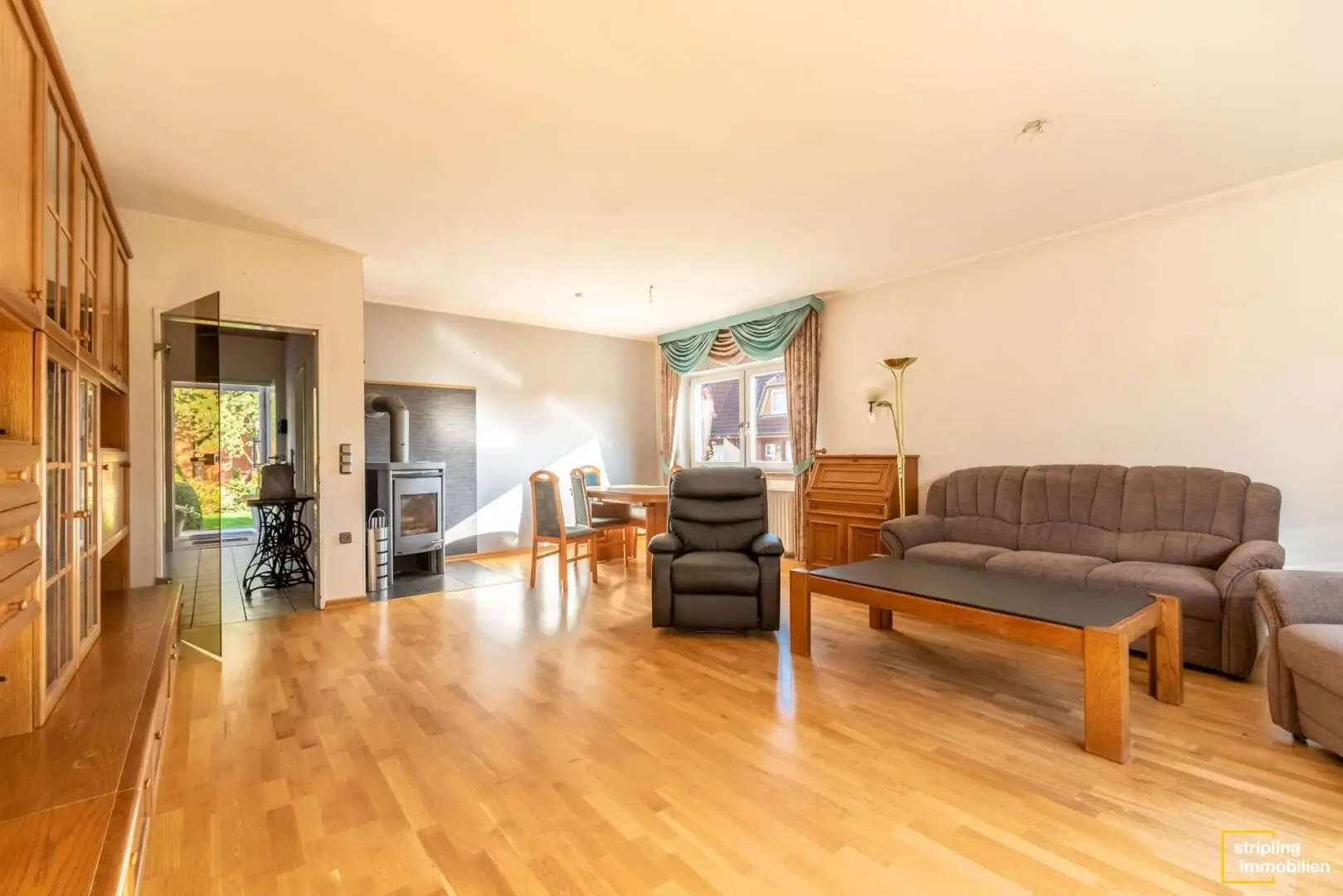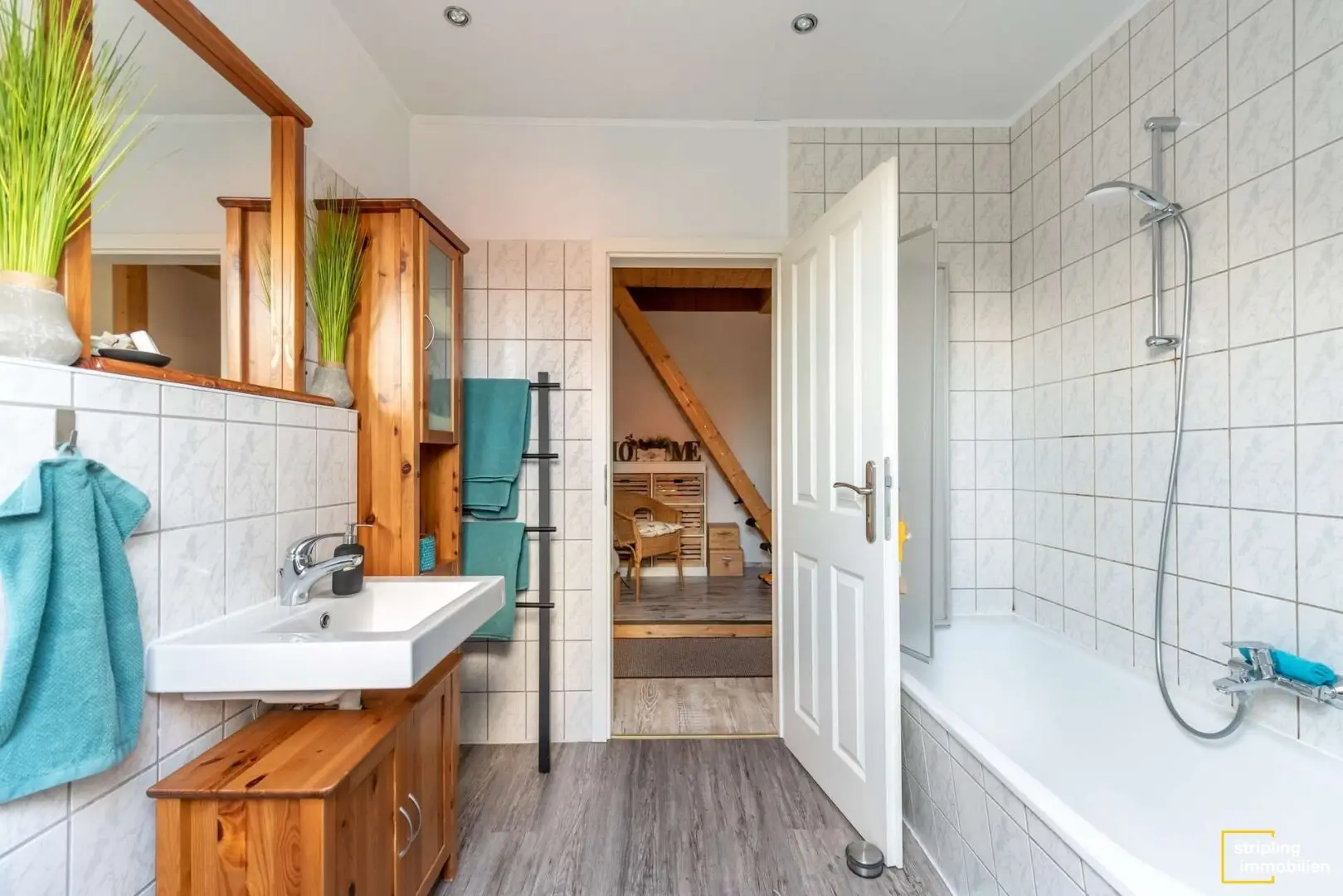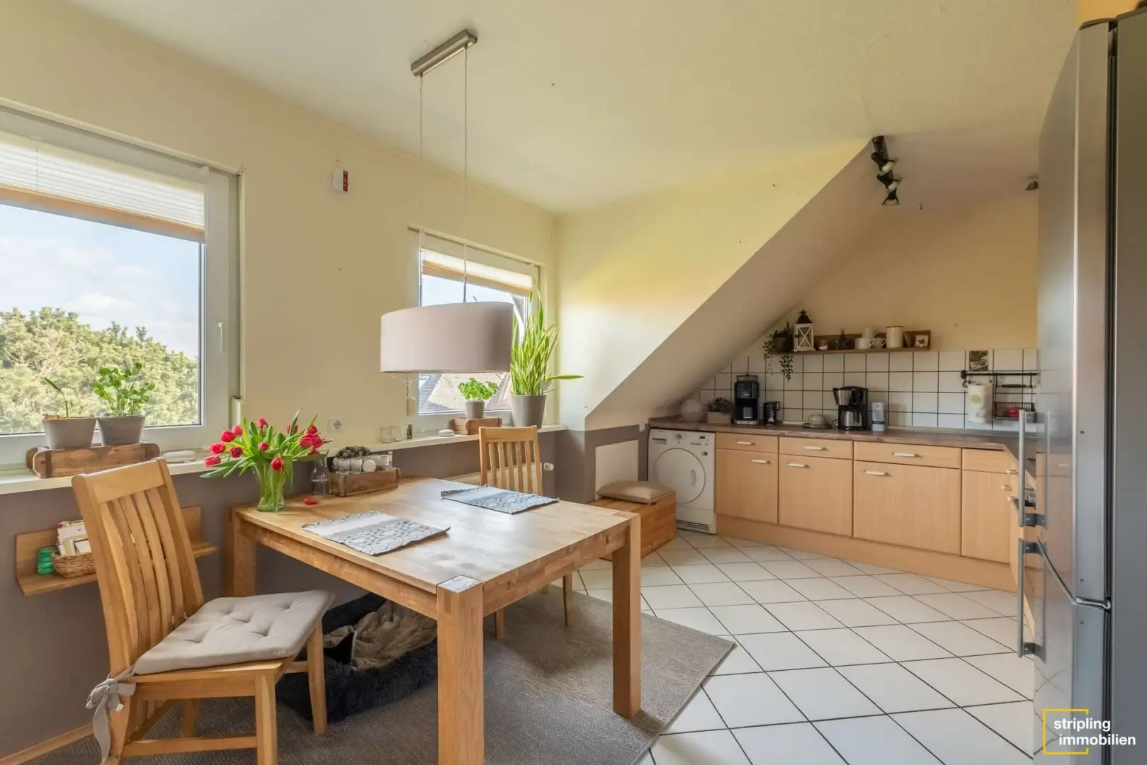 Das Badezimmer mit dem weißen Fliesenspiegel erhält Licht über ein Dachflächenfenster. Sie können es besonders genießen, wenn Sie abends in der Wanne den Sternenhimmel bewundern. Ihren Lebensmittelpunkt verlegen Sie in Zukunft vielleicht in das stilvolle Wohnzimmer. Ein Boden in Holzoptik verleiht dem Raum Atmosphäre und der Kaminofen sorgt für gemütliche Winterabende. Ein ausgefallenes Zierelement ist das schmiedeeiserne Fenster zum Flur, das der Wohnung ein offenes Flair verschafft. Daneben liegt die geräumige Küche, die bereits stilvolle Einbaumöbel und alle wichtigen Geräte beherbergt – ein Kühl-Gefrier-Kombigerät inklusive.