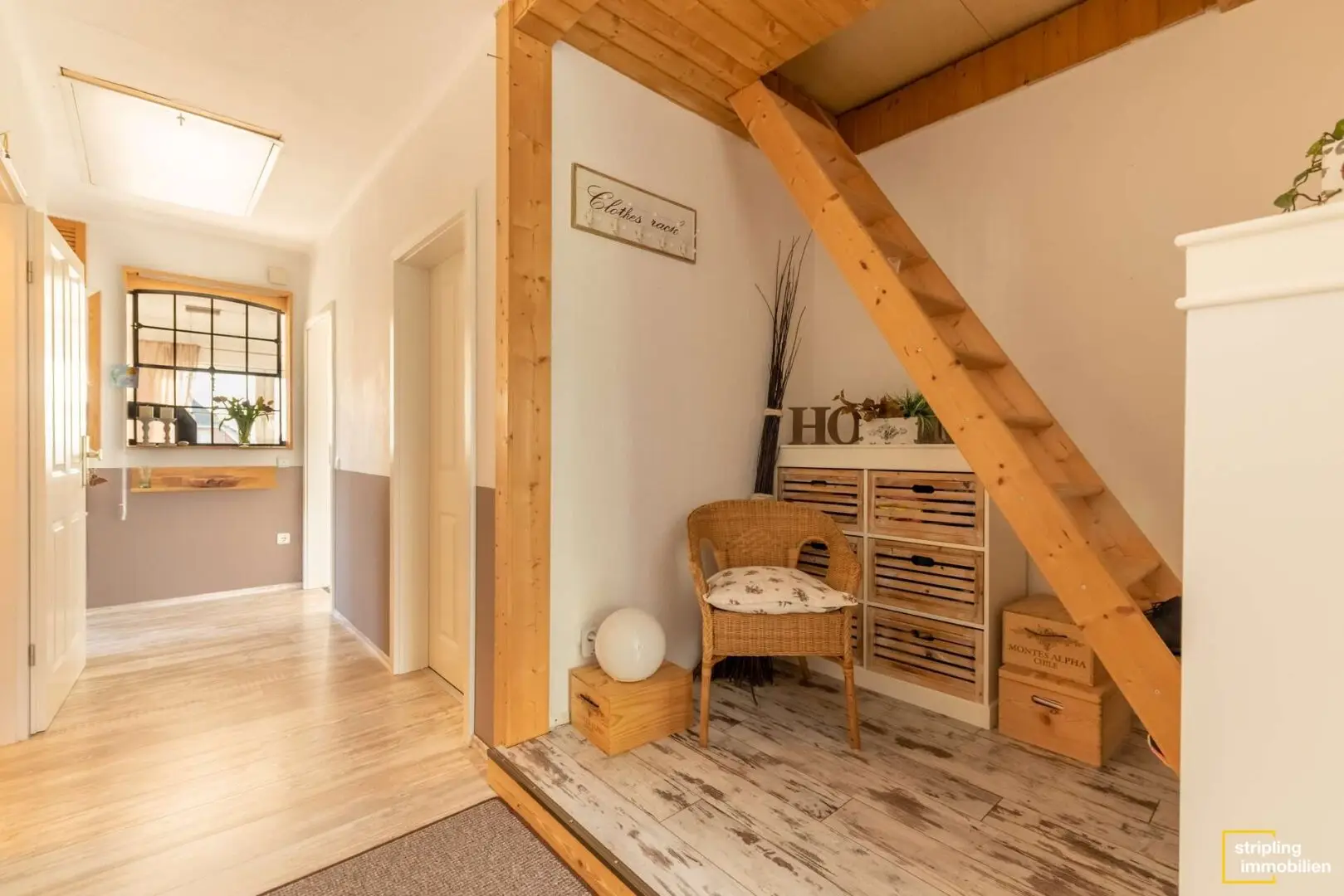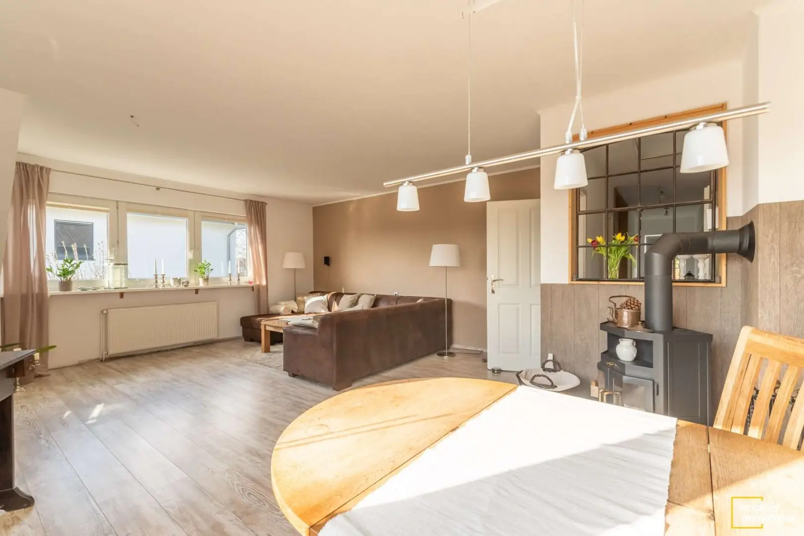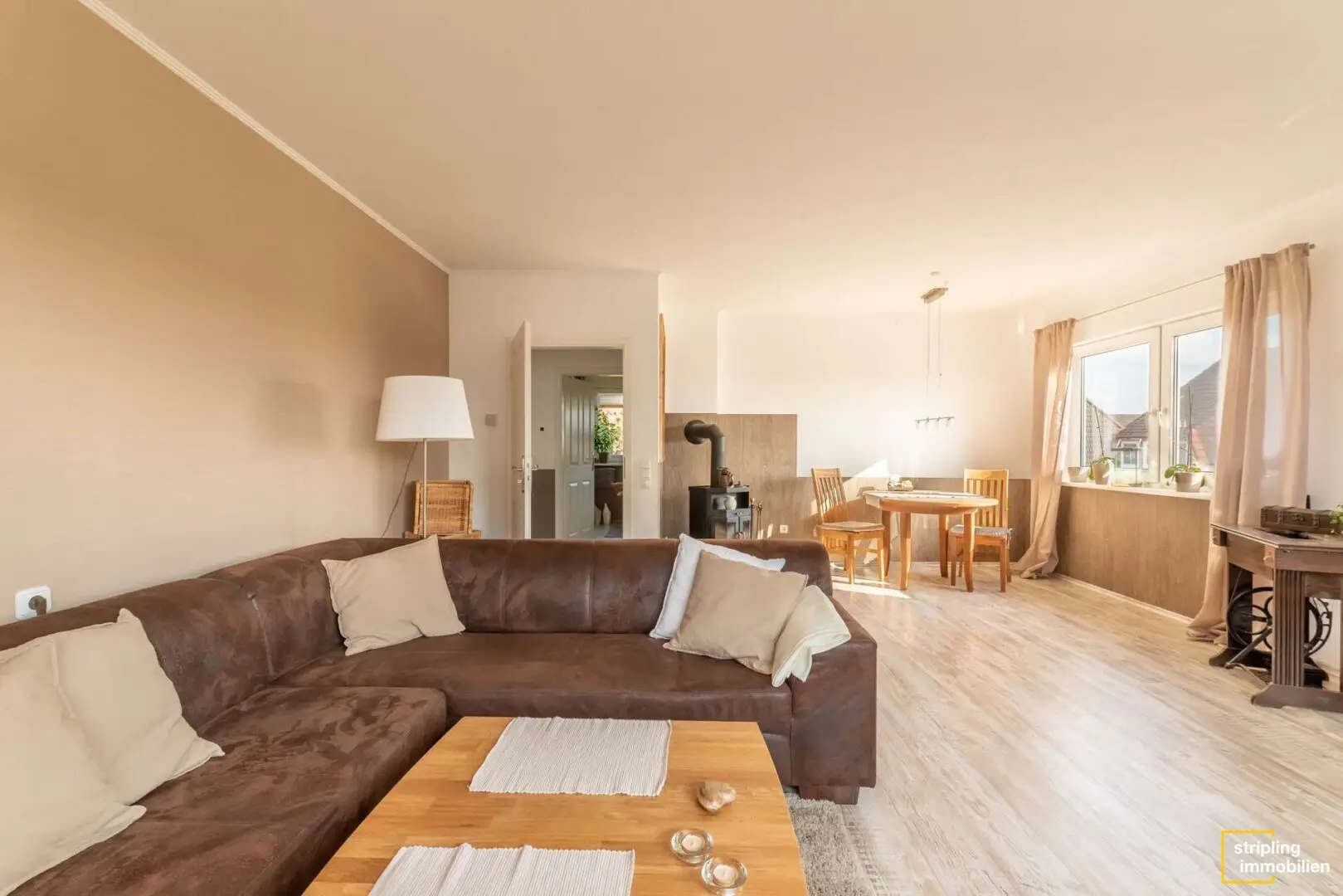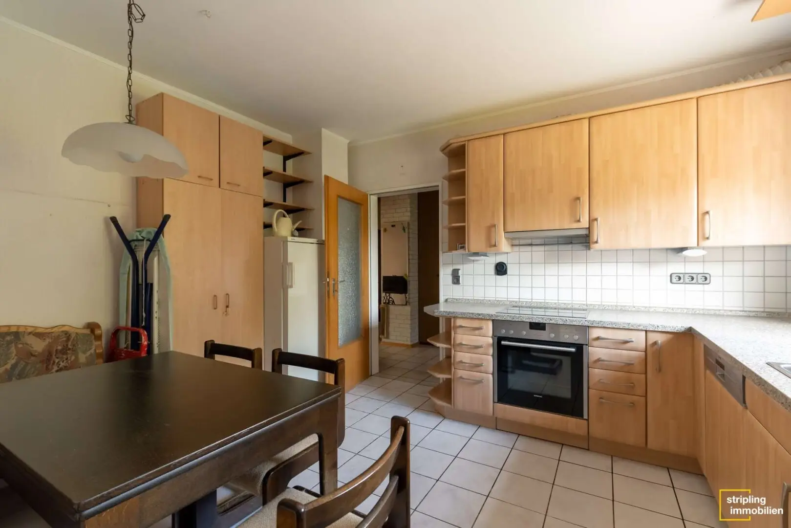 Das Badezimmer mit dem weißen Fliesenspiegel erhält Licht über ein Dachflächenfenster. Sie können es besonders genießen, wenn Sie abends in der Wanne den Sternenhimmel bewundern. Ihren Lebensmittelpunkt verlegen Sie in Zukunft vielleicht in das stilvolle Wohnzimmer. Ein Boden in Holzoptik verleiht dem Raum Atmosphäre und der Kaminofen sorgt für gemütliche Winterabende. Ein ausgefallenes Zierelement ist das schmiedeeiserne Fenster zum Flur, das der Wohnung ein offenes Flair verschafft. Daneben liegt die geräumige Küche, die bereits stilvolle Einbaumöbel und alle wichtigen Geräte beherbergt – ein Kühl-Gefrier-Kombigerät inklusive.