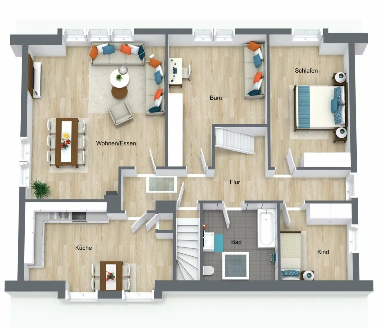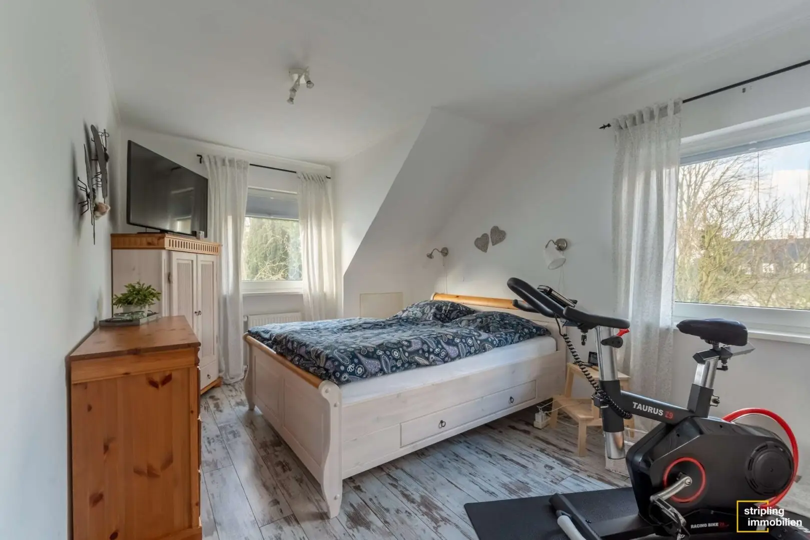 Über ein gemeinsames Treppenhaus betreten Sie die zweite Wohnung im Dachgeschoss. Zwei enorme Gauben ziehen sich über einen Großteil der Hauslänge und sorgen für ausreichend Raumhöhe. Trotzdem bleibt das Ambiente einer Dachgeschosswohnung durch die gemütlichen Schrägen bestehen. Drei Räume stehen auch hier als Schlaf- und Kinderzimmer oder fürs Homeoffice und Hobbys zur Verfügung. Hell und freundlich, mit modernem Fußboden und schicken weißen Zimmertüren sind sie für Ihren Einzug bereit. Ist Ihnen im Flur die zusätzliche Treppe aufgefallen? Sie ist Ihr Zugang zum 15 m² Spitzboden, in dem Sie alles unterstellen, was Sie nicht jeden Tag benötigen.